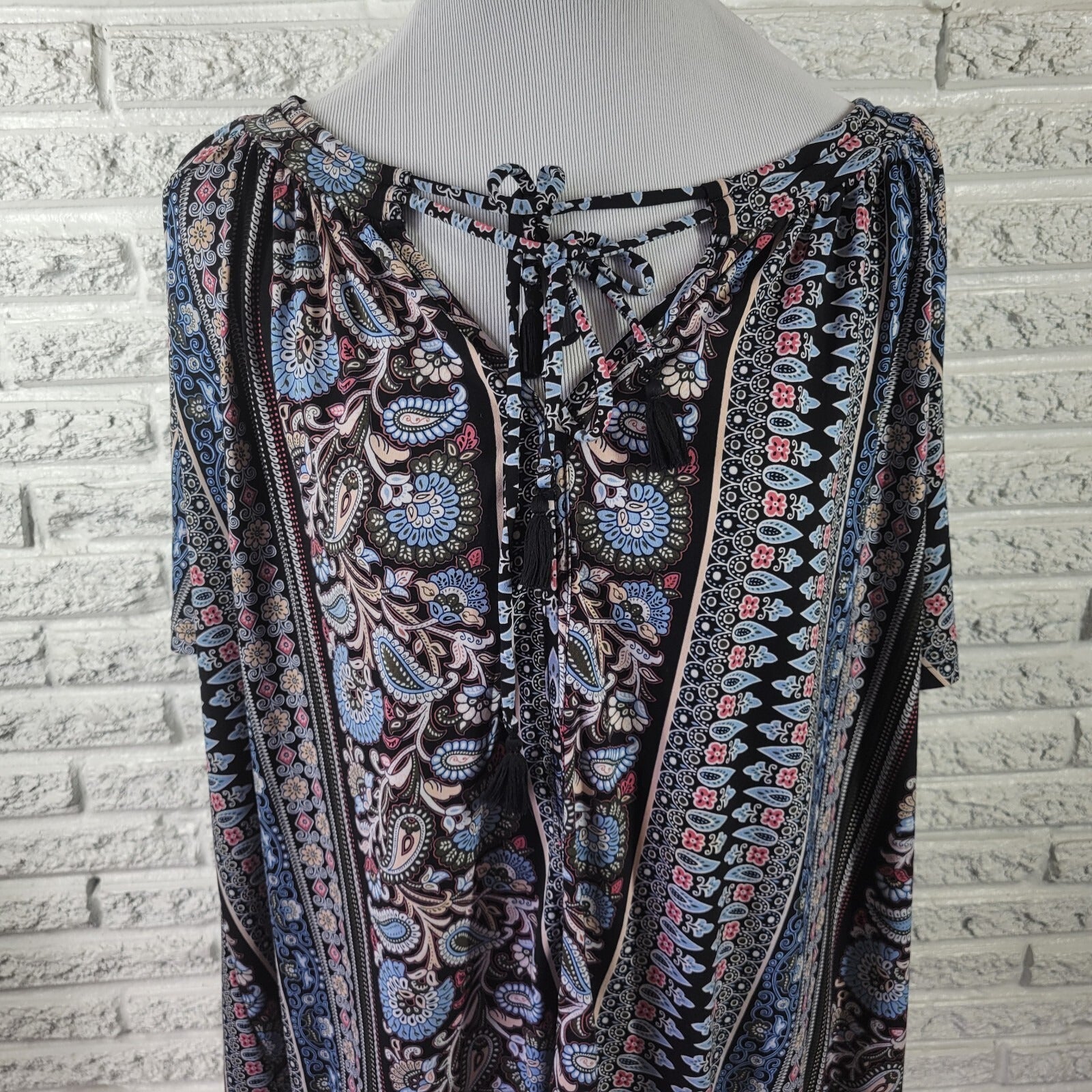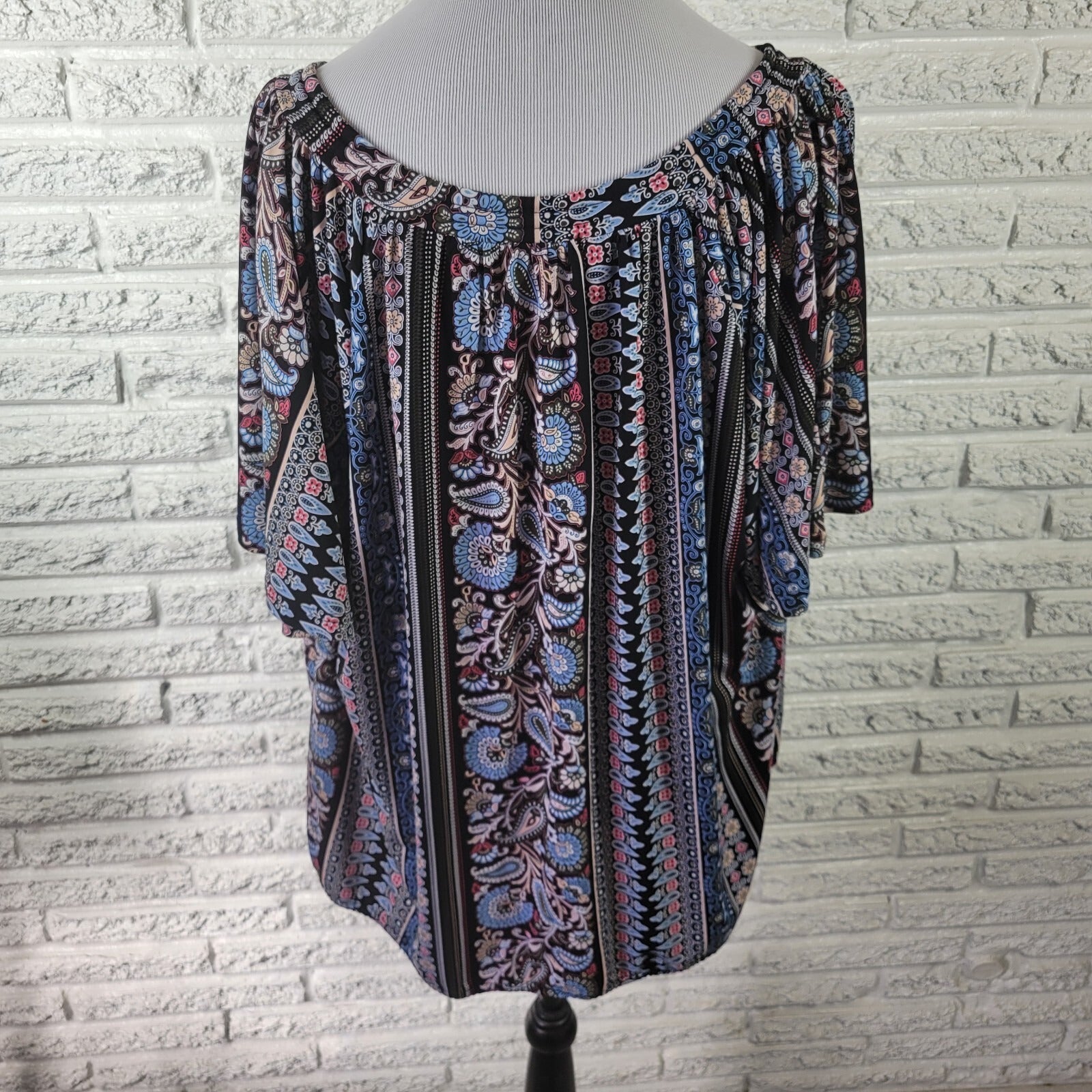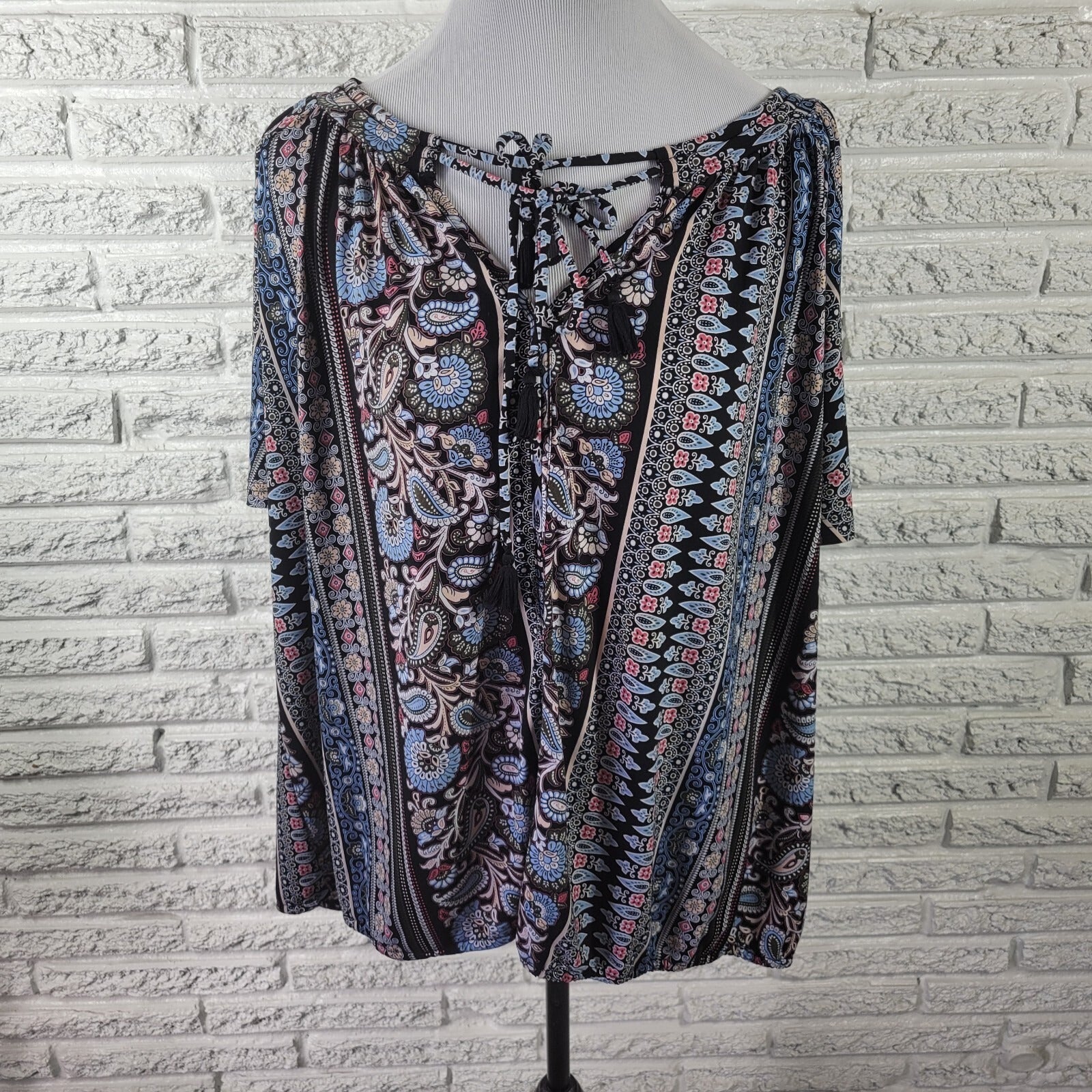 Liz Claiborne Womens Top 2X Plus Short Sleeve Blue Paisley Keyhole Poly Blend