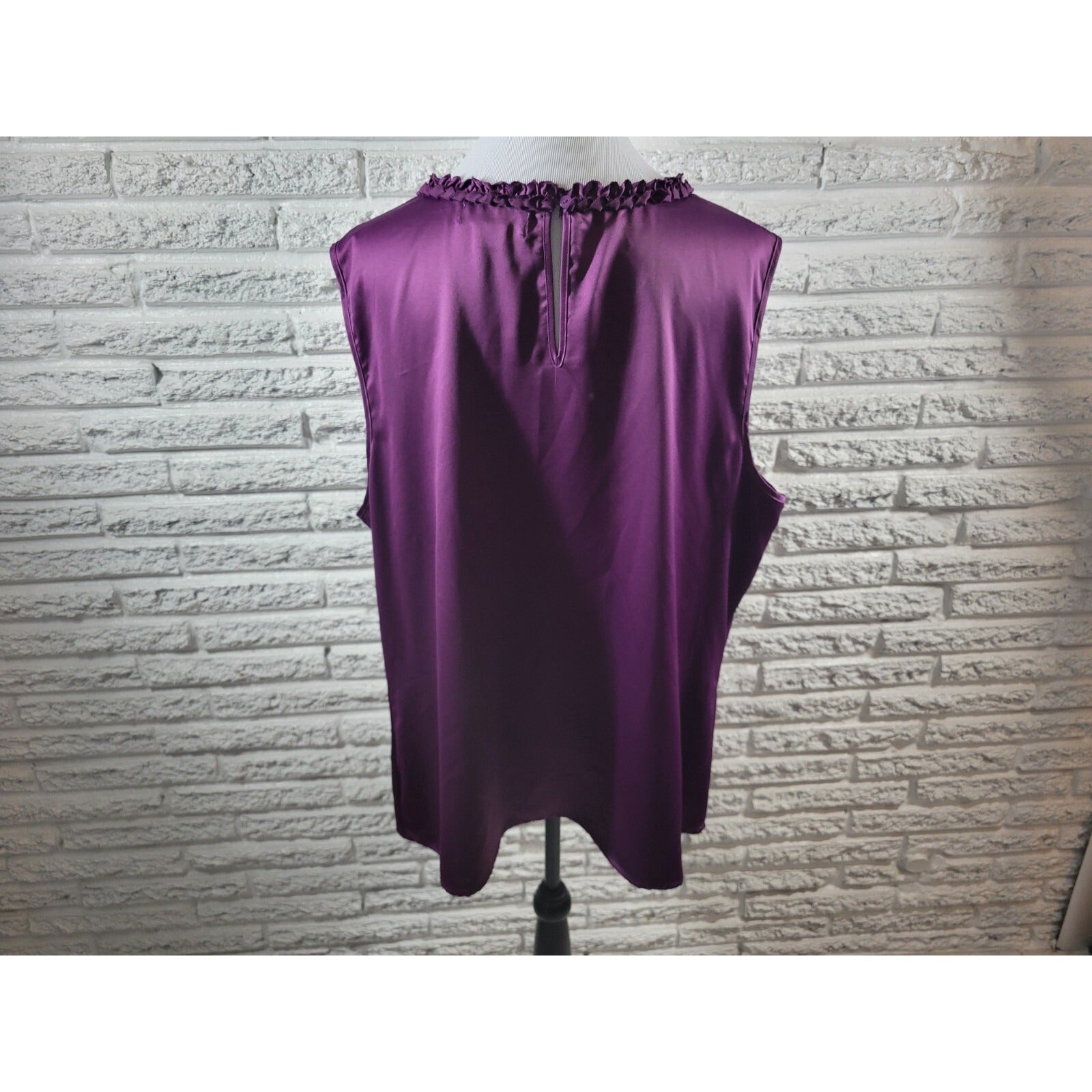 This Liz Claiborne women's top in size 3X features a sleeveless design with a button closure. The purple color is complemented by a stylish ruffle accent and a keyhole detail. Made of polyester material, this top is perfect for both casual and business occasions. The solid pattern and regular fit make it a versatile addition to any wardrobe. It is suitable for all seasons including winter, summer, fall, and spring.