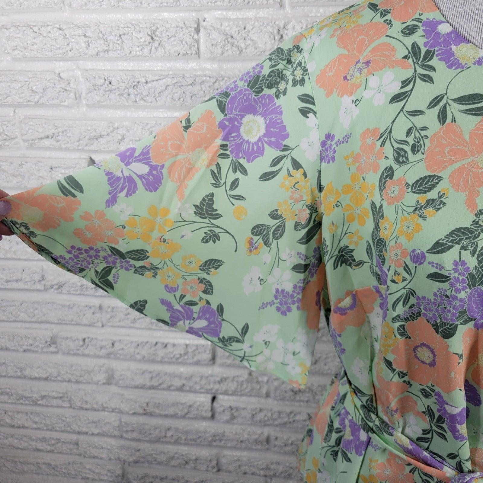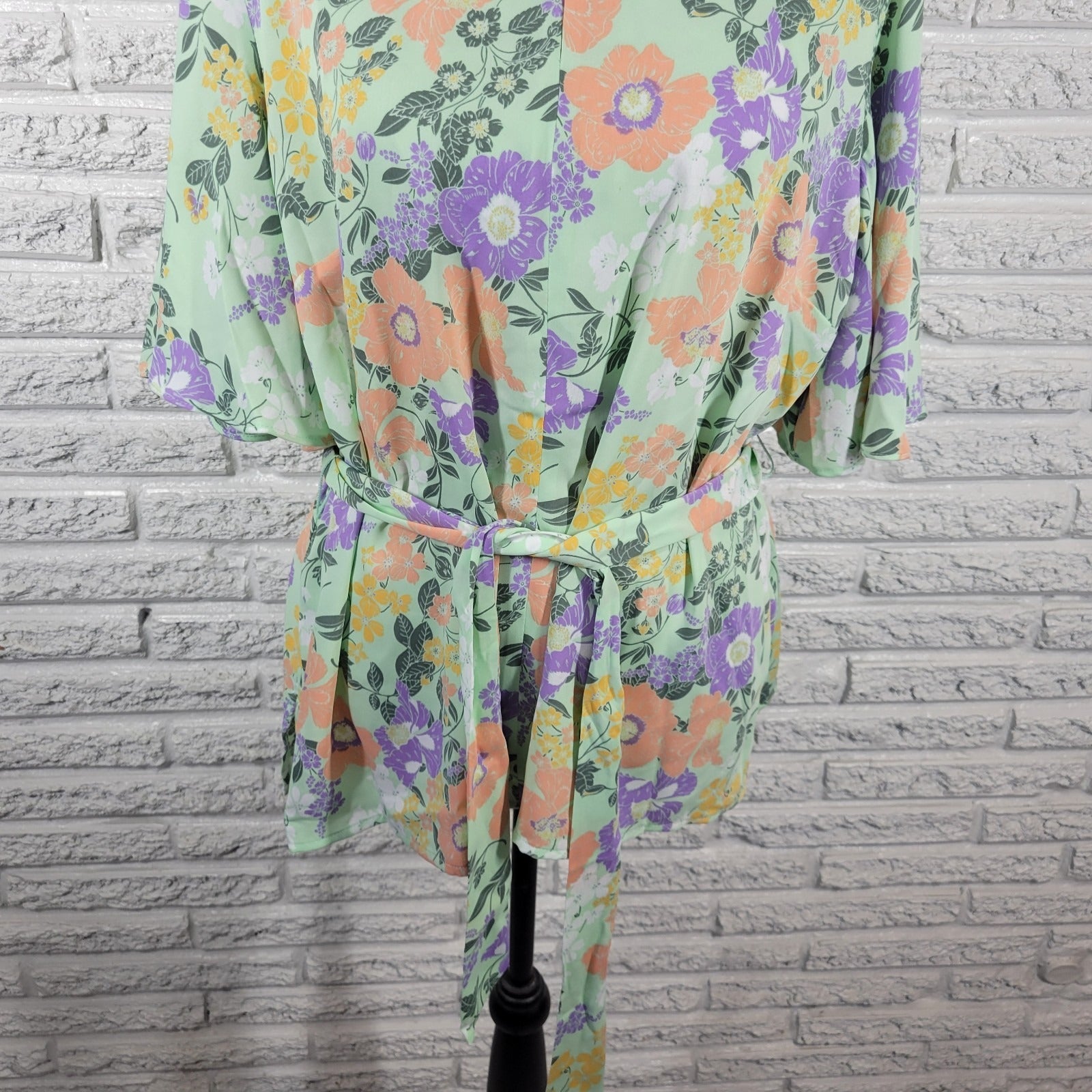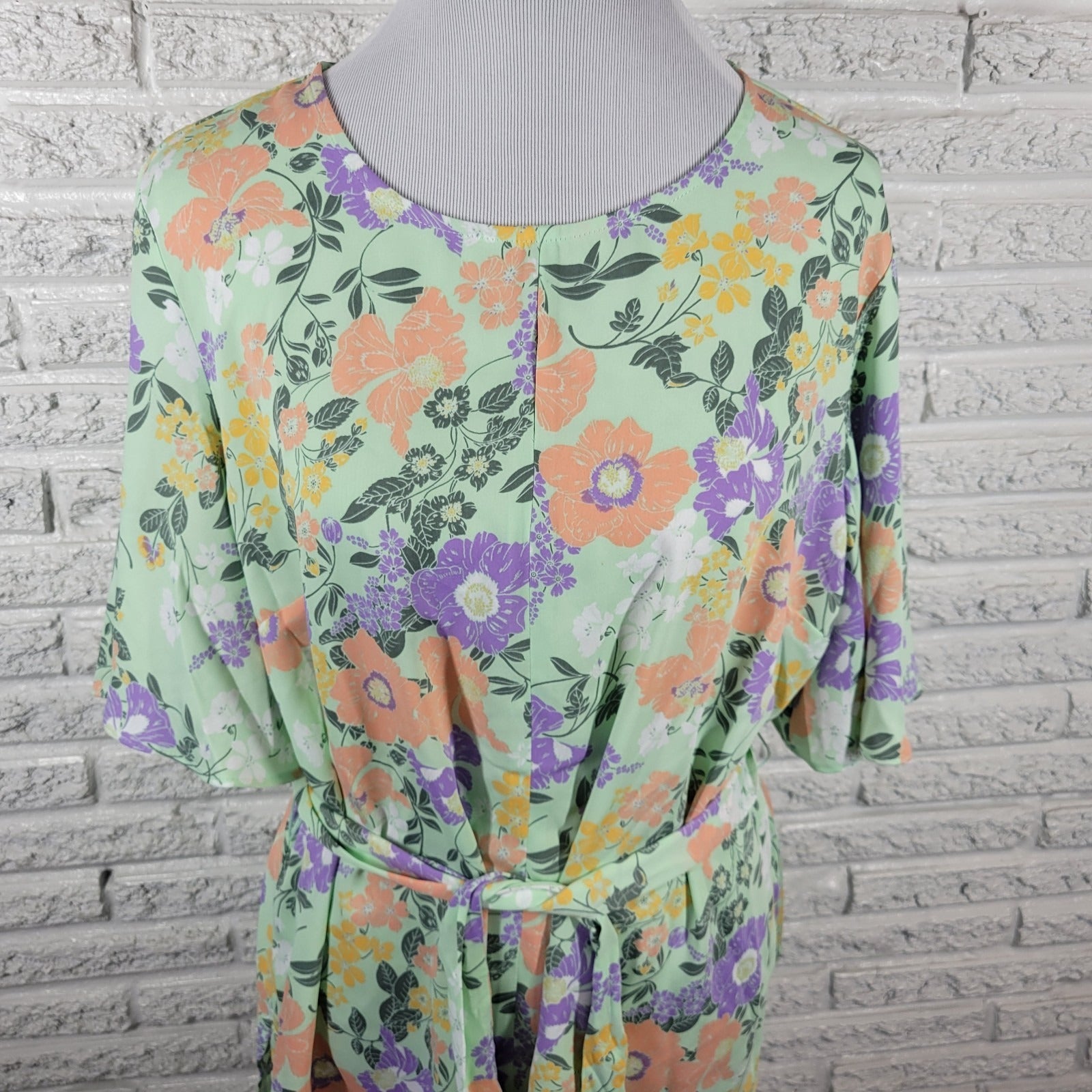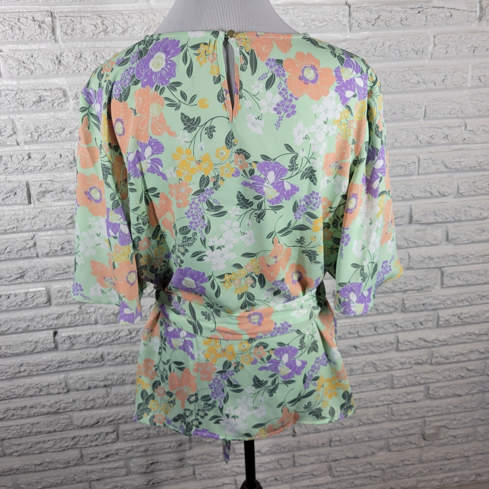 Liz Claiborne Womens Top XL Flared Sleeve Green Pink Floral Back Keyhole Sash