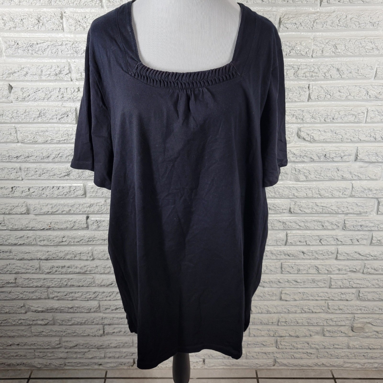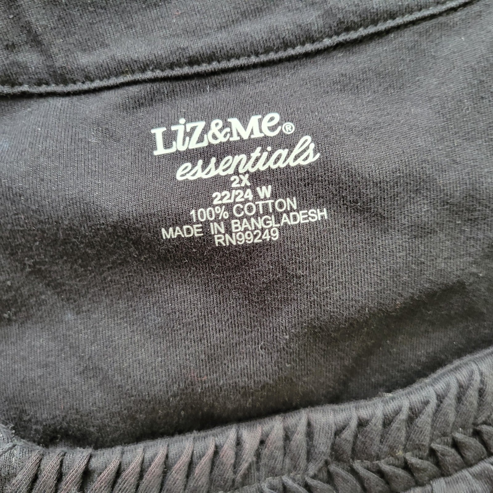 The Liz Me Women Top in size 2X is a comfortable and casual black cotton blouse with a square neckline and short sleeves. It features a pintucked design, making it perfect for travel or everyday wear. Made from 100% cotton, this pullover top offers a regular fit and stretch for added comfort. With a solid pattern and basic style, this top is suitable for all seasons and can be easily machine washed for care. Perfect for any wardrobe, this Liz & Me blouse is a versatile and stylish addition for women looking for a classic and timeless top.