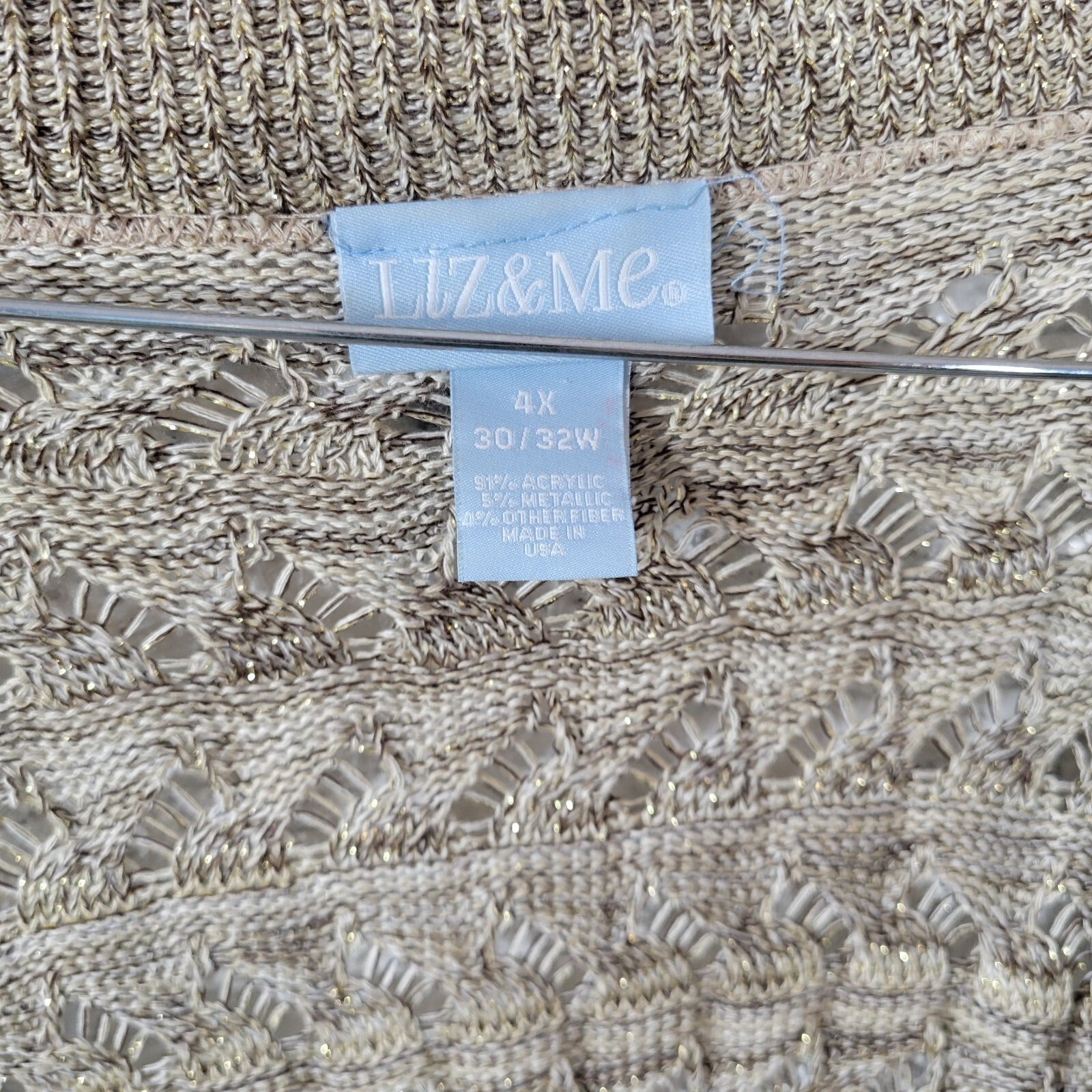 Add a touch of glam to your wardrobe with this stunning Liz & Me sweater. The gold and tan metallic thread acrylic knit is perfect for any occasion, from casual to business and even parties. The open-knit style and short sleeves provide a comfortable fit for all seasons, while the stretch feature ensures a perfect fit for plus size. This sweater is machine washable and easy to care for. With its solid pattern and regular fit, this cardigan is a perfect addition to any women's wardrobe.