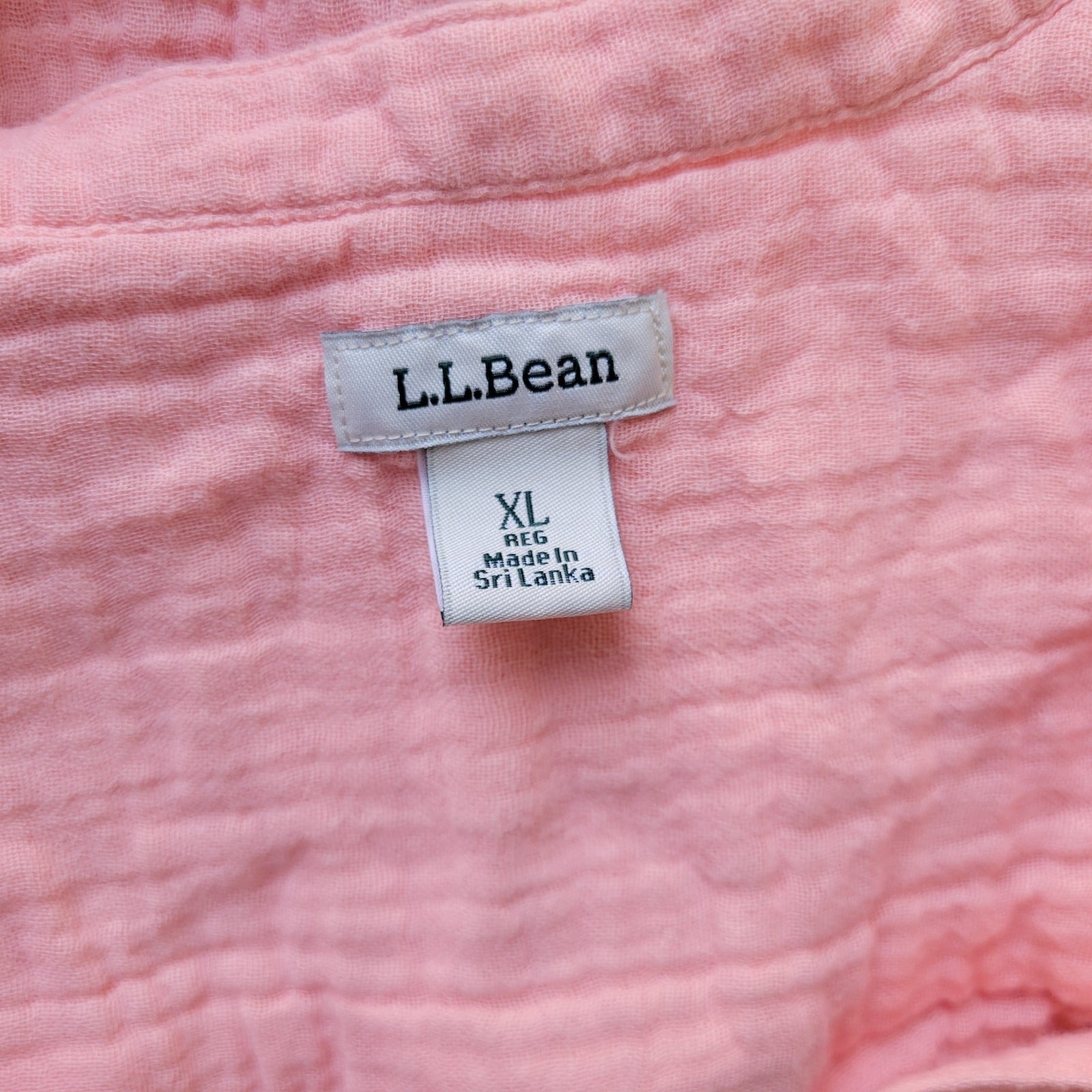 The LL Bean Women's Top in XL is a pink cotton cloud gauze top with a V-neckline and short casual sleeves. It is a lightweight pullover top suitable for travel and casual occasions. Machine washable and made from 100% cotton, this top is comfortable and versatile for all seasons including winter, summer, fall, and spring. In a solid pattern, this basic top from L.L. Bean offers a regular fit and features a slit detail, making it a stylish and practical addition to any woman's wardrobe.