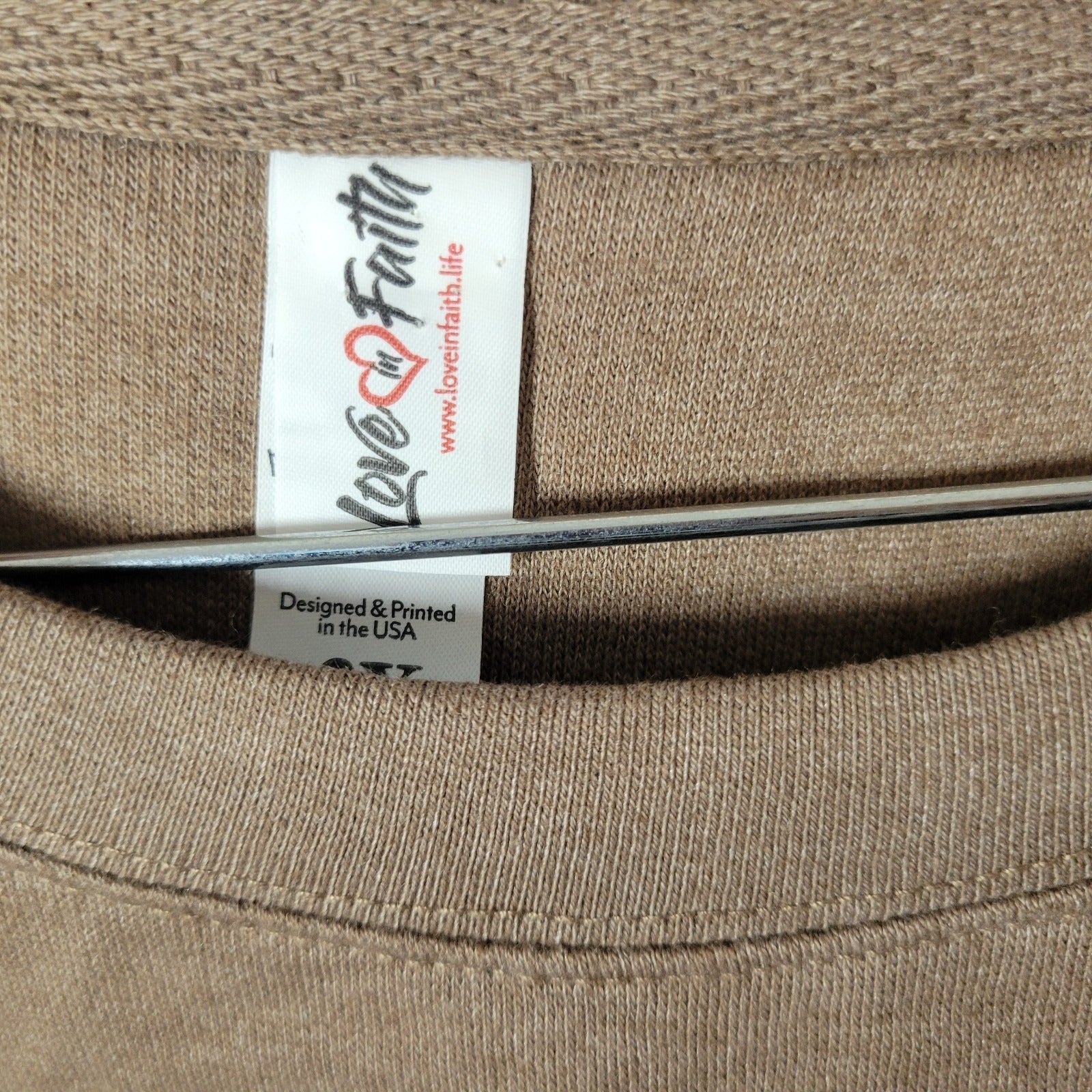 The Love in Faith Women's Sweatshirt in 3X Plus size is a cozy and comfortable brown pullover with a crew neck and long sleeves. Made from a soft cotton blend material, this oversized sweatshirt is perfect for travel, casual wear, or activewear. It features a solid pattern, stretch for ease of movement, and is machine washable for easy care. This sweatshirt is versatile for all seasons and can be styled in various ways for different occasions, making it a versatile and stylish addition to any woman's wardrobe.