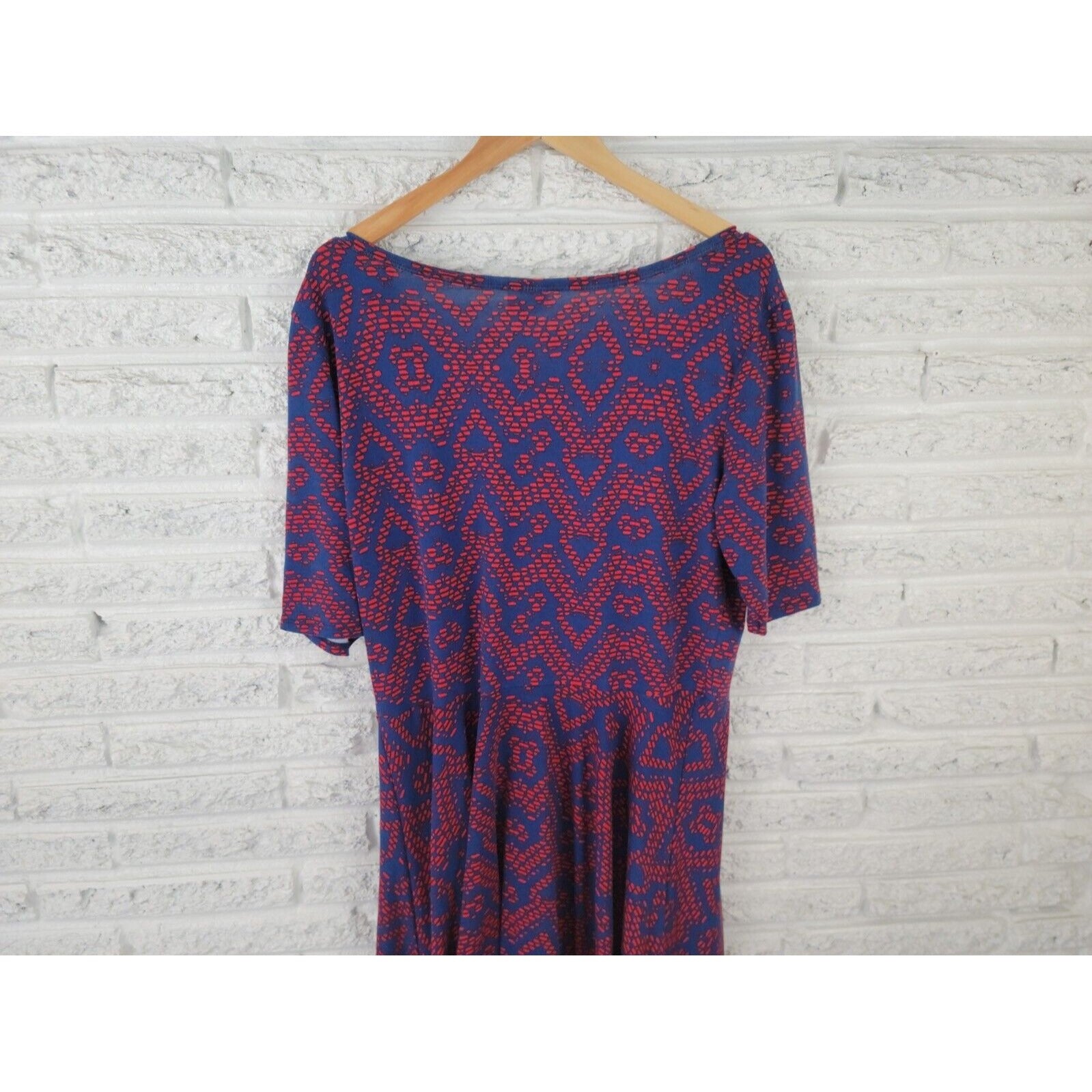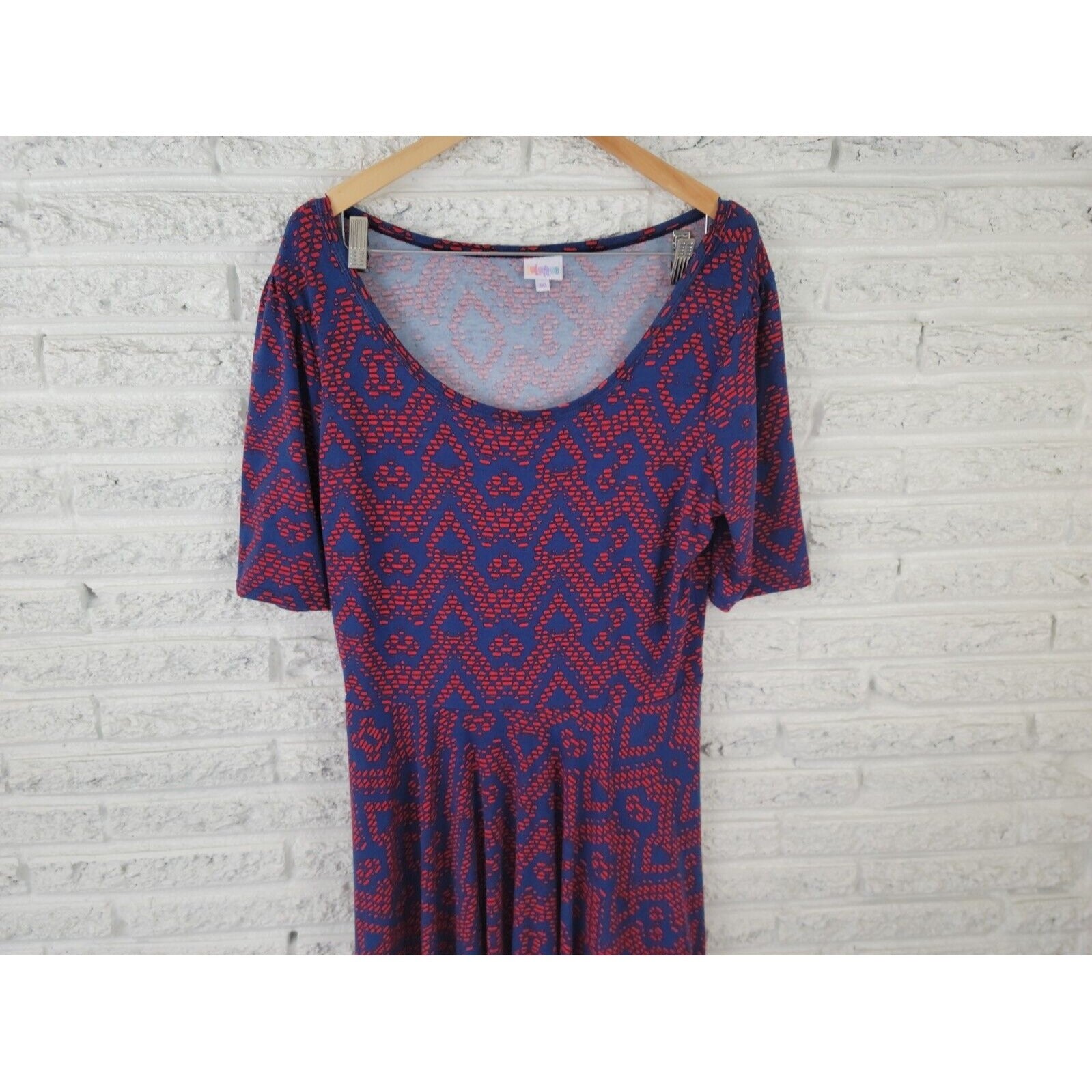 This beautiful LuLaRoe shirt dress is perfect for any casual occasion. The dress features a stunning geometric pattern in red/blue, making it a great addition to your wardrobe. The short sleeve and boat neck design provide a comfortable fit, while the pullover closure makes it easy to wear. The knee-length dress is made of a polyester blend material that is machine washable and has stretch features. It is available in size 3XL and is perfect for plus-sized women. This dress is ideal for all seasons, including winter, summer, fall, and spring. Made in Mexico, this dress is a great representation of the brand's quality.