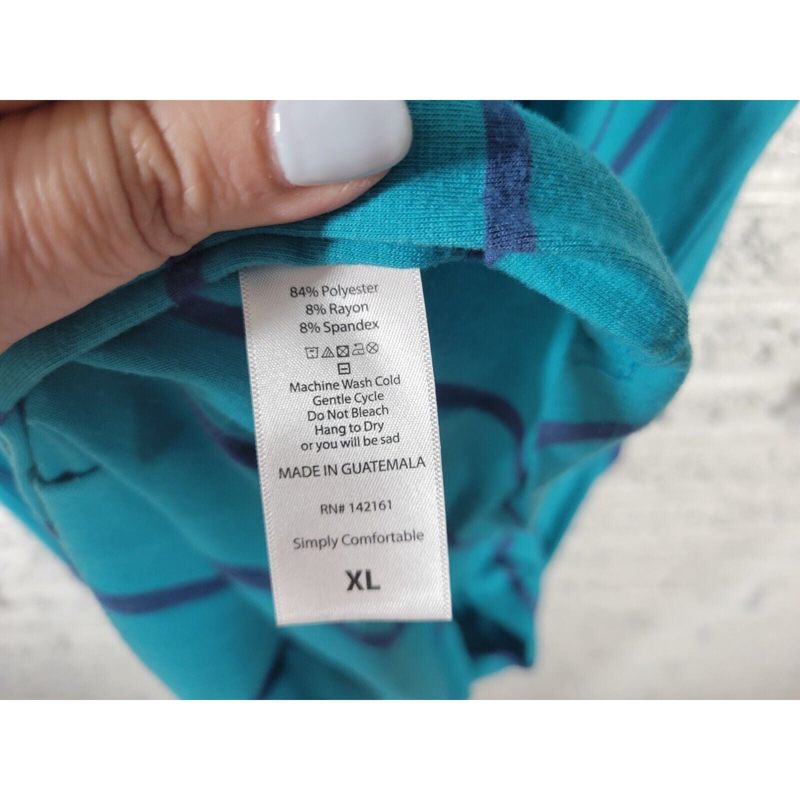 This LuLaRoe women's dress in size XL is a trendy addition to your wardrobe. The dress features an asymmetric blue stripe pattern, round neckline, short sleeves, and a pullover closure. It is perfect for casual occasions and can be worn during any season, be it winter, summer, fall, or spring. The knee-length dress is made of a comfortable polyester blend material that stretches to fit you perfectly. It also has one pocket for convenience. The dress is machine washable and made in Guatemala.