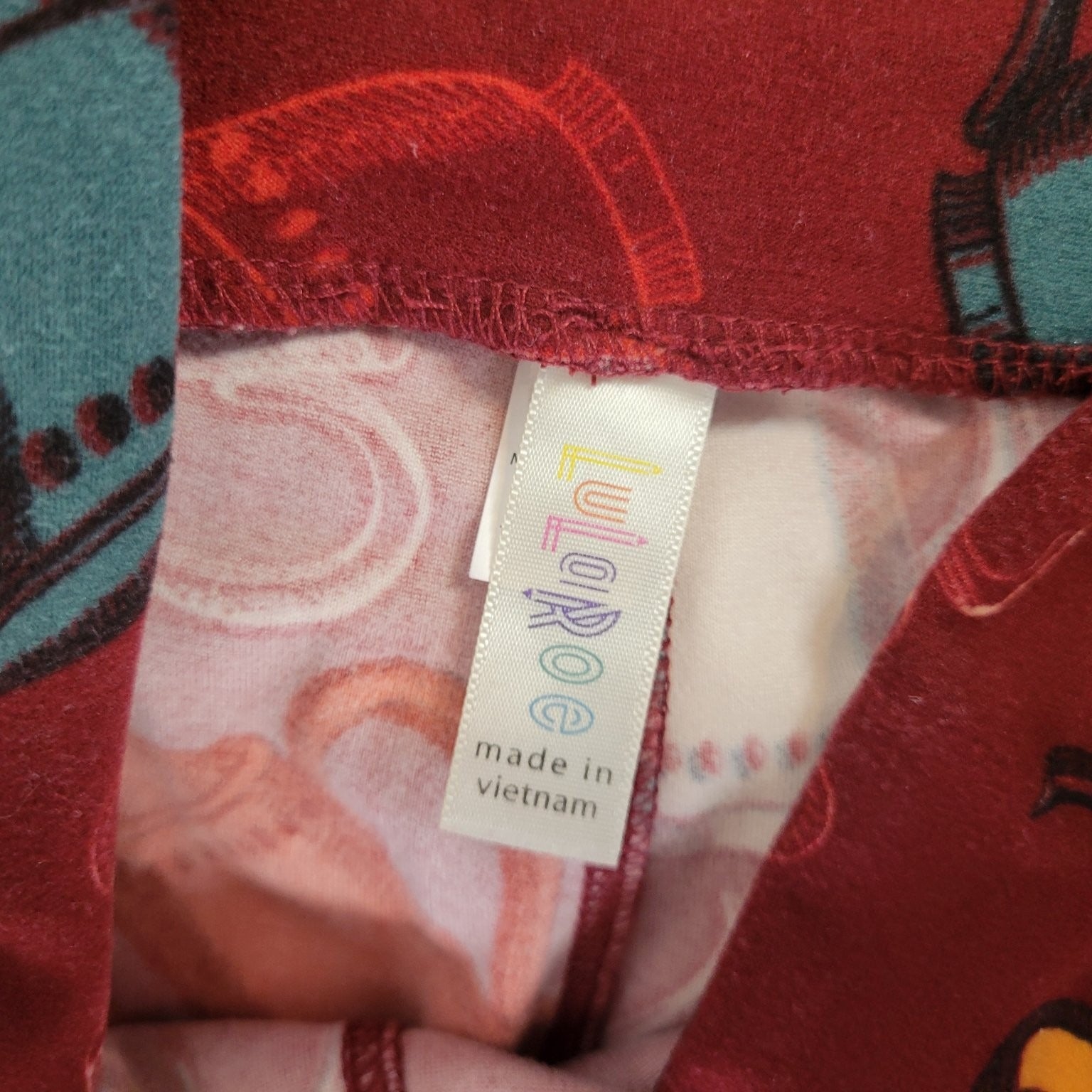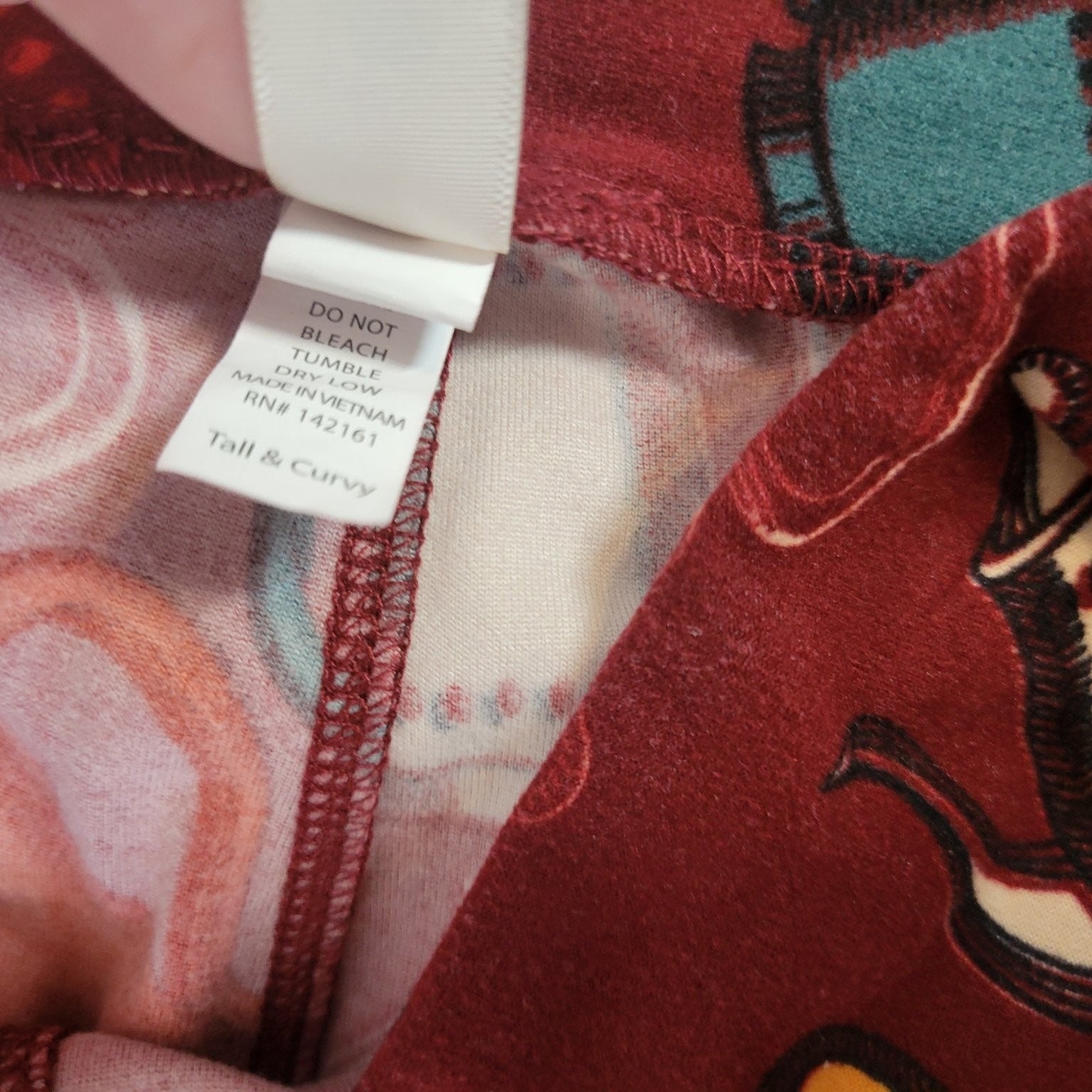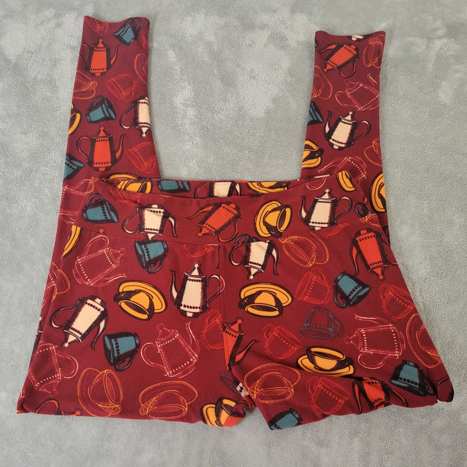 LuLaRoe Womens Leggings Tall Curvy Burgundy Red Coffee Pots Print Workout Comfy