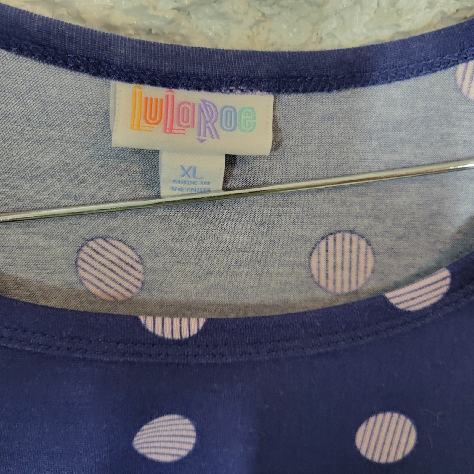 The product is a LuLaRoe women's dress in size XL, featuring a blue polka dot pattern, short sleeves, and a high-low hemline. Made from a polyester blend material, this casual pullover dress is machine washable and has a round neckline. With a T-shirt dress style and stretchy fabric, it is perfect for occasions like travel and everyday wear, suitable for all seasons. Designed by LuLaRoe, this dress is a versatile addition to any woman's wardrobe, offering both comfort and style.