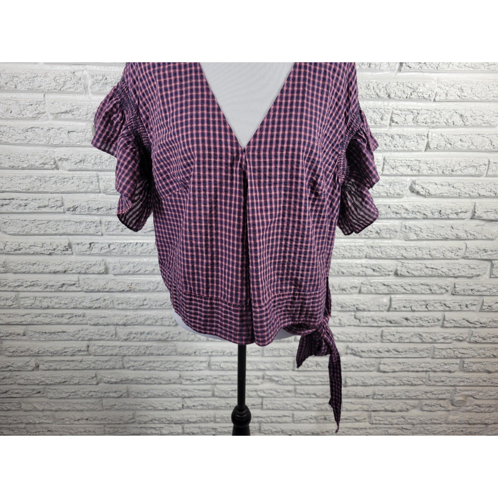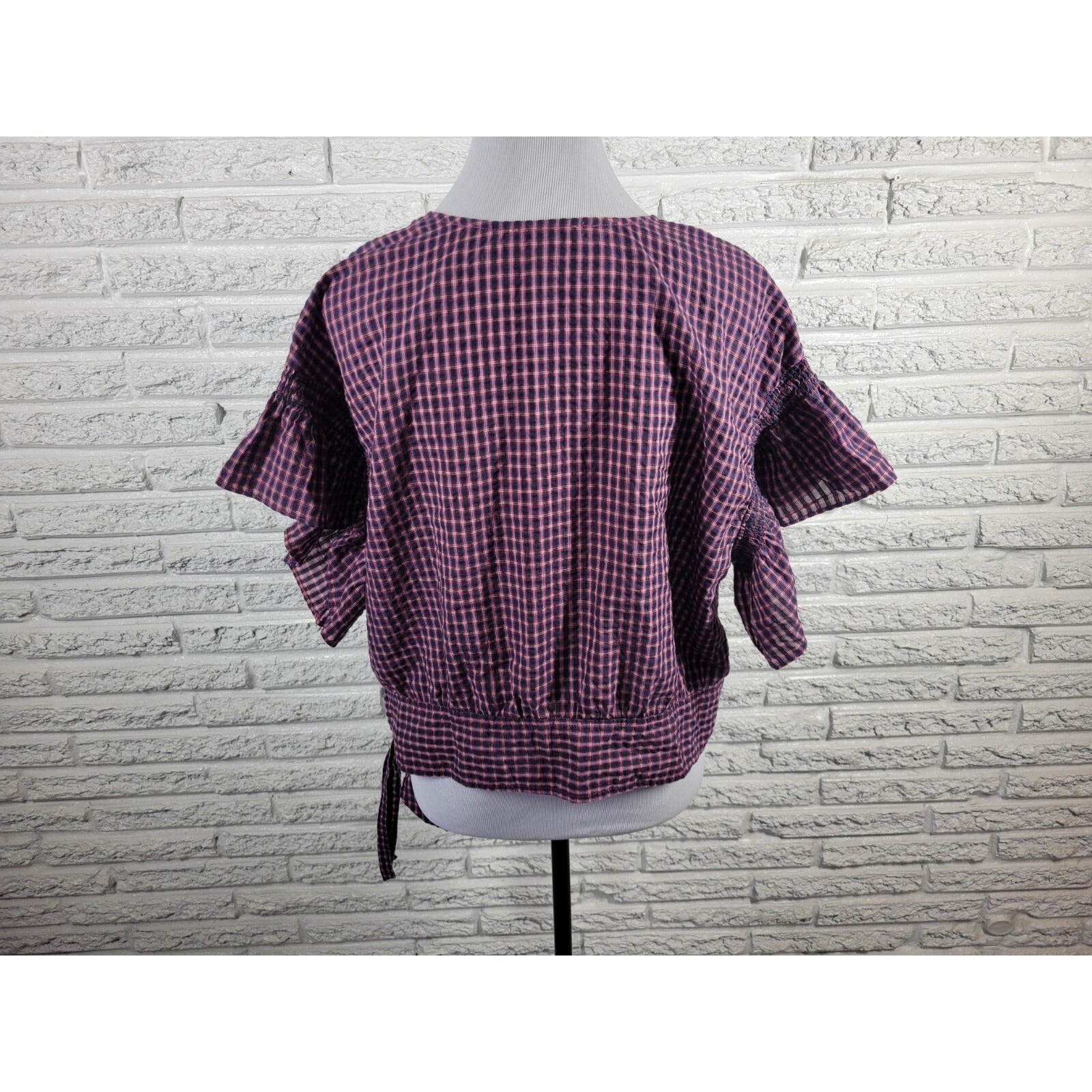 This is a Madewell women's top in size 1X. It features a blue plaid pattern, short sleeves, and a V-neckline with a pullover closure. The top is made of 100% cotton and has a woven fabric type. It has a casual sleeve type with ruffle accents and a tied hem. The top is lightweight and suitable for all seasons. It is a cropped style and has a regular fit. The garment care instructions recommend machine washing.