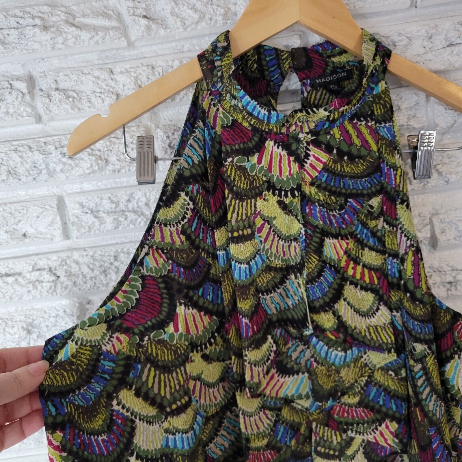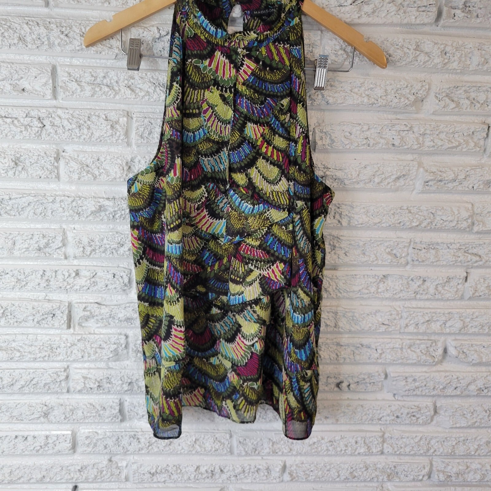 The Madison Women's Top in XL size is a versatile and stylish choice for any office or casual setting. This sleeveless green polyester button-up top is designed for comfort and breathability, perfect for year-round wear. The keyhole back and lightweight construction make it ideal for layering during all seasons. Made by the brand Madison, this top is sure to be a staple in any woman's wardrobe, offering a flattering fit and easy care with a hand wash only garment care instruction.