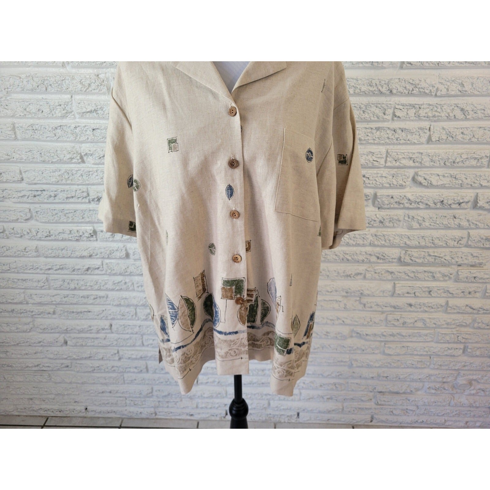 Maggie Barnes Womens Shirt 24WP Plus Short Sleeve Beige Abstract Linen Rayon