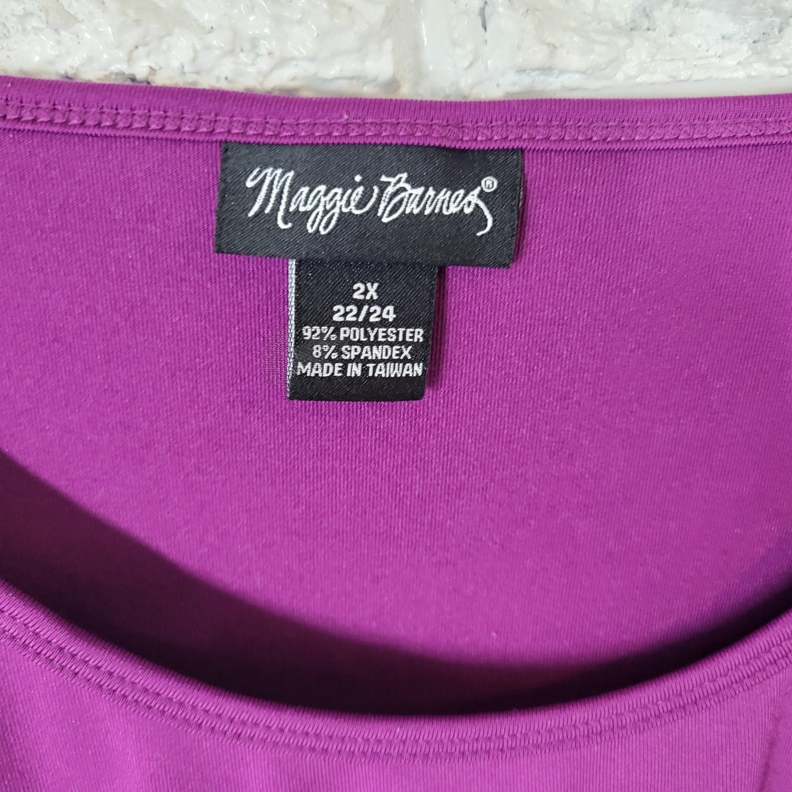 The product is a Maggie Barnes Women's Top in size 2X Plus, featuring a stylish camisole design in a solid purple color. It has adjustable spaghetti straps, a sleeveless style, and a round neck neckline. Made from a comfortable polyester blend material, this top is perfect for casual wear or travel, with a regular fit and stretch for added comfort. Easy to care for, this tank top is machine washable and suitable for all seasons, making it a versatile and fashionable addition to any woman's wardrobe.