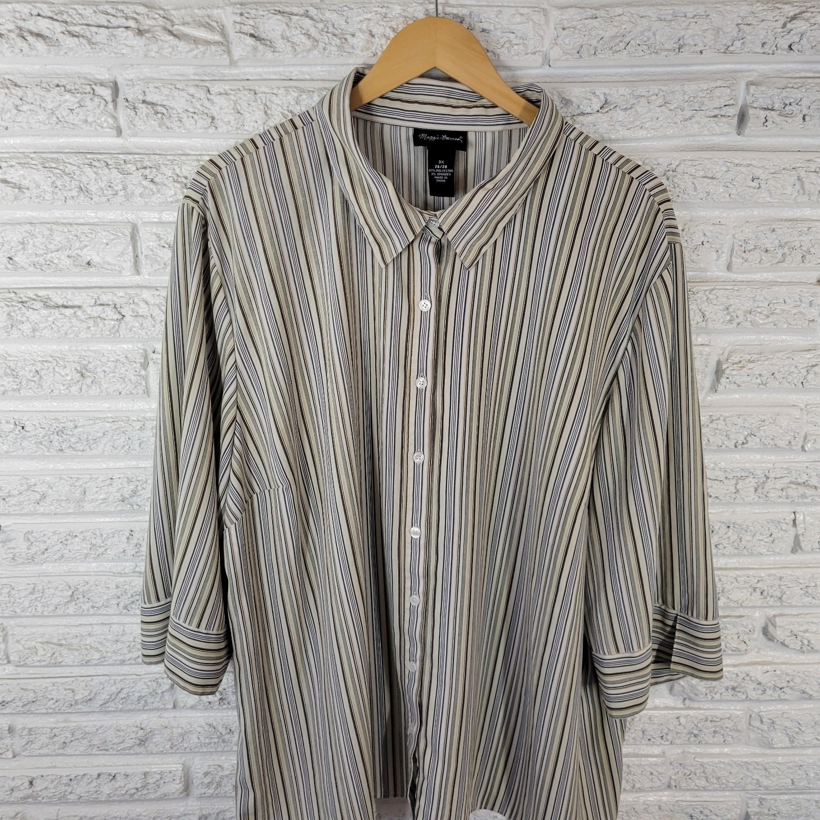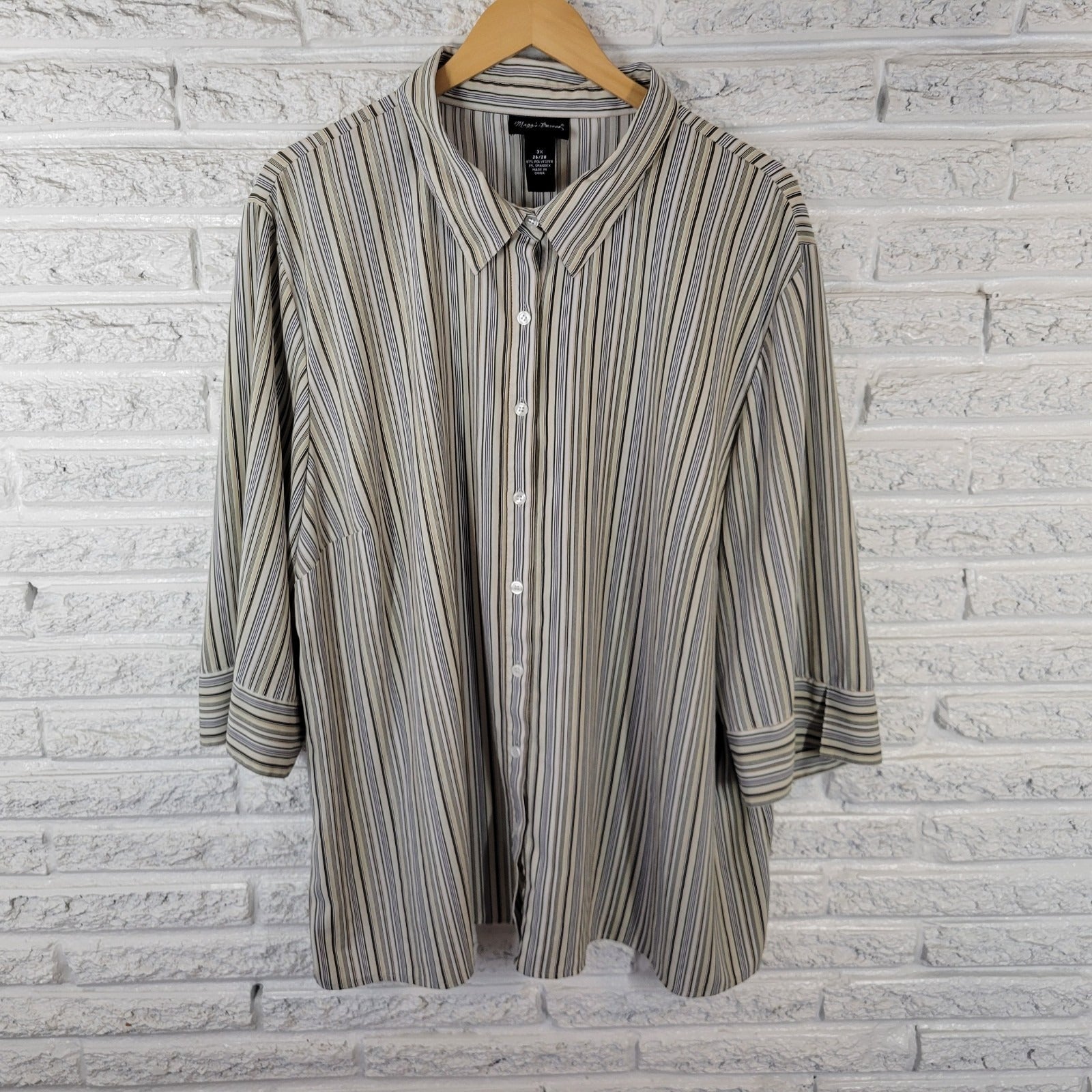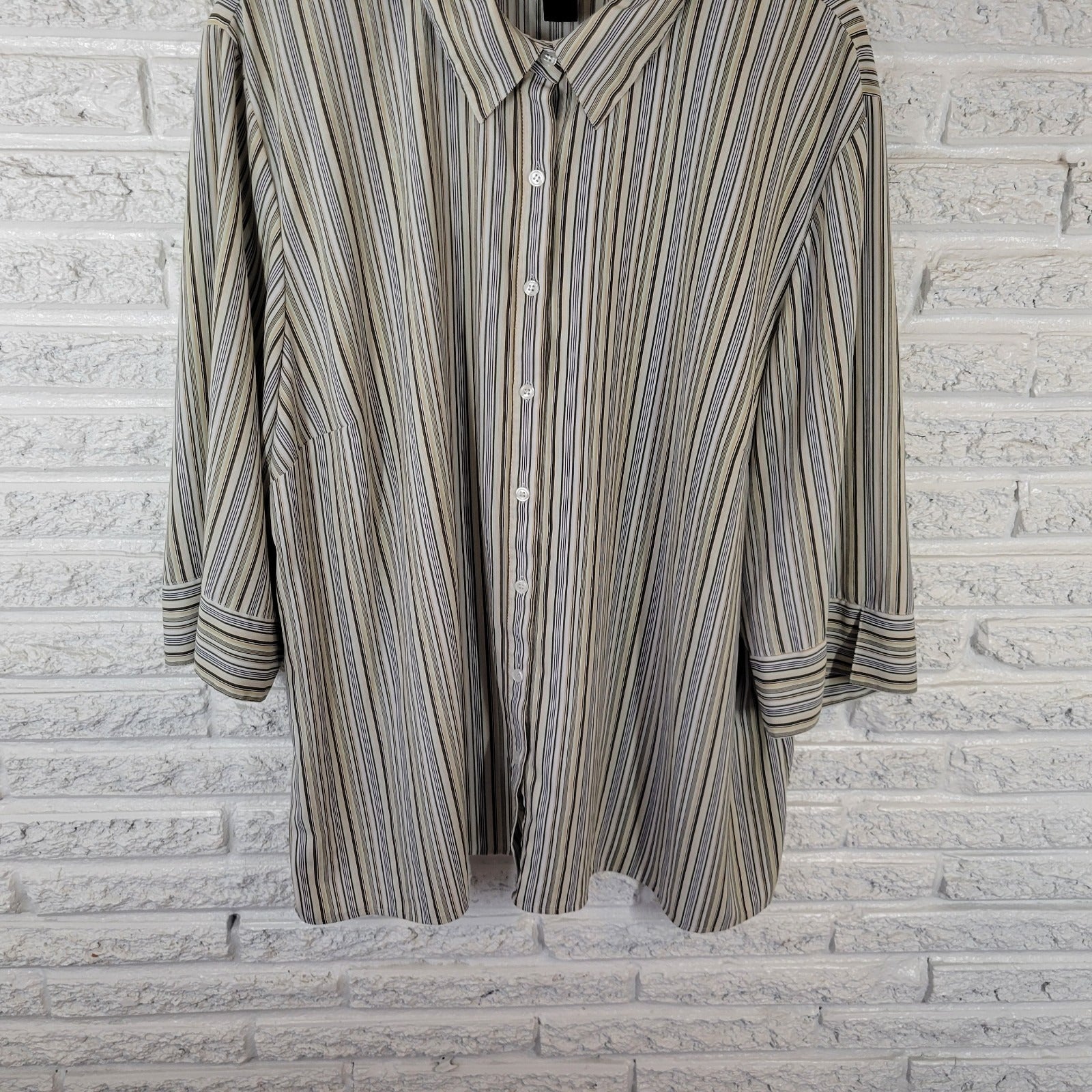 Maggie Barnes Womens Top 3X Plus 3/4 Slit Sleeve Button Green Striped Poly Blend