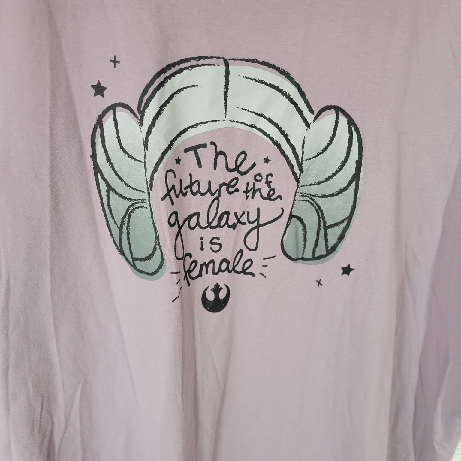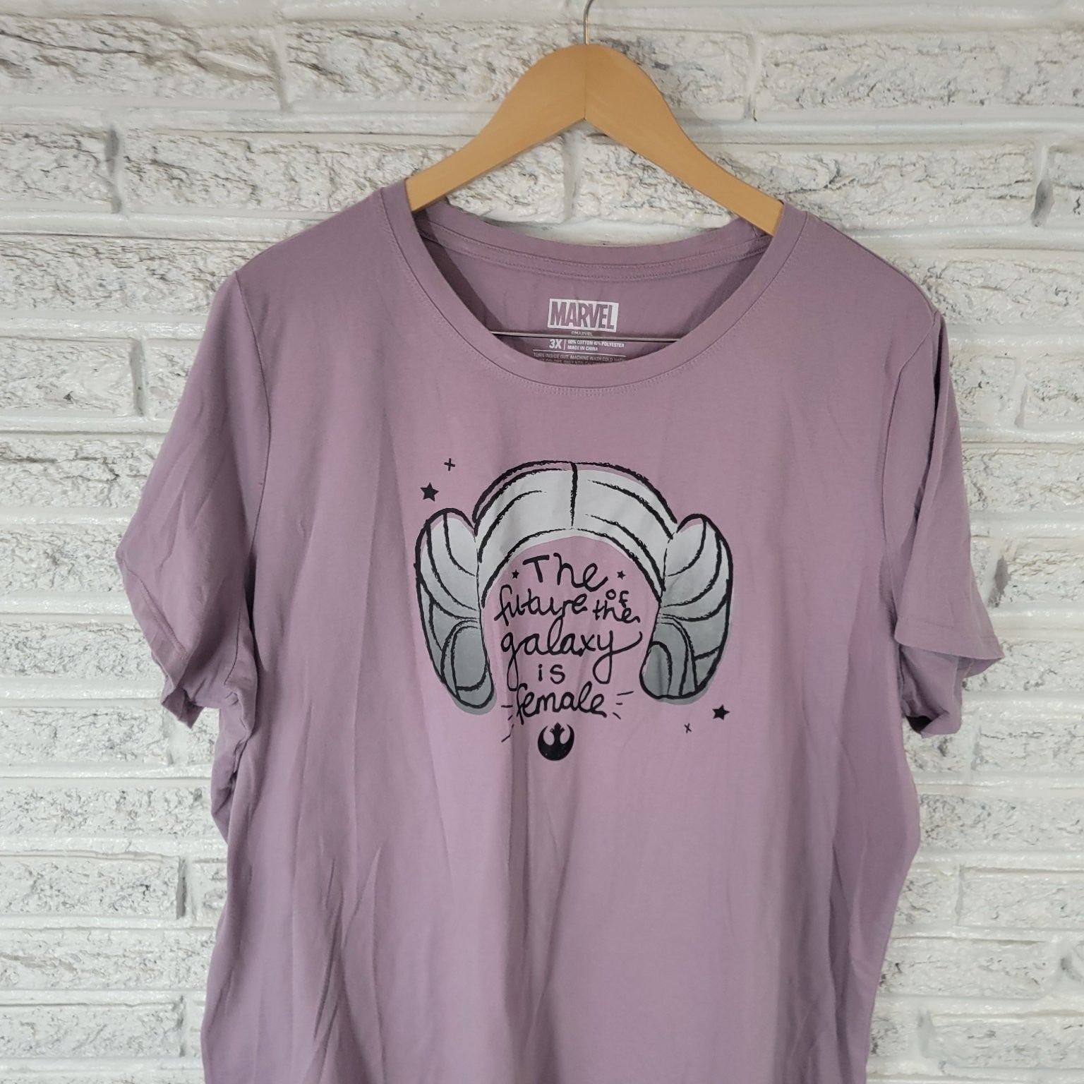 Showcase your fandom and style with this Marvel women's top featuring a bold Star Wars-inspired graphic. The lilac purple tee prominently displays the iconic Princess Leia hairstyle with the empowering phrase "The future of the galaxy is female" in a trendy handwritten font. This statement piece is perfect for fans who want to blend comfort with a meaningful message. Crafted from a soft, breathable cotton-polyester blend, this 3X size shirt offers a relaxed fit and all-day comfort. The crew neckline and short sleeves make it versatile for layering or wearing solo in warmer weather. Machine washable for easy care, this Marvel top is an excellent addition to casual wardrobes and pop culture collections alike.