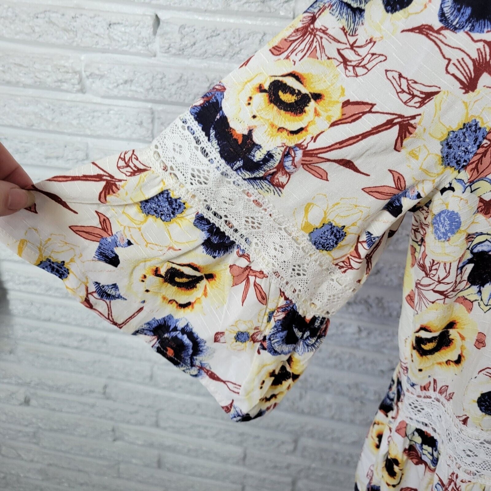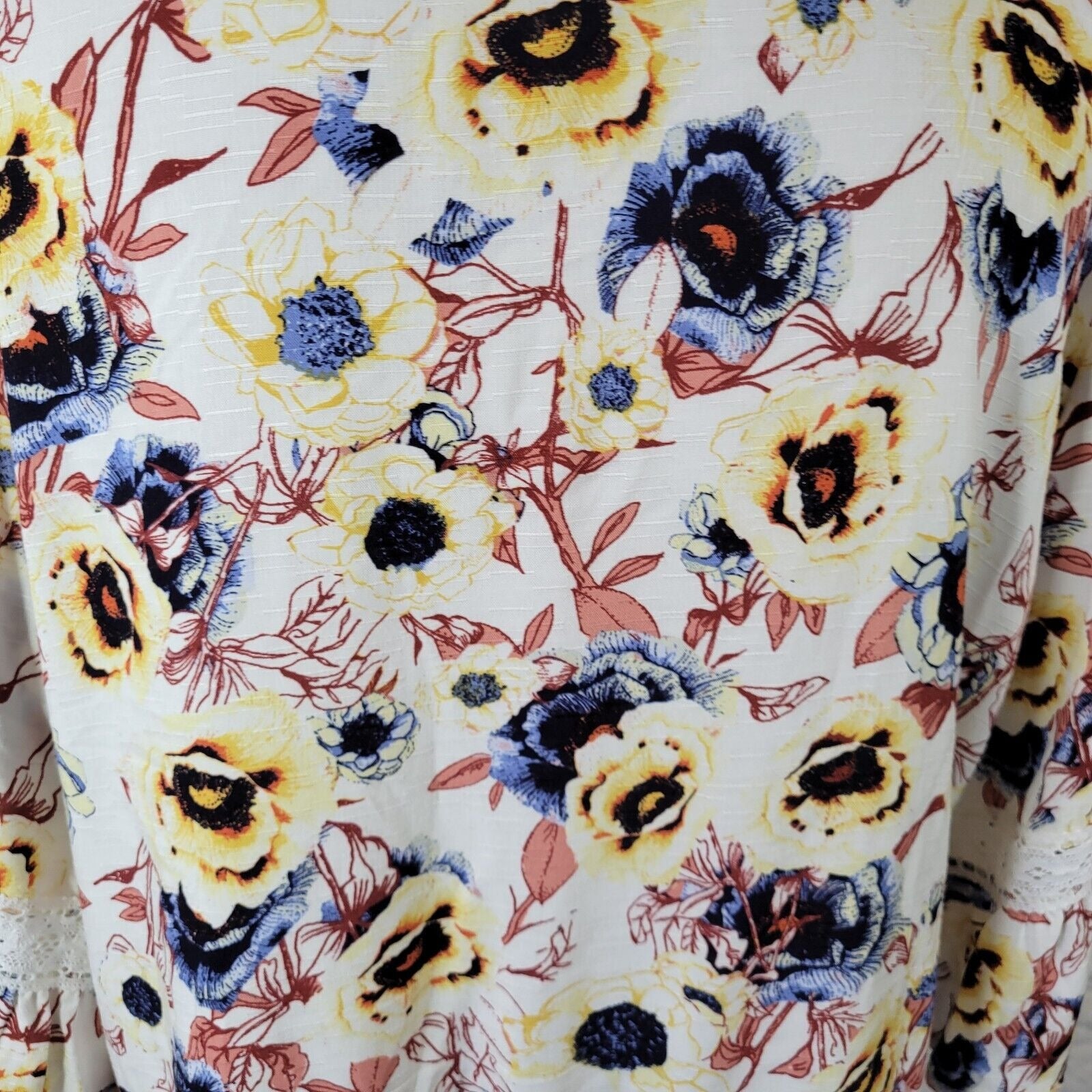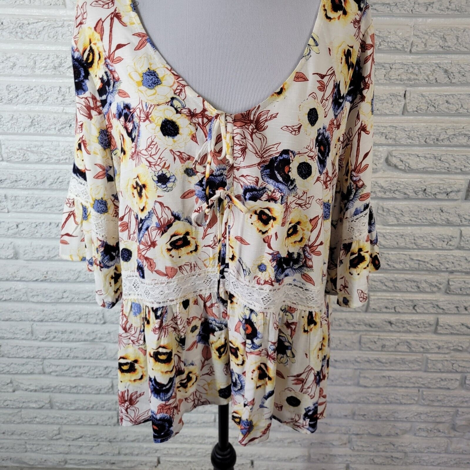 Maurices Womens Top 0X Baby Doll Bell Sleeve Blue Brown Floral Lightweight Rayon