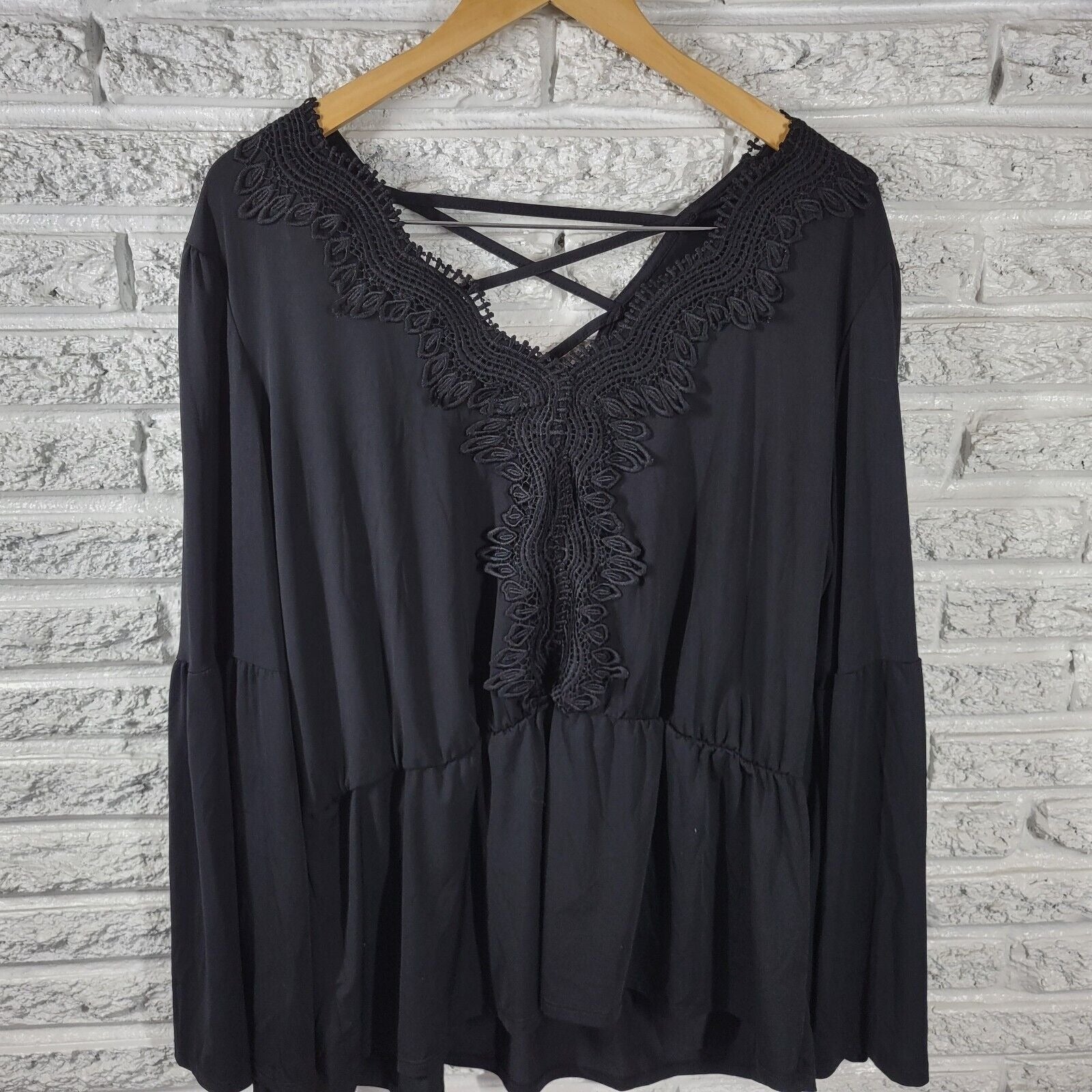 Maurices Womens Top XXL Tunic Bell Sleeve Black Elastic Waist Lattice Back Lace