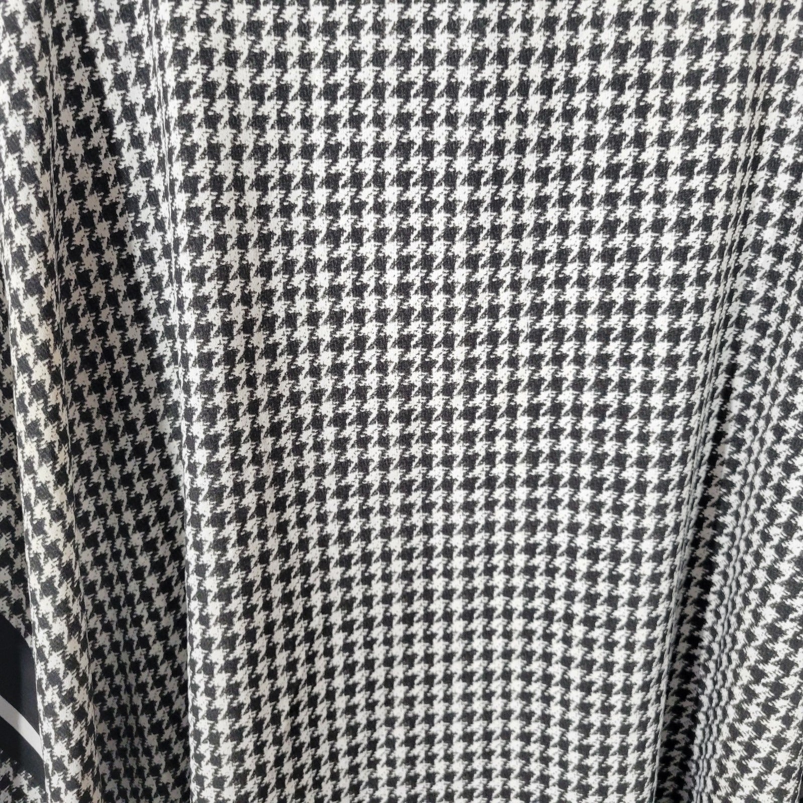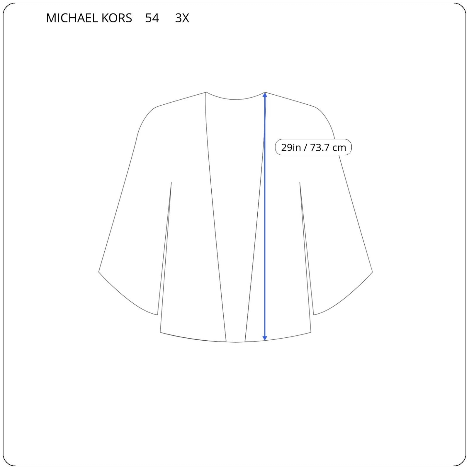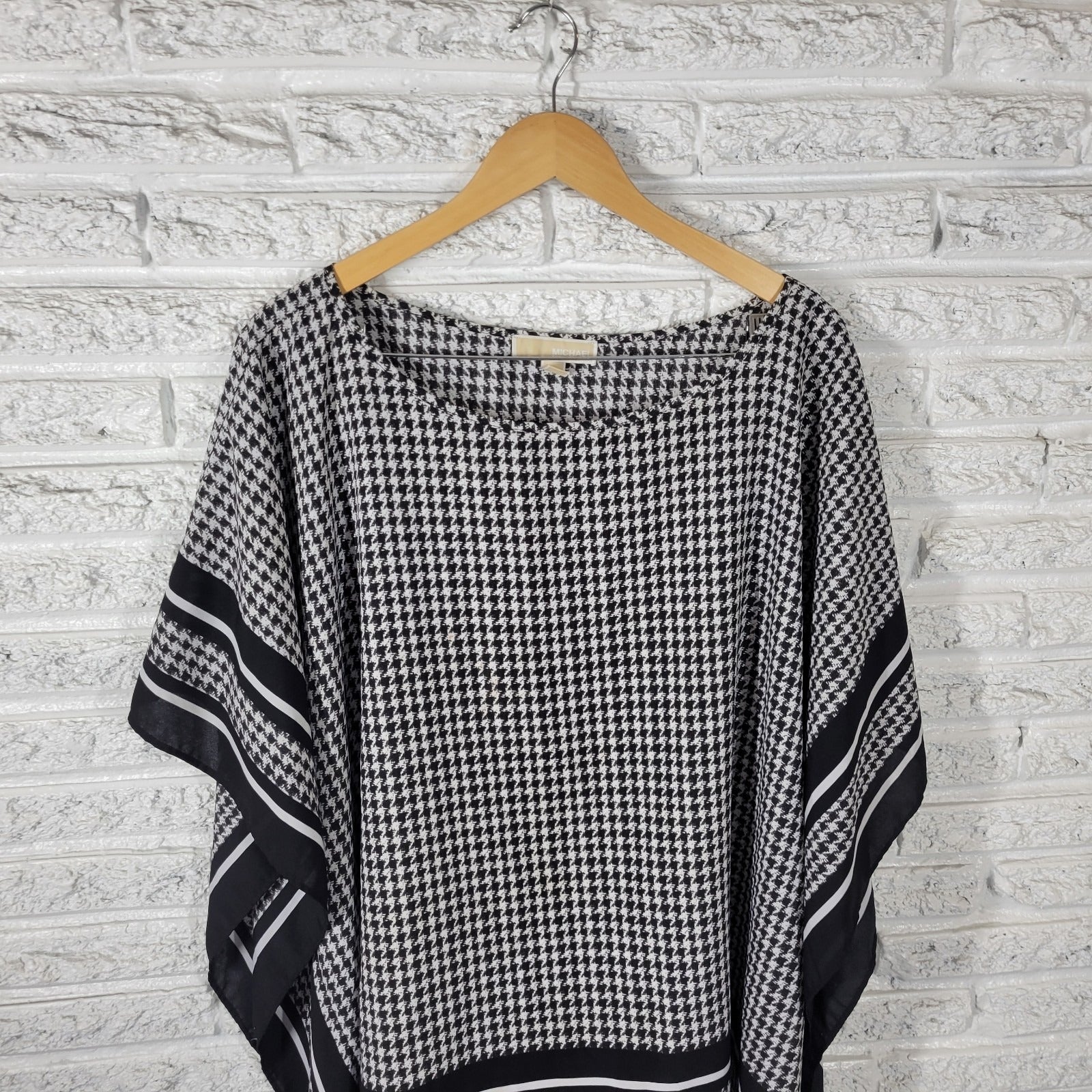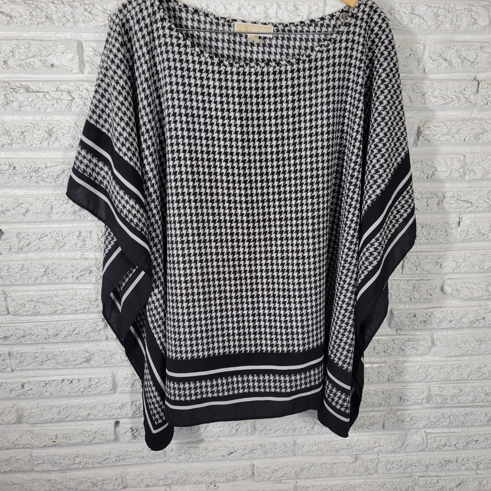 The Michael Kors Women's Top in size 3X Plus features a stylish houndstooth pattern in black/white, with kimono sleeves and a round neckline. Made of lightweight polyester, this pullover blouse is perfect for travel and casual occasions. The regular fit and all-season design make it a versatile and fashionable addition to any wardrobe. Machine washable for easy care, this top is a chic and comfortable choice for women who appreciate the quality and style of Michael Kors.
