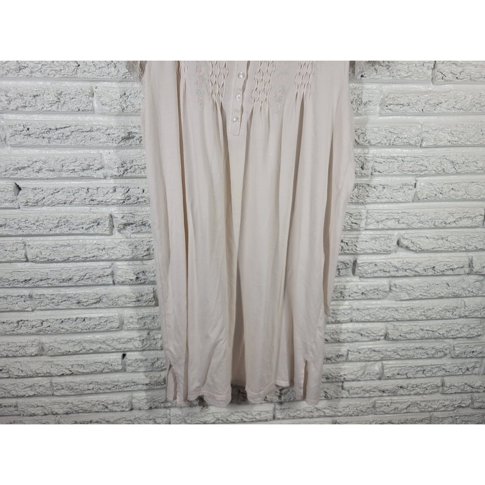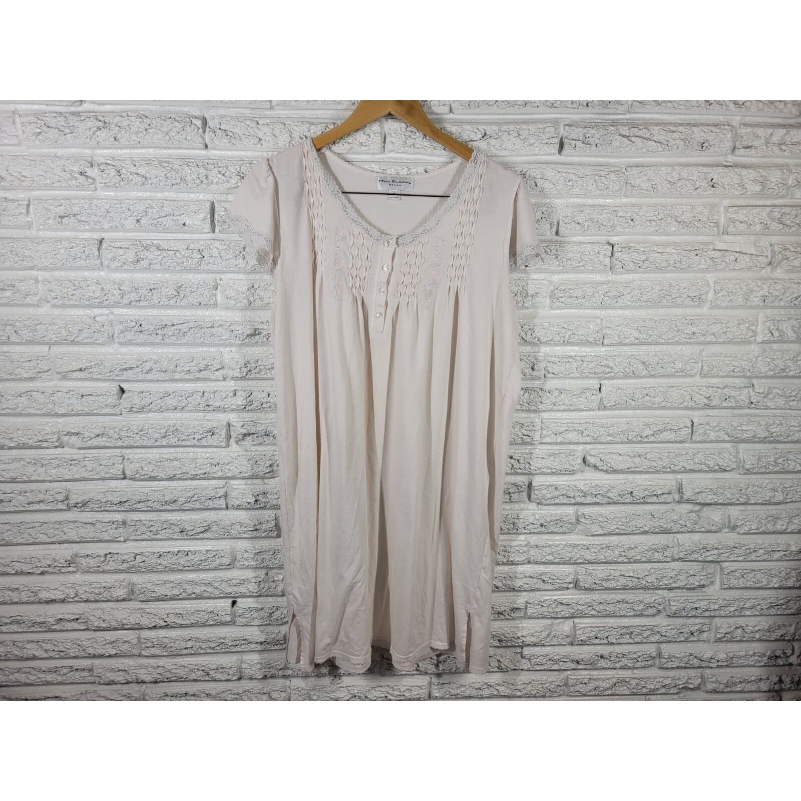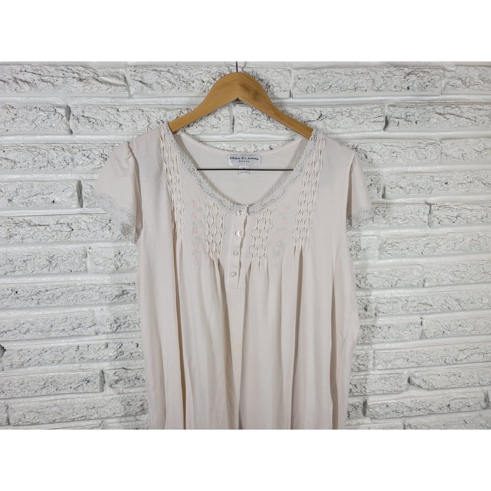 Indulge in luxury with this beautiful Miss Elaine women's robe. Made from a soft cotton blend, this robe features a solid white color with embroidered accents and a cinched lace trim. The cap sleeves and round neckline provide a comfortable and elegant look, while the button closure ensures easy wear.   This robe is perfect for any season, whether it's winter, summer, fall, or spring. It's machine washable for easy care, and it's available in size 1X for plus-sized women. Plus, it's a great addition to any sleepwear collection. Order yours today and experience the ultimate in comfort and style.