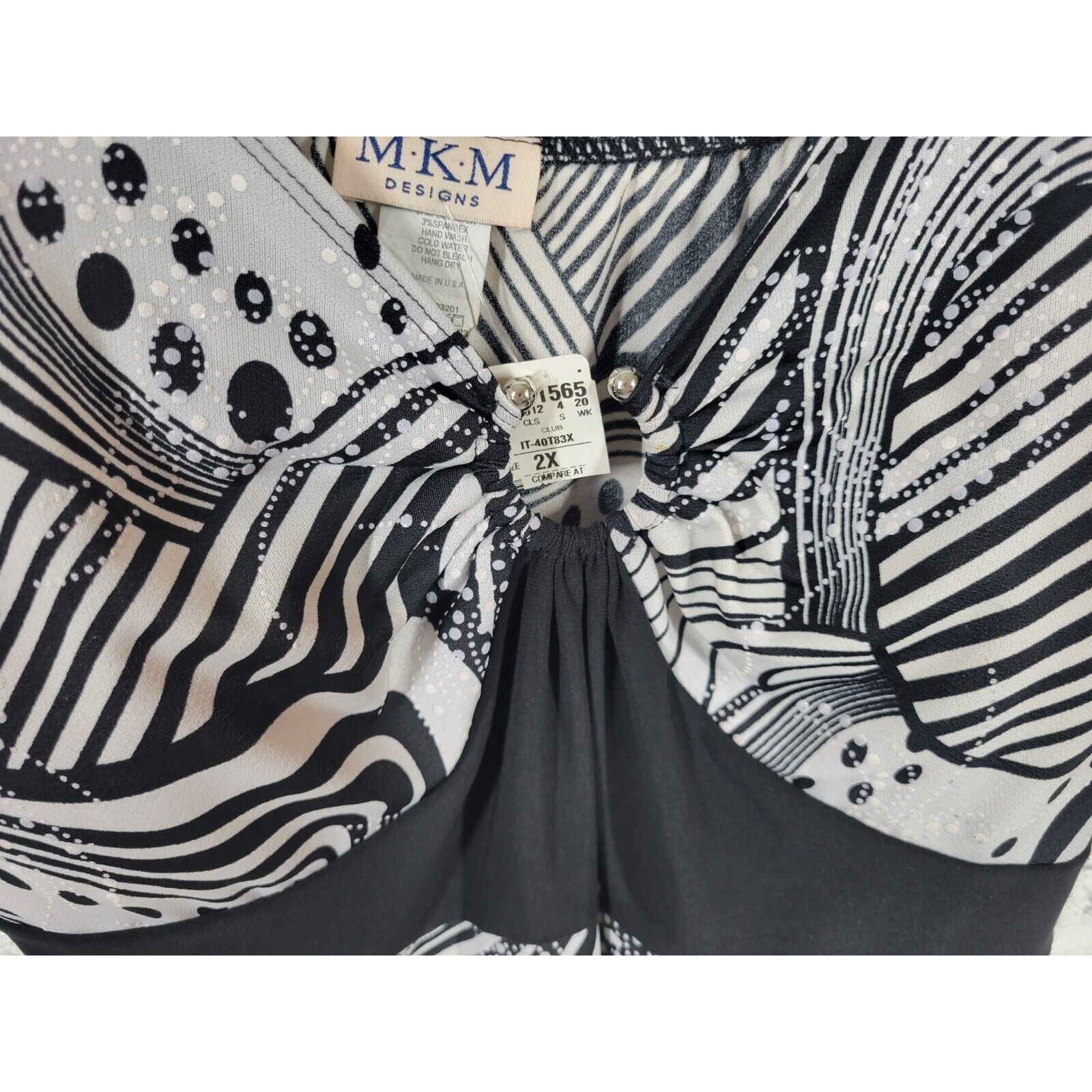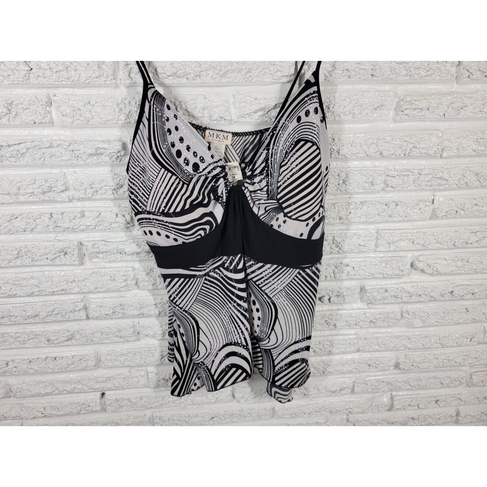 MKM Women's Top is a sleeveless camisole with adjustable spaghetti straps. It features a built-in bra, stretchy material, and a geometric pattern. The top is made of a polyester blend and is available in black. It is a regular fit and is sized as 2X plus. The garment care instructions recommend hand washing only. This camisole is suitable for all seasons and is made in the United States.