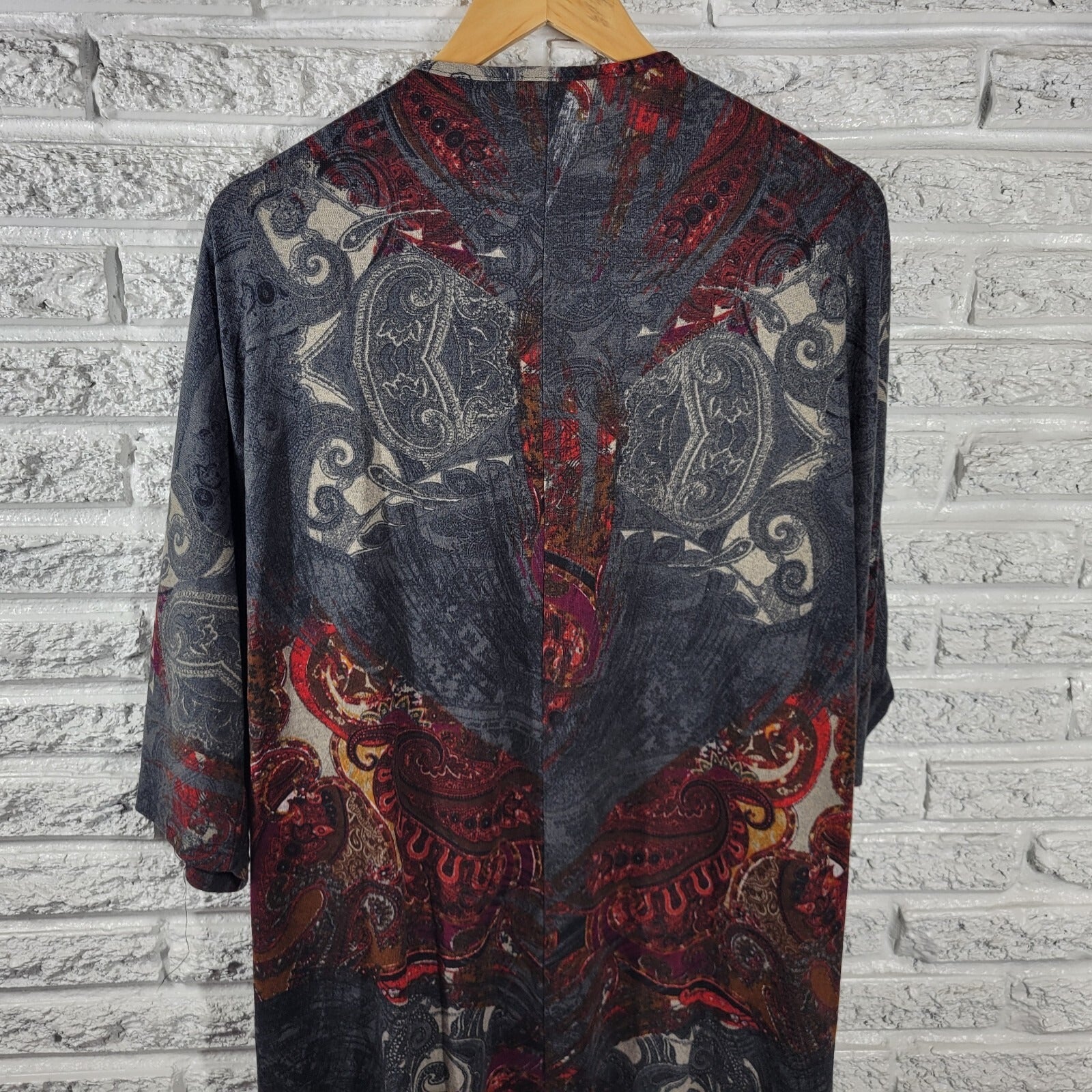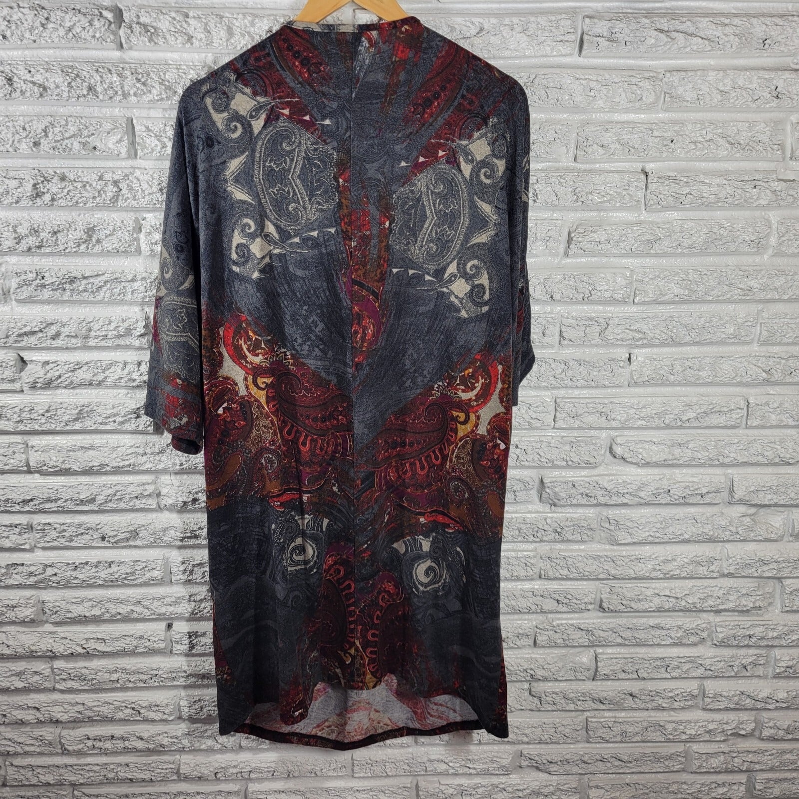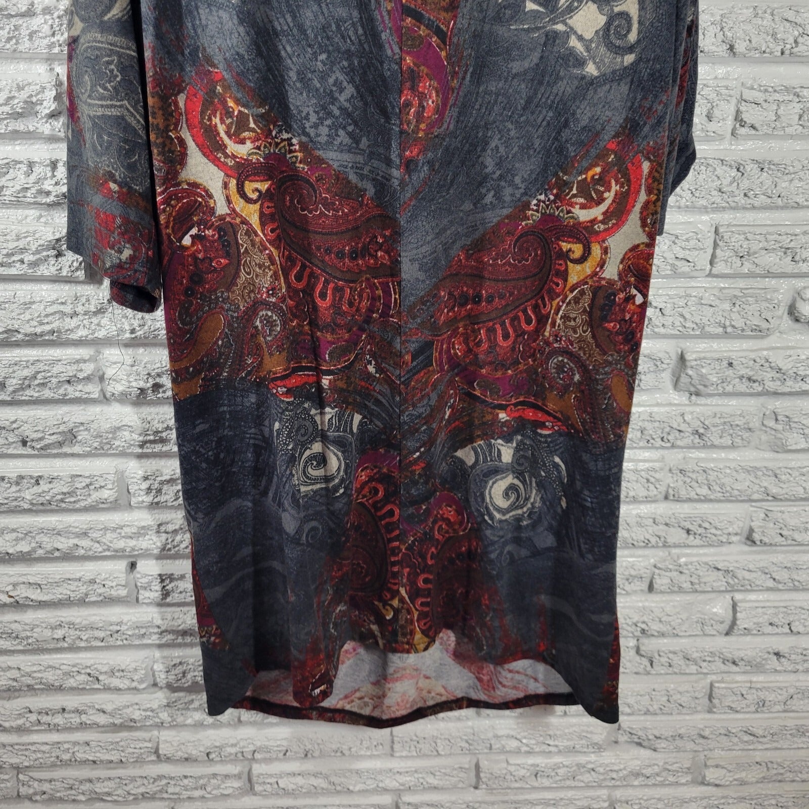 This stylish shirt dress by Mlle Gabrielle is perfect for any casual occasion. The dress features a beautiful paisley pattern on a gray polyester blend fabric, making it a great addition to your wardrobe. The dress has short sleeves, a round neckline, and a zip closure for easy wear. It is a knee-length dress and comes in a plus size 3X.   The dress is machine washable and has stretch features for your comfort. It is suitable for all seasons, whether it is winter, summer, fall, or spring. Get this stunning dress for yourself and make a statement wherever you go.