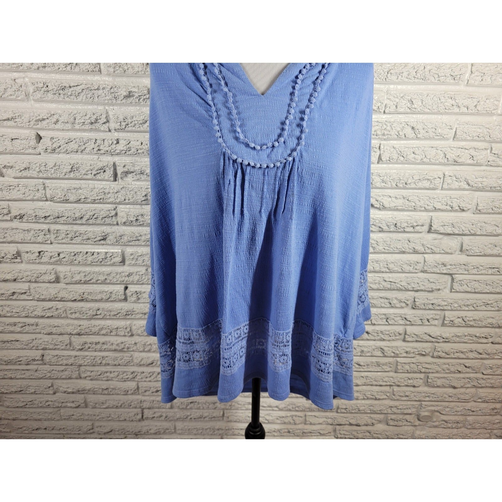 New Directions Women Top 3X Plus Tunic Crochet Sleeve Blue Ric Rac Poly Blend