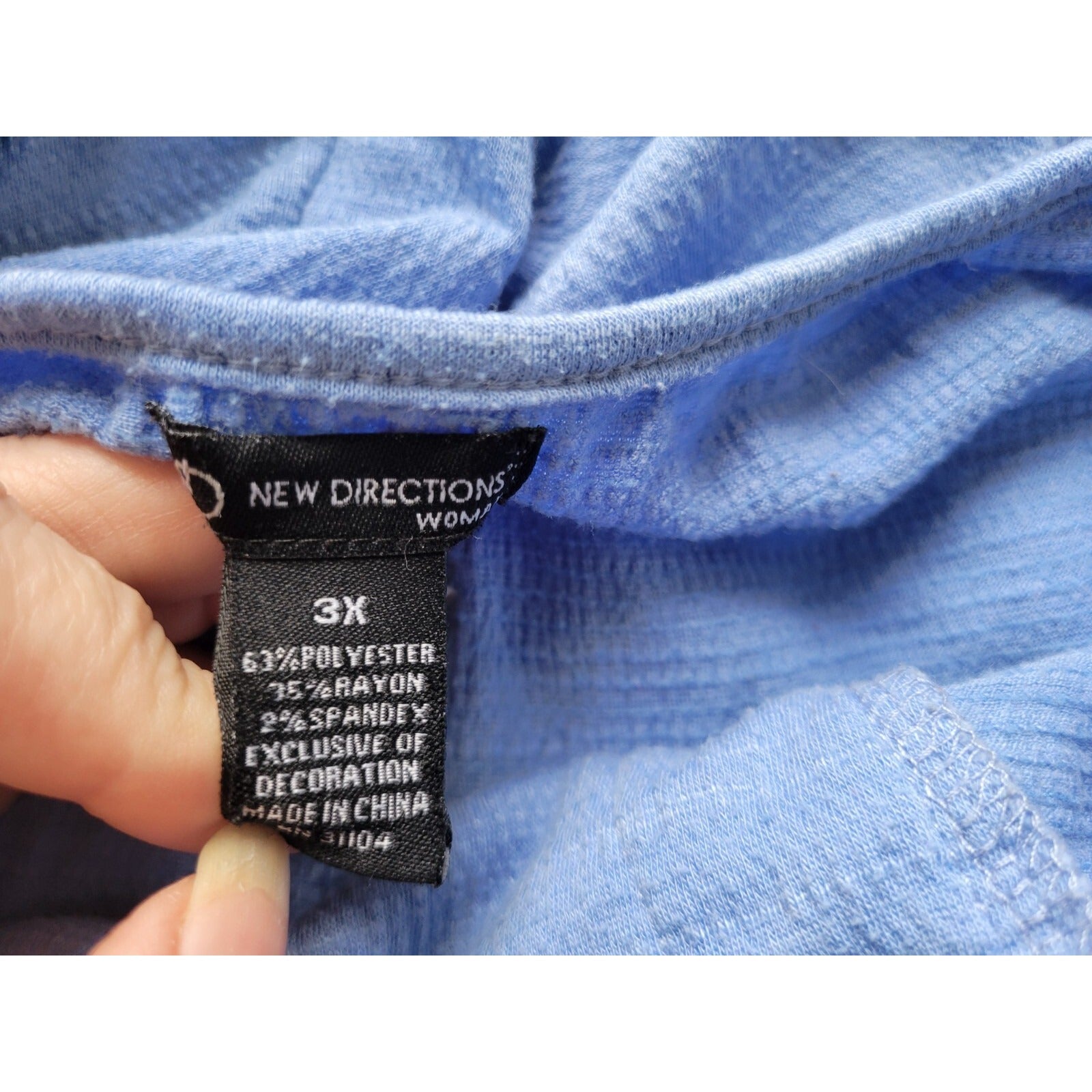This beautiful New Directions Women's Tunic Top is perfect for any casual occasion. The blue top is made of a comfortable polyester blend material with pleated accents and a V-neckline. The top has 3/4 crochet sleeves and a pullover closure. This tunic top is perfect for women who want a comfortable yet stylish outfit. The top comes in plus size 3X and is easy to care for with hand washing only. The top is versatile and can be worn in any season, whether it's summer, fall, winter, or spring. With its solid pattern and stretchy material, this blouse is a must-have for any wardrobe.