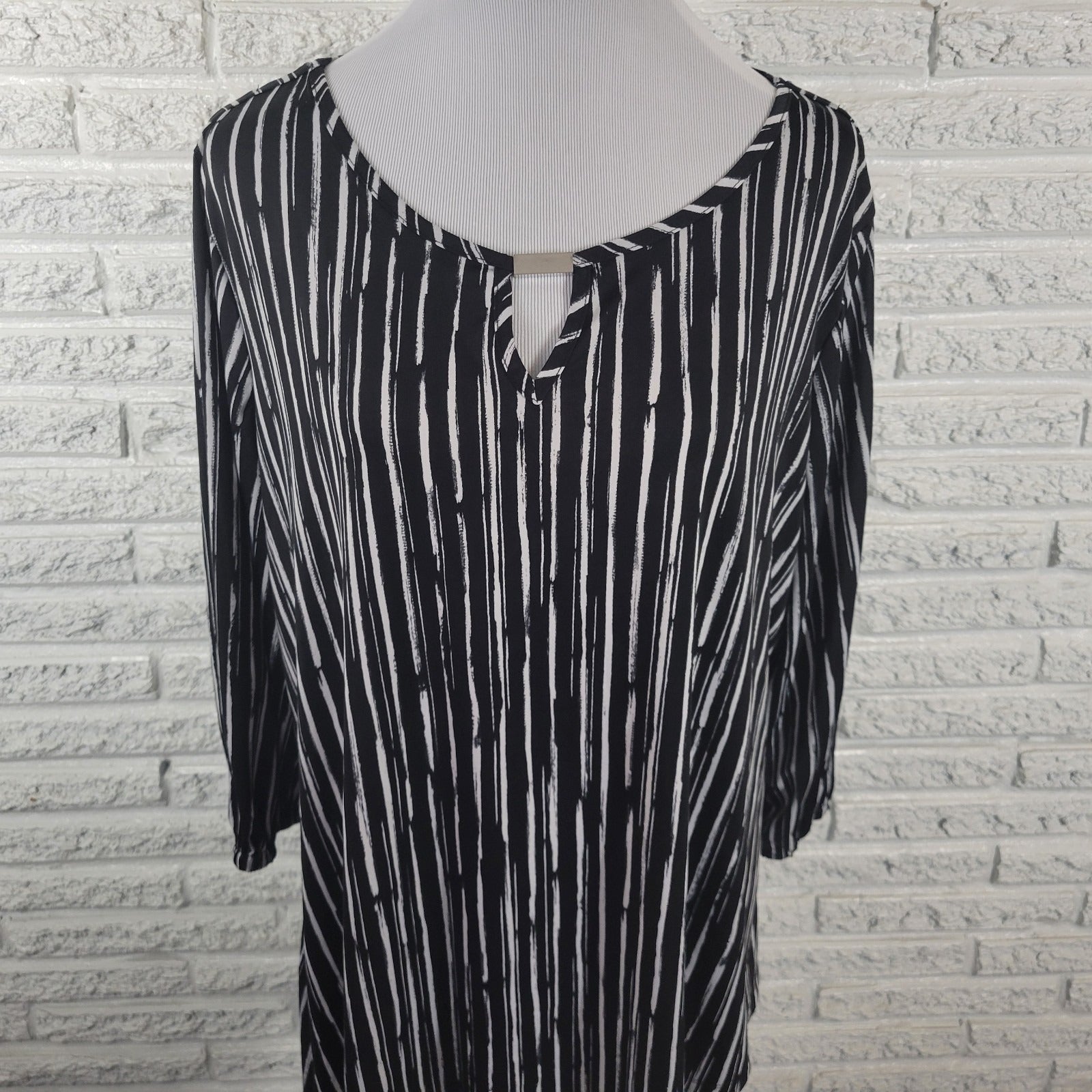 This New Directions Women's Top in extra large size features a stylish black/white striped pattern with a keyhole neckline. Made from a comfortable polyester blend, this 3/4 sleeve blouse is perfect for casual, business, and travel occasions with its regular fit and pullover closure. Machine washable and suitable for all seasons, this top is a versatile and chic addition to any woman's wardrobe.