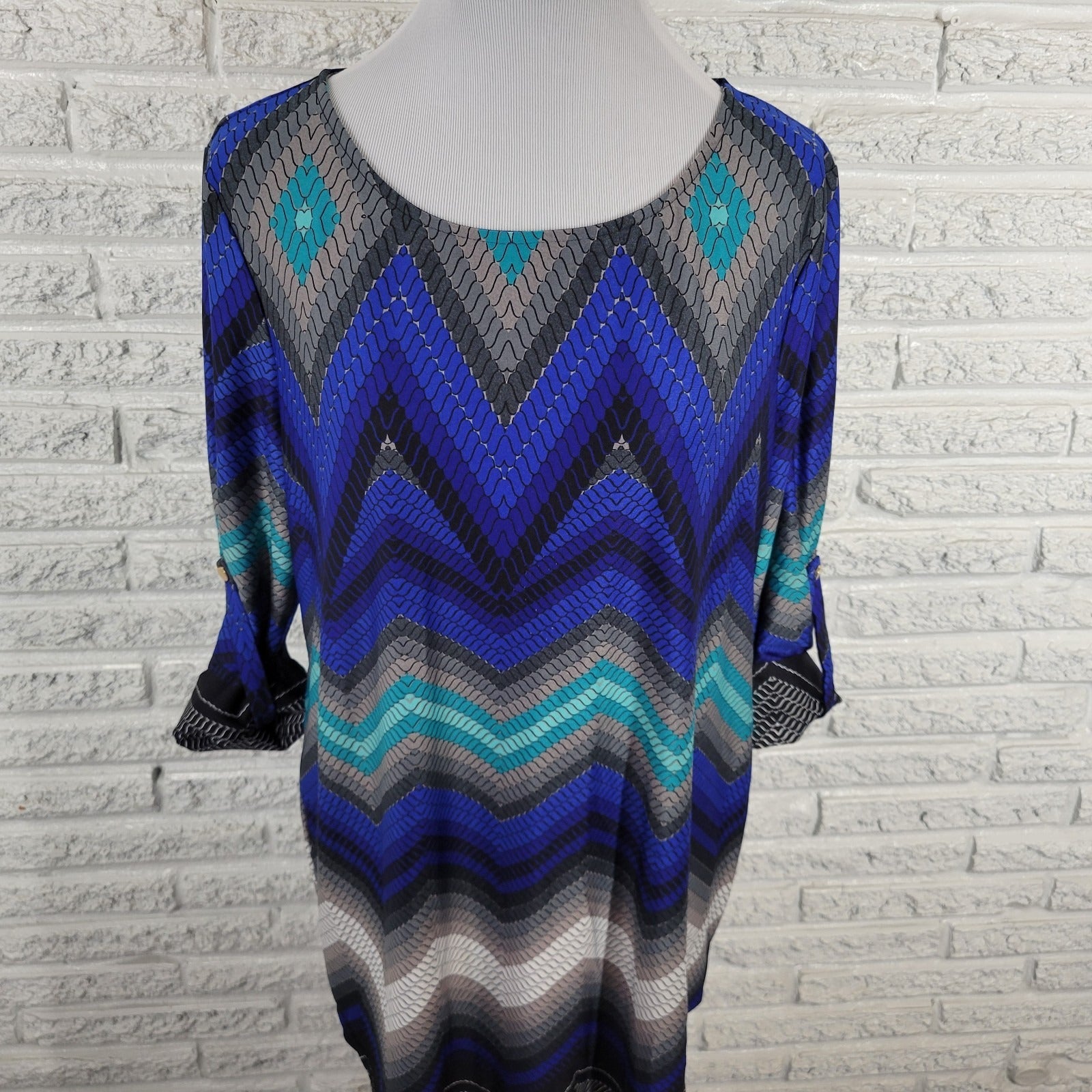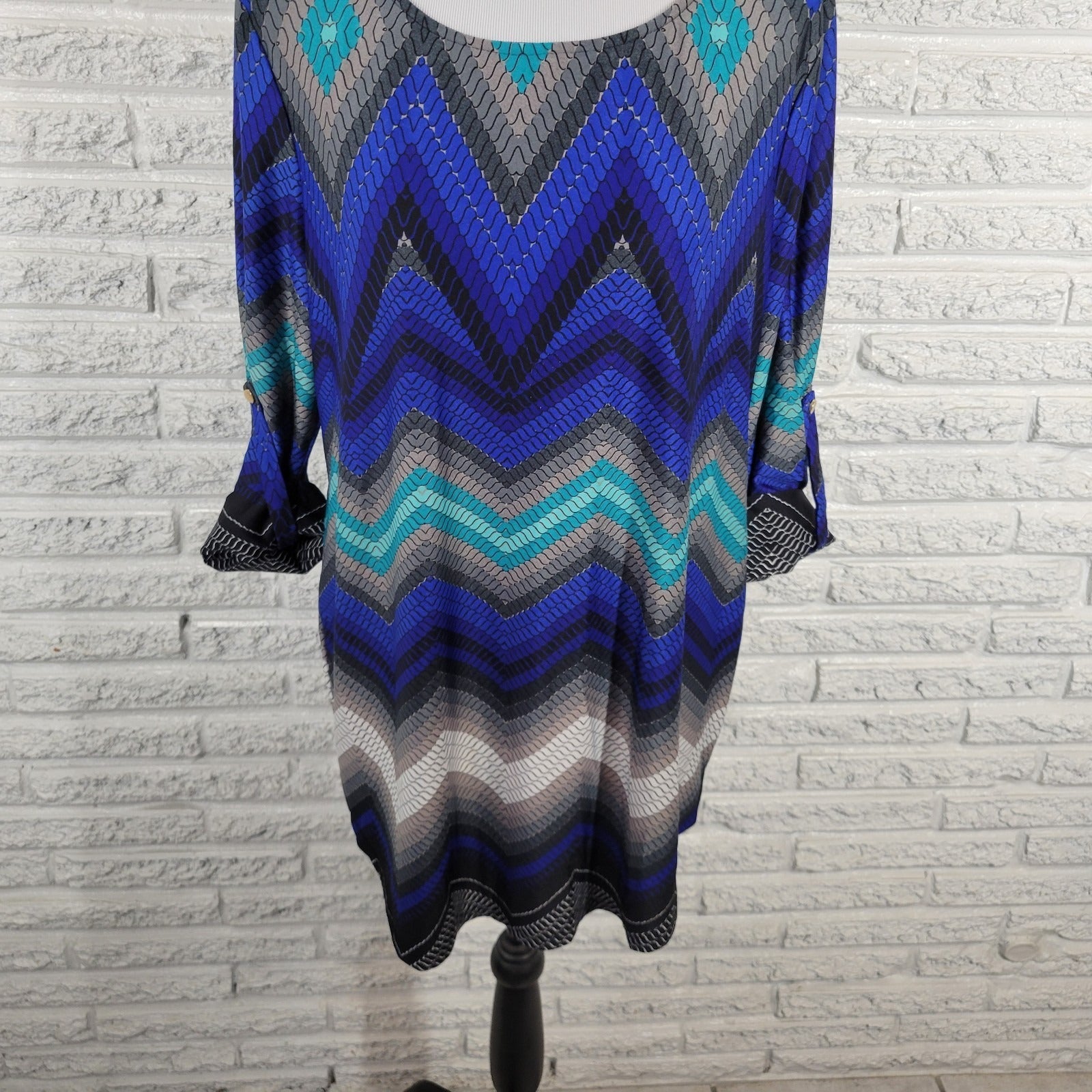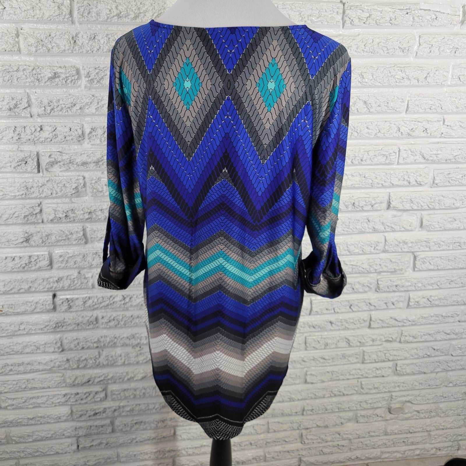 New Directions Womens Top Extra Large Roll Tab Sleeve Blue Gray Zig Zag Office