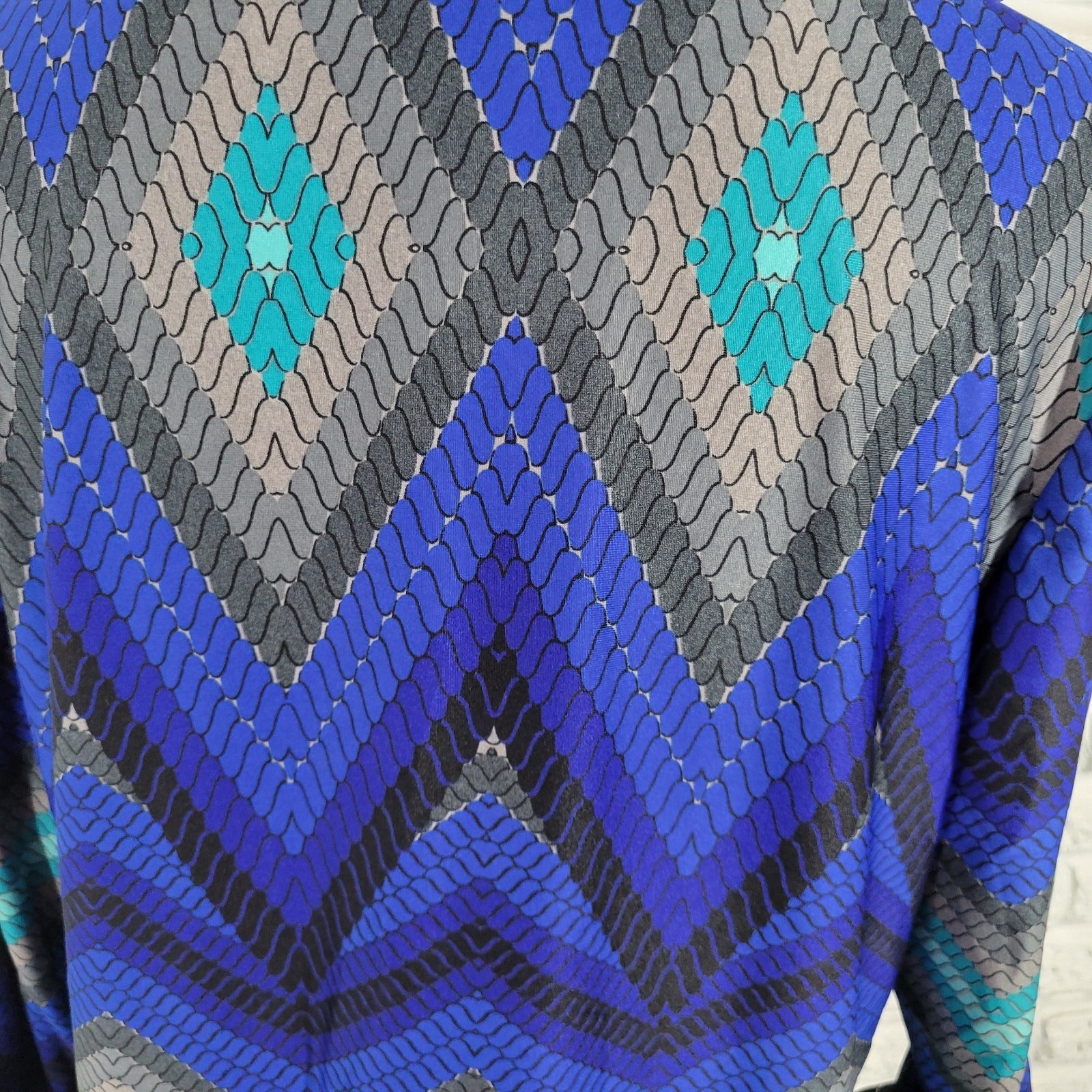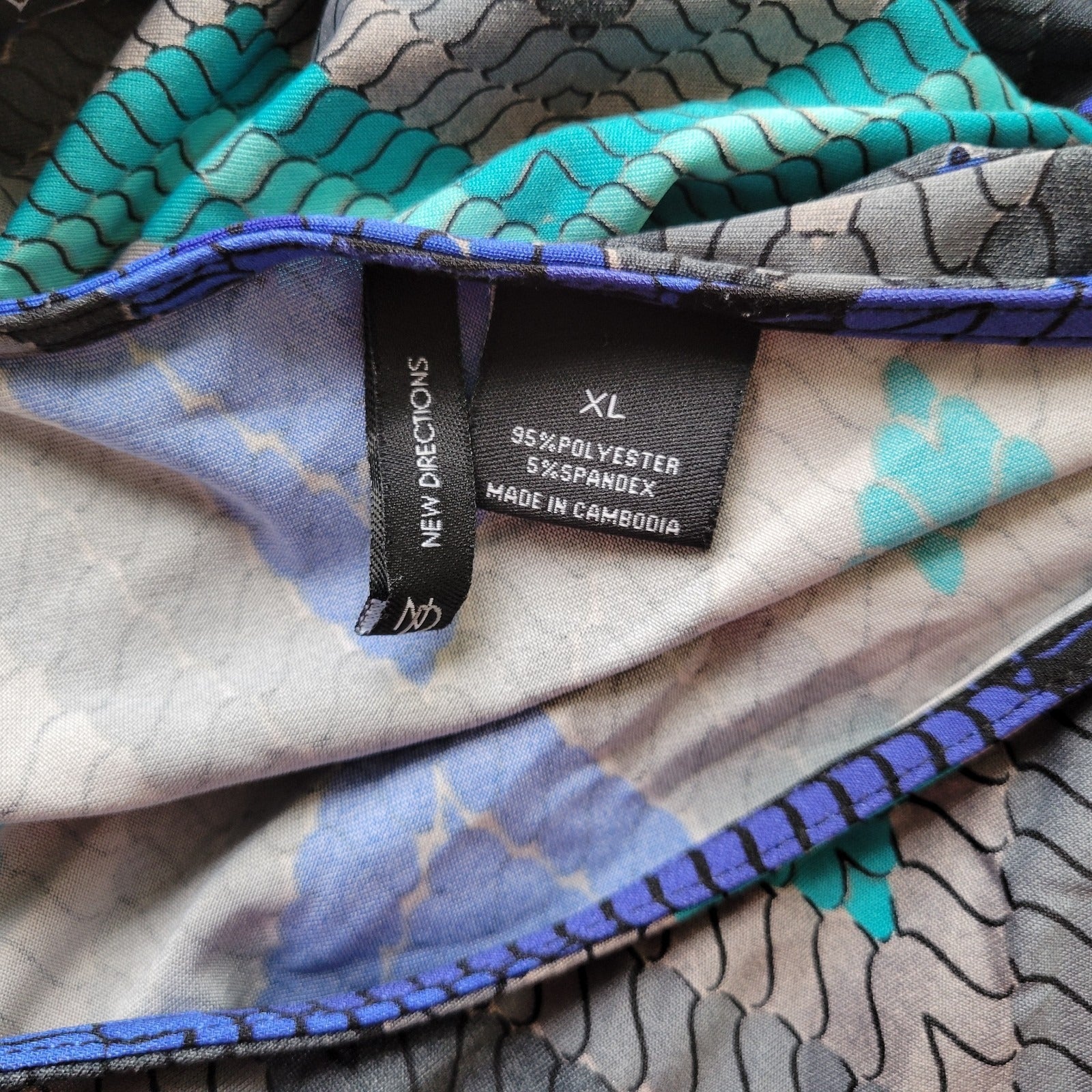 This New Directions Women's Top in Extra Large features a blue and gray zig zag geometric pattern, round neckline, and 3/4 roll tab sleeves. Made of a comfortable polyester blend material, this pullover blouse is suitable for travel, casual wear, and business occasions. With a regular fit and stretch fabric, it is a versatile piece for all seasons. The top can be machine washed and is a basic style suitable for everyday wear.