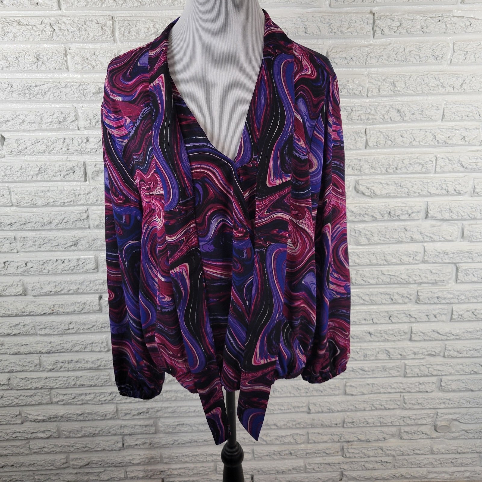 This New York & Co Women's Top in XXL Plus size is a stylish and versatile piece for any wardrobe. The purple/blue watercolor faux wrap design adds a touch of sophistication, while the lightweight polyester material makes it perfect for all seasons. With long sleeves and a pullover closure, this blouse is ideal for travel, casual outings, or business meetings. Easy to care for with machine washable instructions, this top is a comfortable regular fit with a classic/fitted sleeve style. Perfect for layering or wearing on its own, this top is a fashionable choice for any occasion.