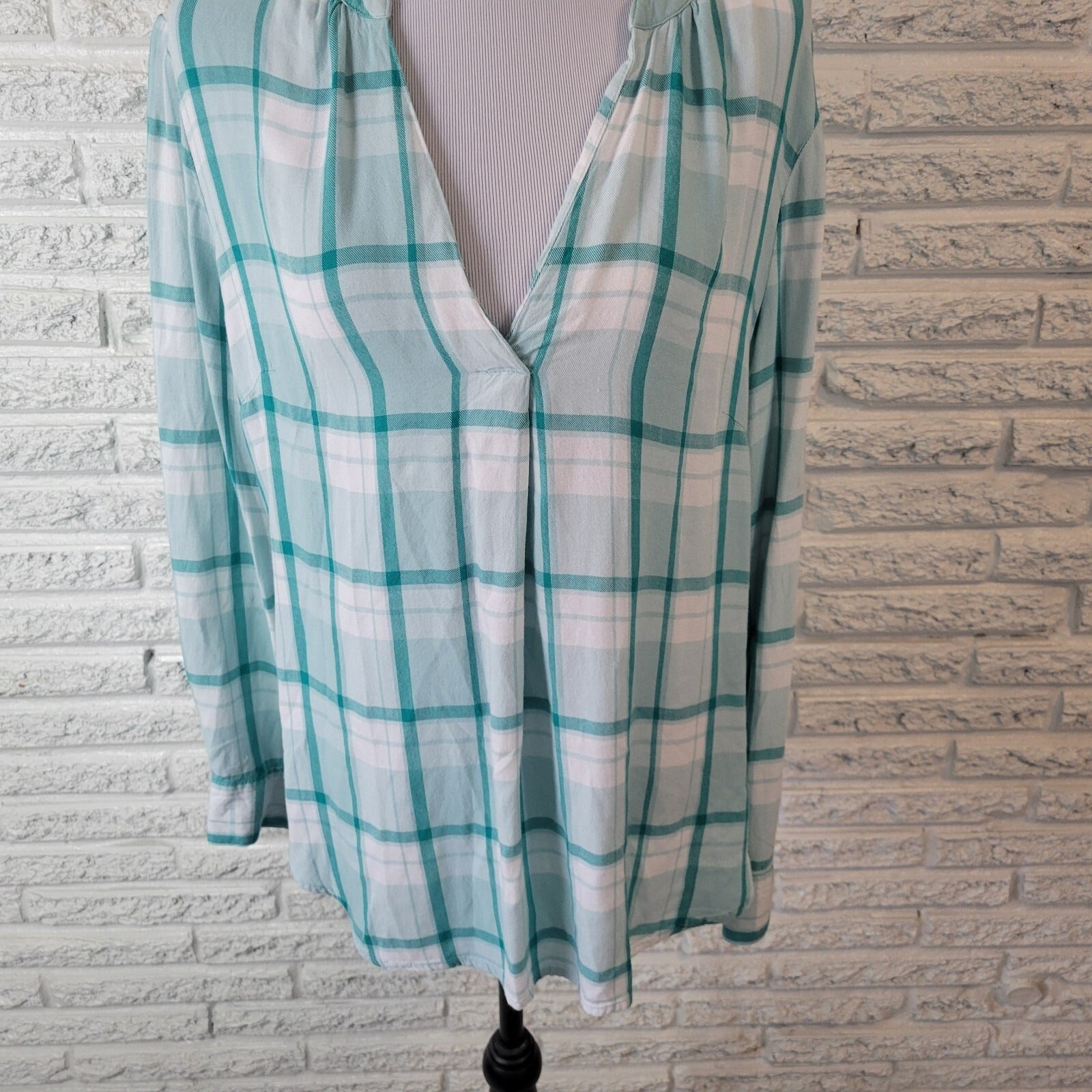 The New York & Company Women's Top in size XL features a green and white plaid pattern, long sleeves with a classic/fitted sleeve type, V-neckline, and pullover closure. This casual blouse is suitable for travel and everyday wear, offering a regular fit for comfort. Made from machine washable fabric, it is designed for all seasons and is a basic style perfect for any woman's wardrobe.