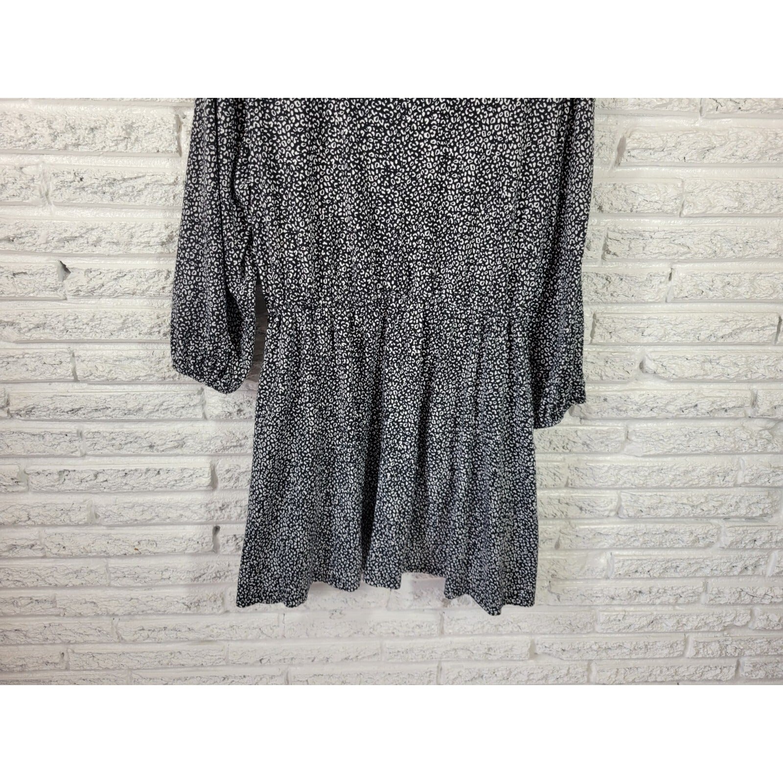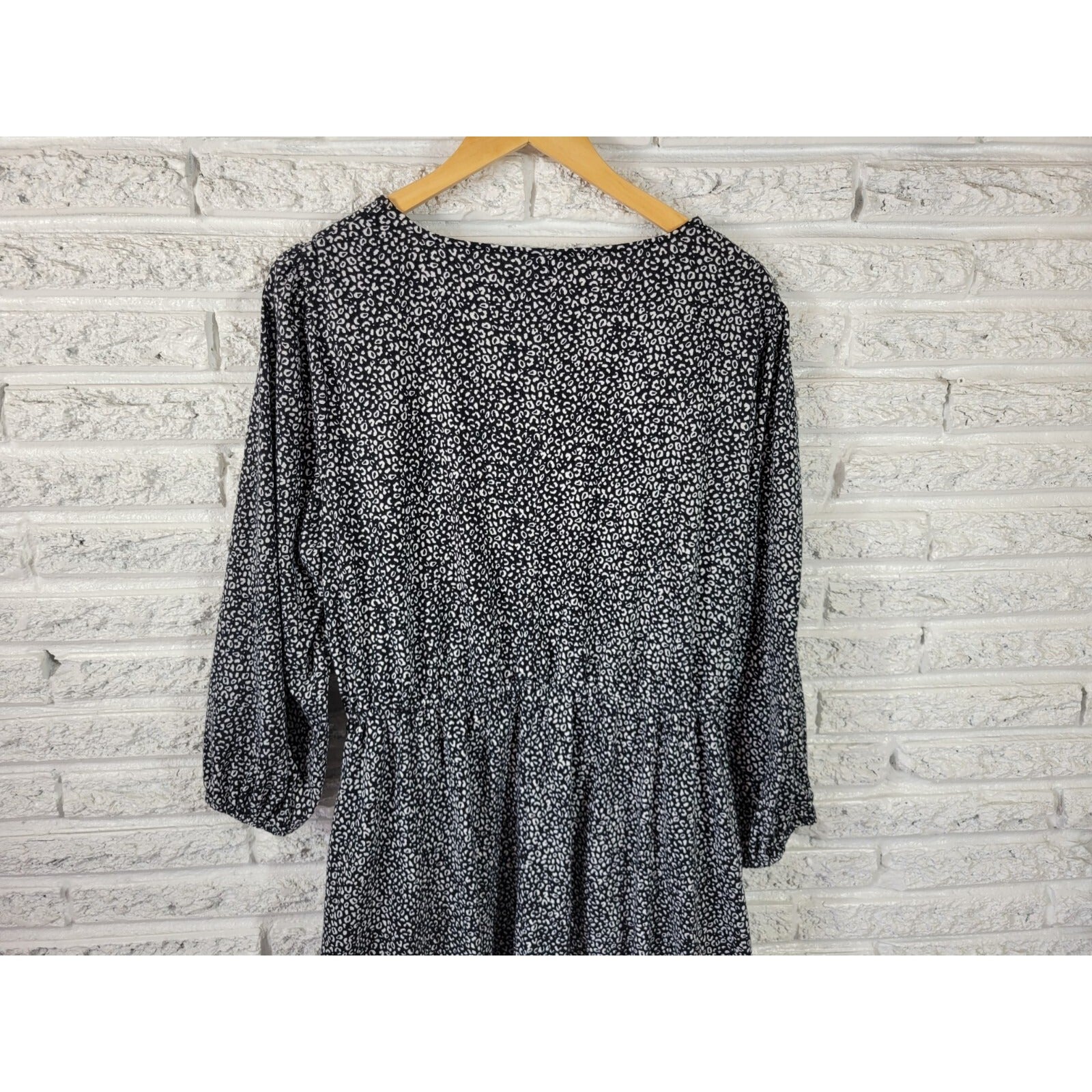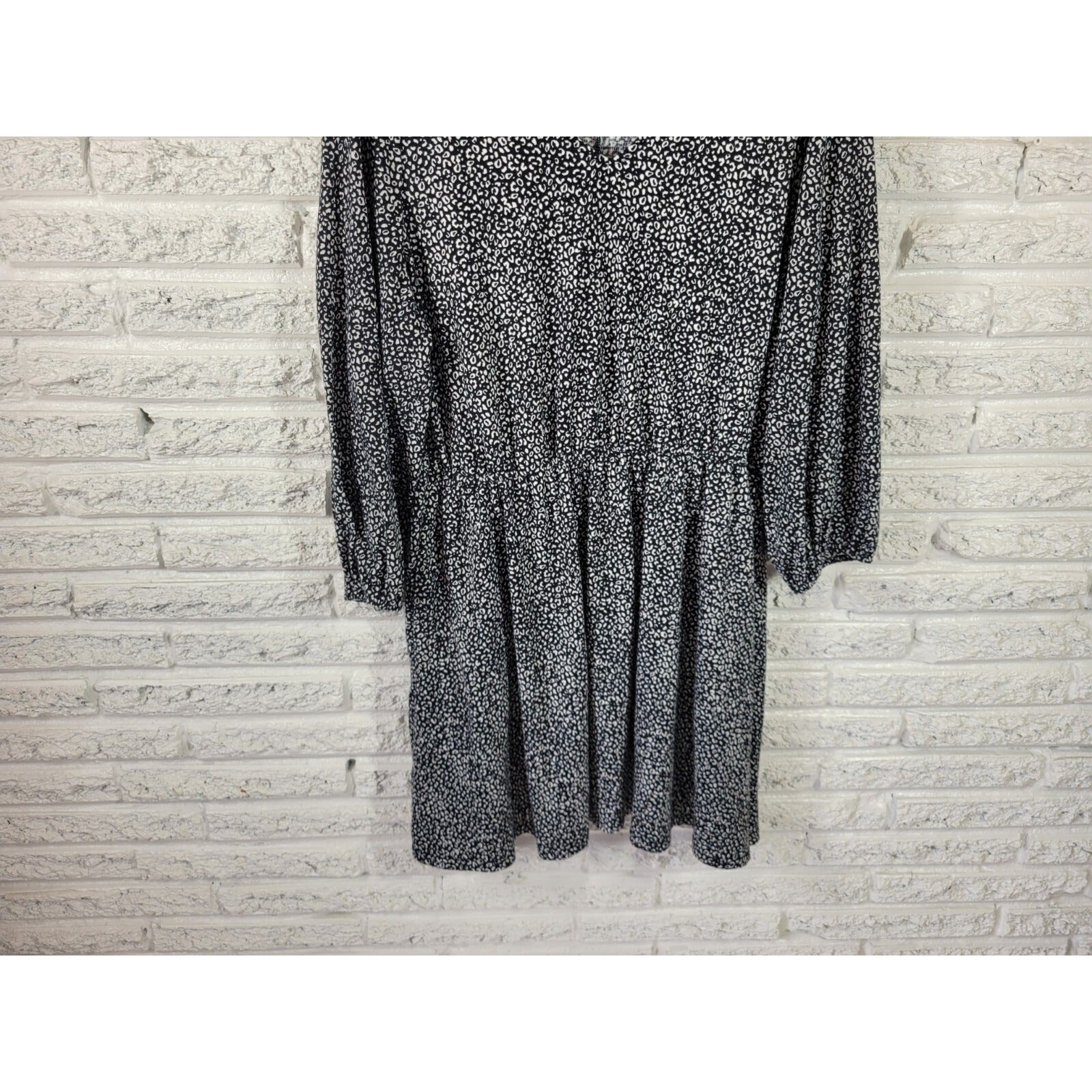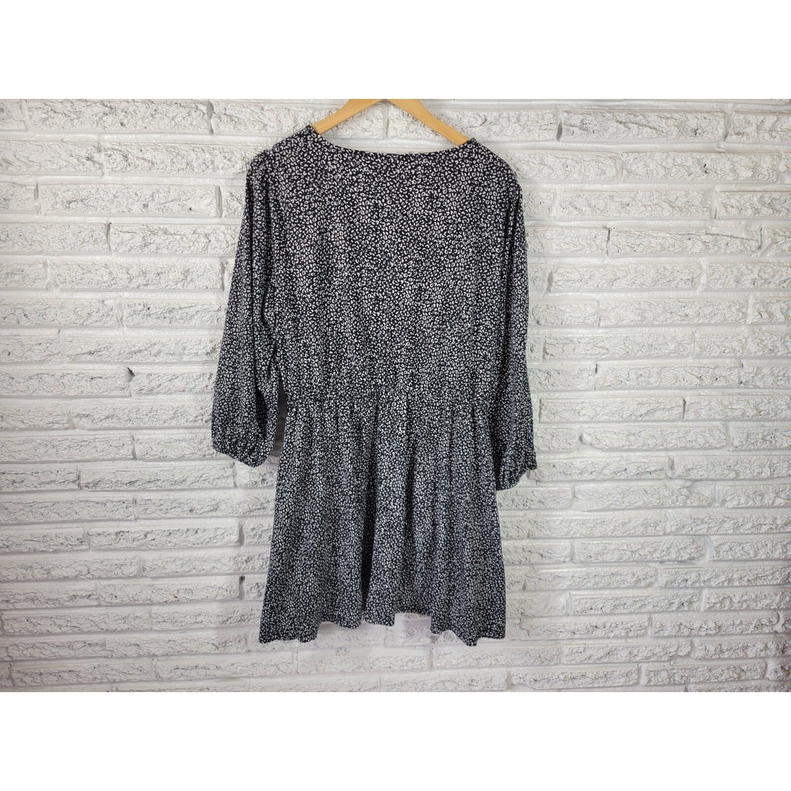 This beautiful Nine West dress is perfect for any casual occasion. The black animal print with a V-neckline and long sleeves make it stylish and comfortable. This dress features a pullover closure, stretchy material, and convenient pockets. Made with a polyester blend, it is machine washable and perfect for any season, whether it's winter, summer, fall, or spring.   The dress is a size XL, with a fit and flare style and a short length. This Nine West dress is a must-have for any wardrobe, and it's perfect for someone who wants to look great without compromising on comfort.