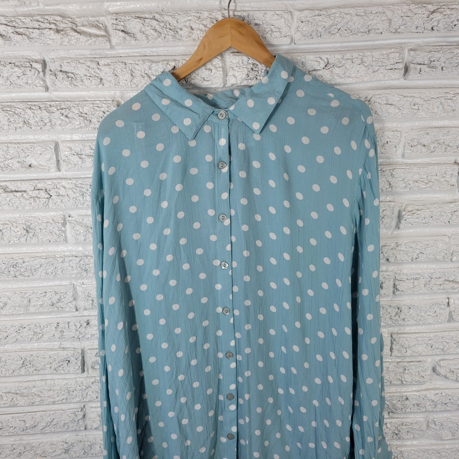 The North Style Women's Top in 3X Plus size is a casual blue/white polka dot rayon blouse with roll tab sleeves and a collared neckline. This button-up top is perfect for travel and everyday wear, featuring a regular fit and lightweight fabric that is suitable for all seasons. With a long sleeve design, this top from NorthStyle is machine washable and made in India, making it a versatile and stylish choice for any wardrobe.
