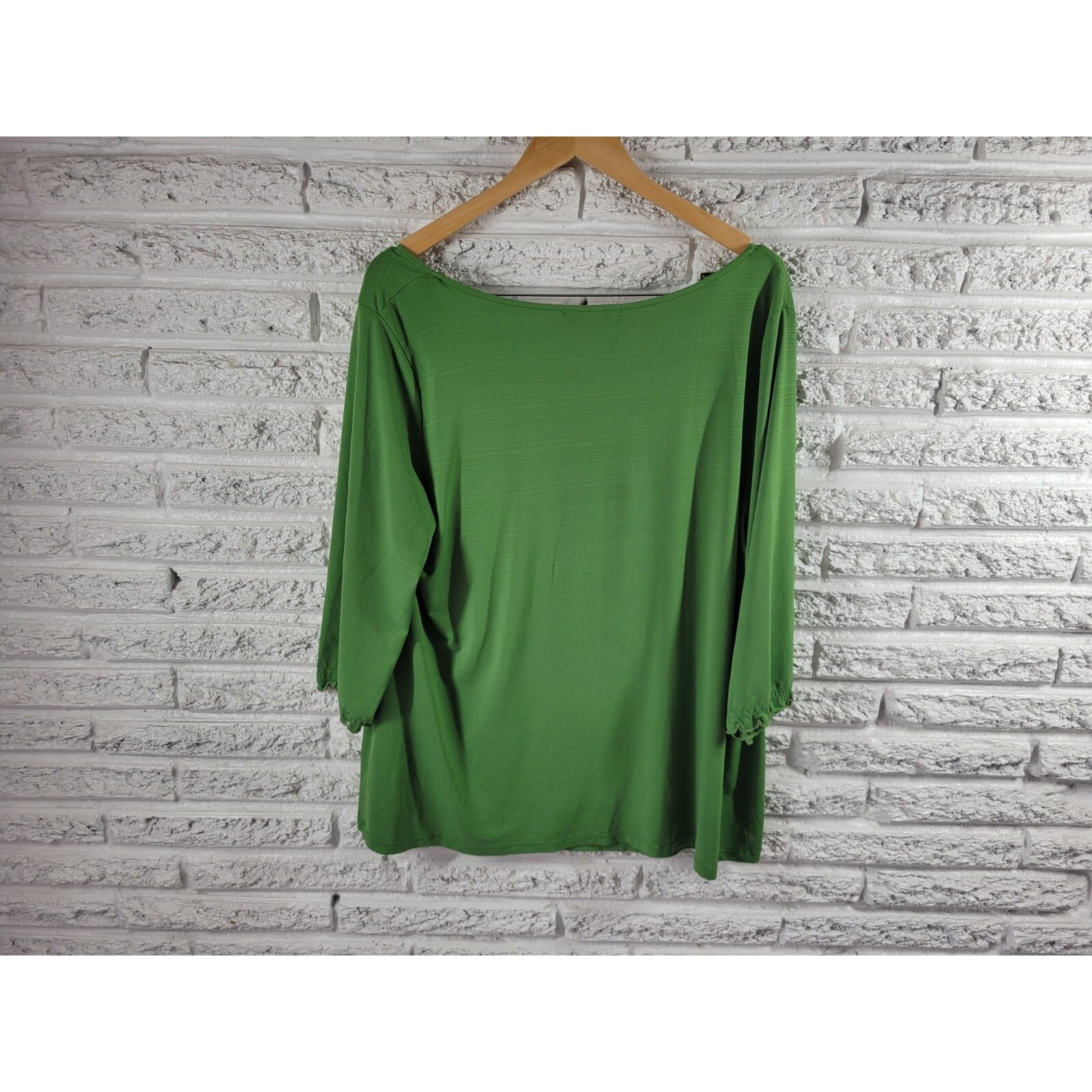 This Notations women's top in size 2X is perfect for casual occasions. The blouse features a square neckline and 3/4 sleeves with a casual sleeve type. The garment is made of a comfortable polyester blend that is machine washable for easy care. The green color of the blouse is perfect for all seasons and the stretchy material ensures a comfortable fit for all body types. The pullover closure adds convenience while the solid pattern and basic style make it easy to pair with any outfit. This top is a great addition to any wardrobe and perfect for any occasion.