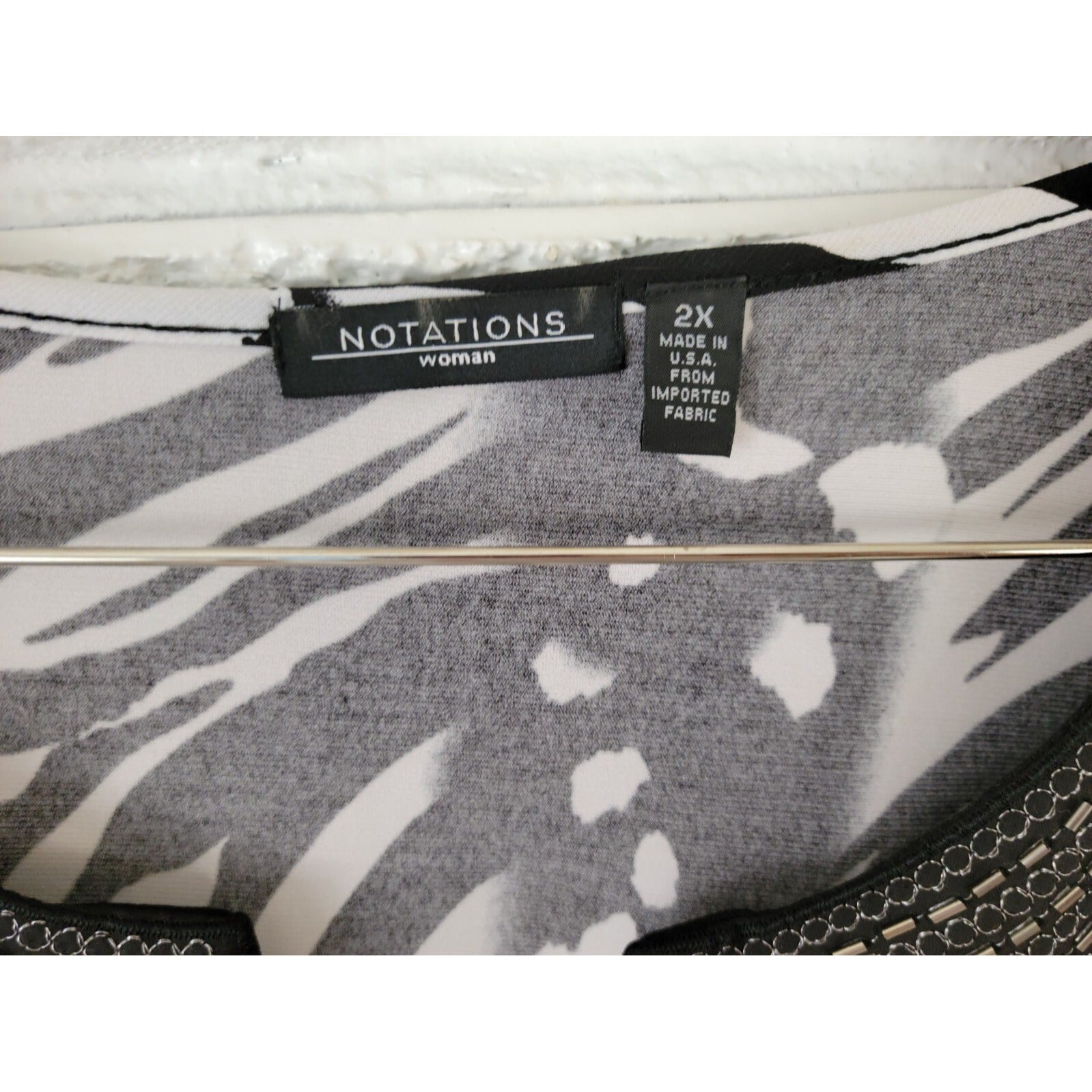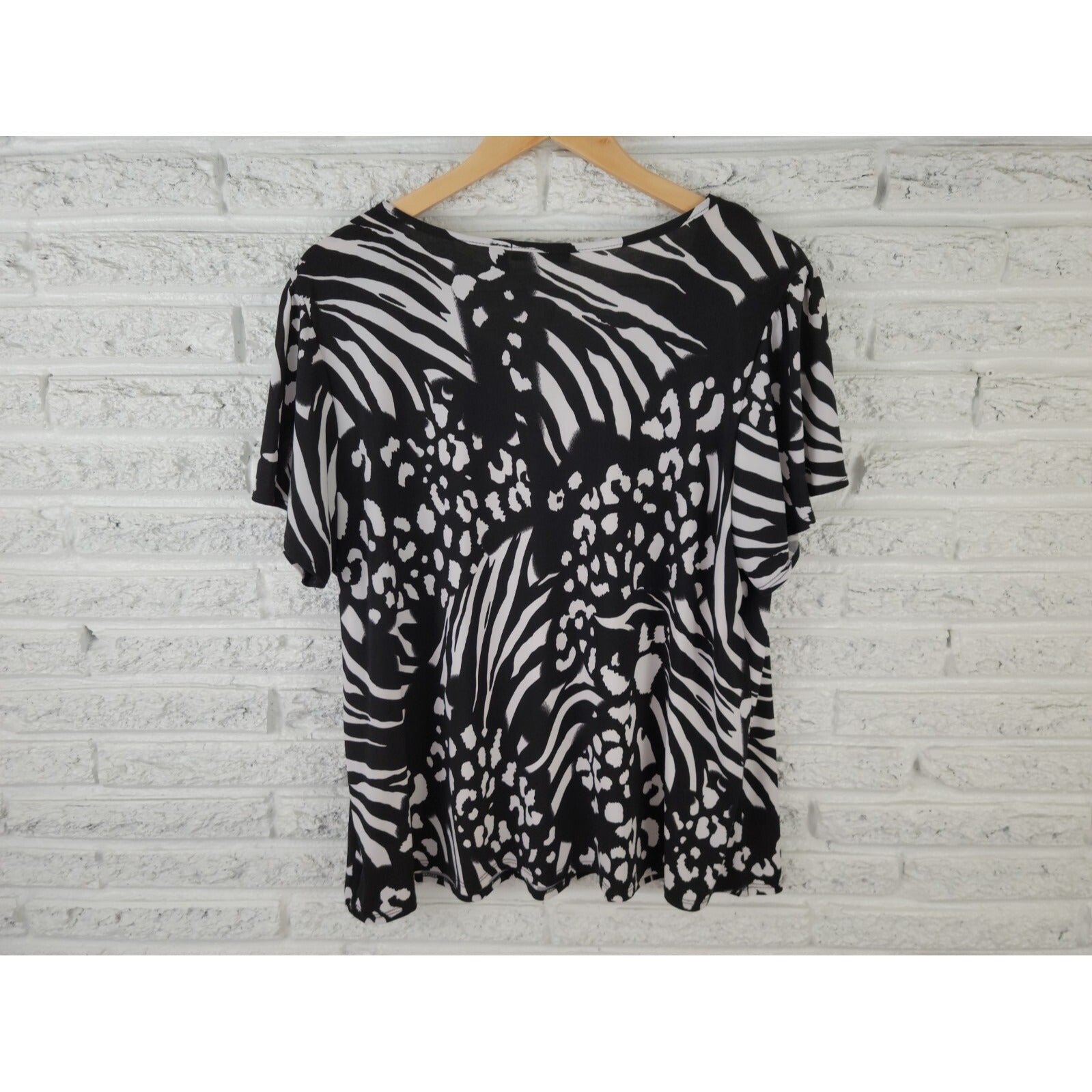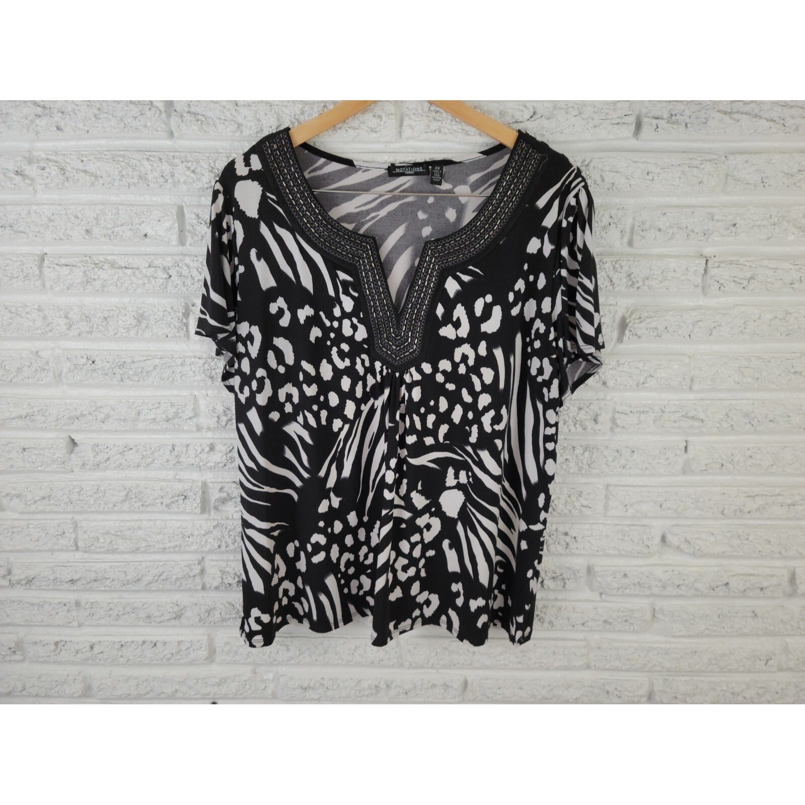 This Notations women's top is a stylish addition to your wardrobe. The classic black/white colors and animal print pattern make it perfect for casual or career occasions. The short sleeves and V-neckline provide a comfortable fit, while the pullover closure adds convenience. Made from a polyester blend material, this top is stretchy and suitable for all seasons. It is available in size 2X and fits regular plus size women. The top is hand wash only and is made in the United States. Get this basic yet fashionable blouse for your collection today!