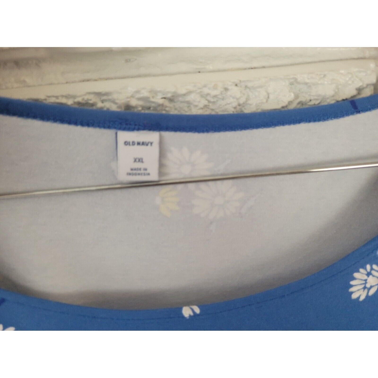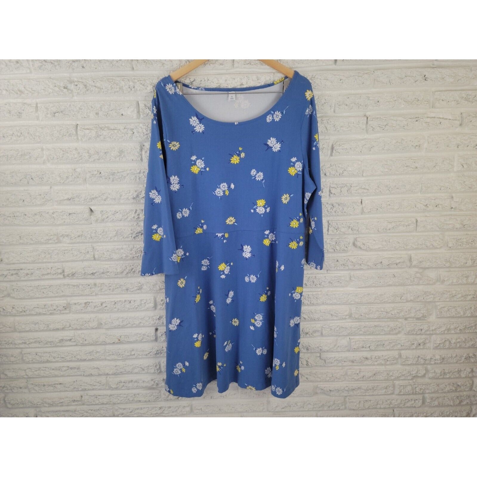 This is a women's dress from Old Navy in size 2XL. It features a blue floral pattern, boat neckline, 3/4 sleeves, and a pullover closure. The dress is made of a cotton blend material and has a fit and flare style with a shirt dress design. It also has stretch features and is machine washable. The dress is knee-length and suitable for casual occasions in all seasons.