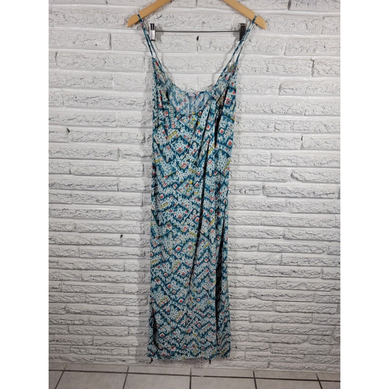 Add some color to your wardrobe with this stylish blue slip dress from Old Navy. Made of soft and stretchy rayon, this dress is perfect for any casual occasion, whether it's a winter evening or a summer day. With adjustable spaghetti straps and a midi length, it's a comfortable and flattering fit for anyone who loves to dress up. The geometric pattern adds a touch of fun to this sleeveless dress, which is easy to slip on thanks to its pullover closure. With machine washable fabric, you can keep it looking great year-round without worrying about damage. This dress is the perfect addition to any woman's closet, whether you're looking for something comfortable to wear around the house or something stylish for a night out.