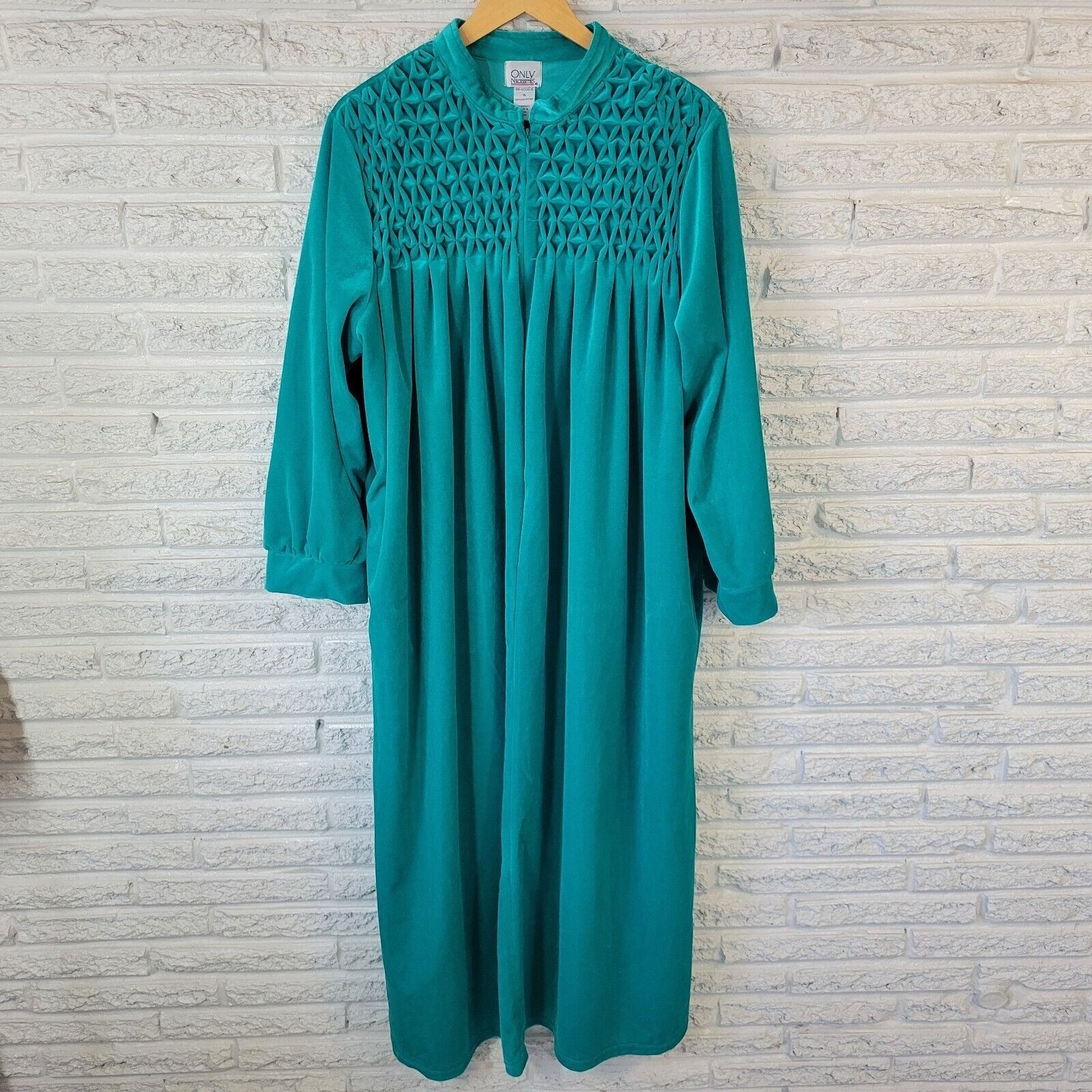 Only Necessities Womens Robe 1X Zip Up Green Velour Cinched Pockets Loungewear