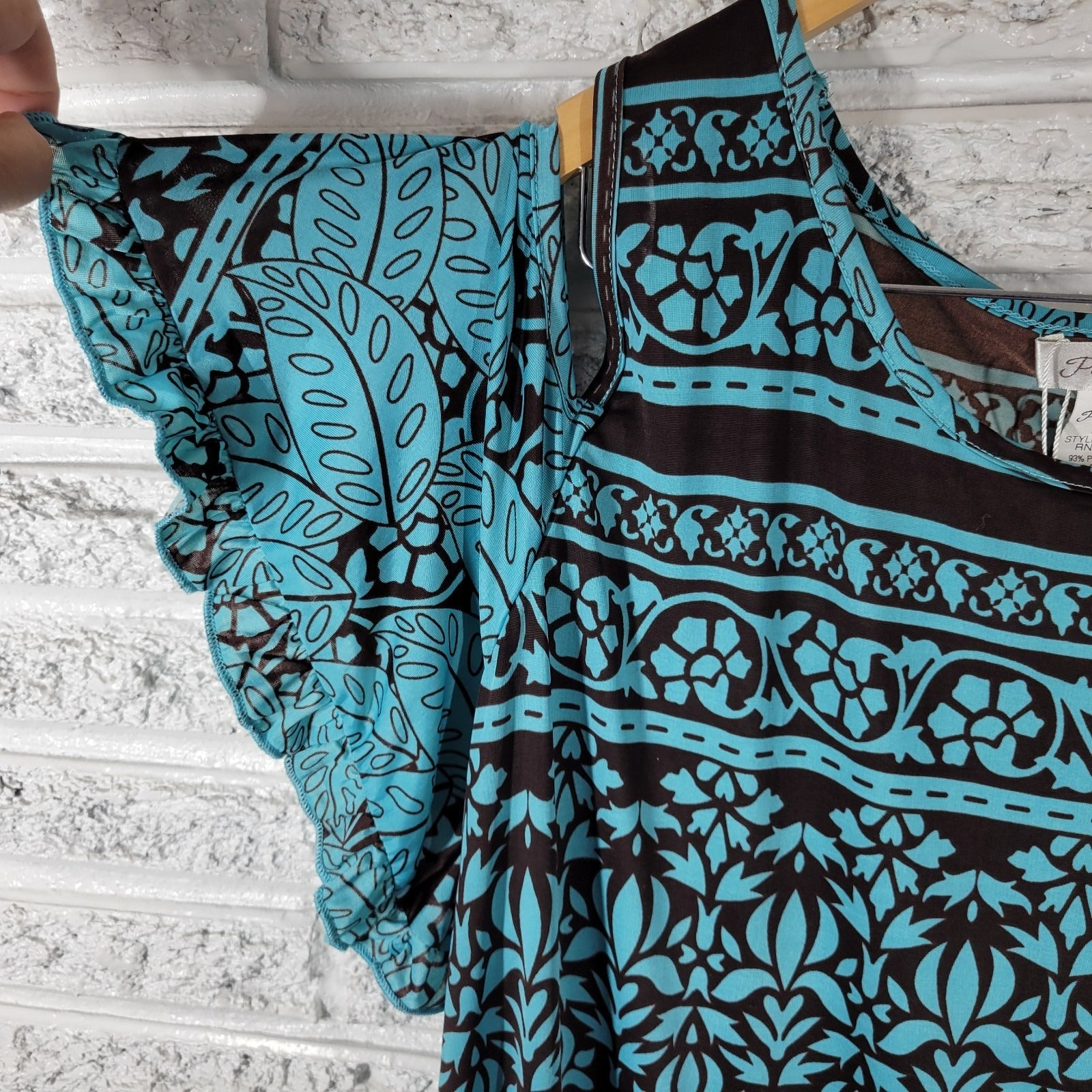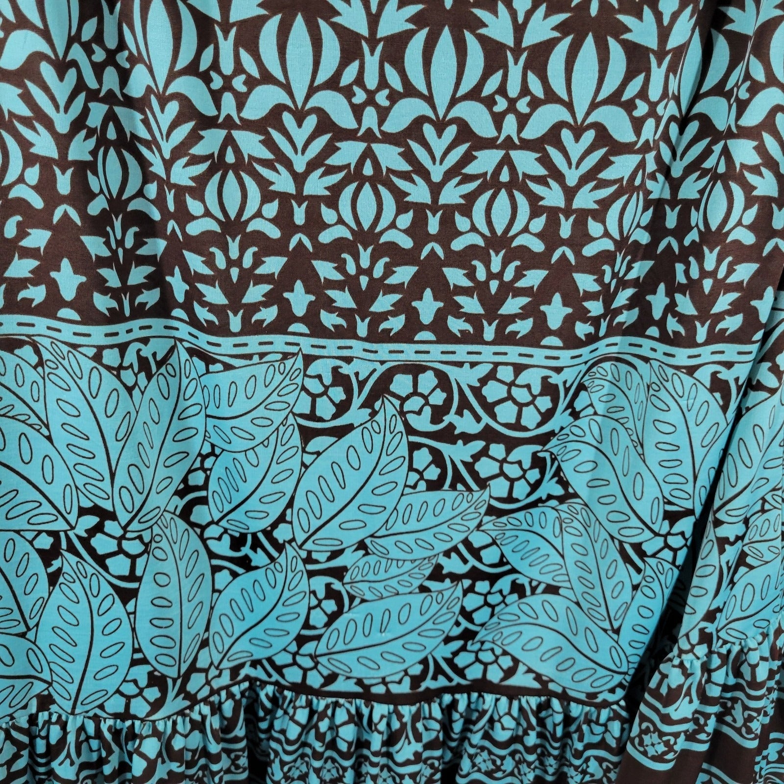 Paisley Vine Women's 2X Plus Blue Brown Geometric Cold Shoulder Ruffle Flutter