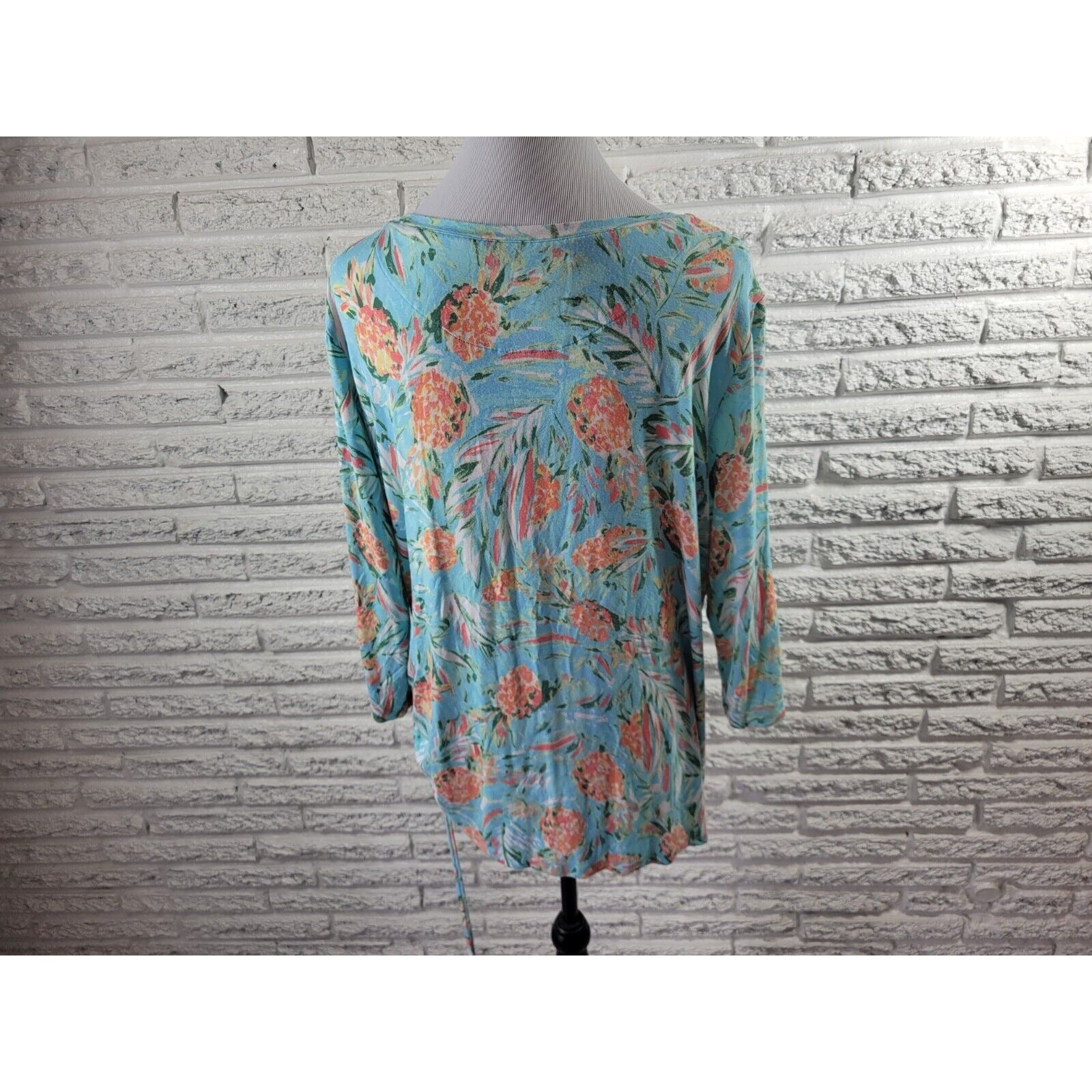 Palm Grove Womens Top 1X Plus 3/4 Sleeve Pullover Blue Floral Rayon Tied Hem