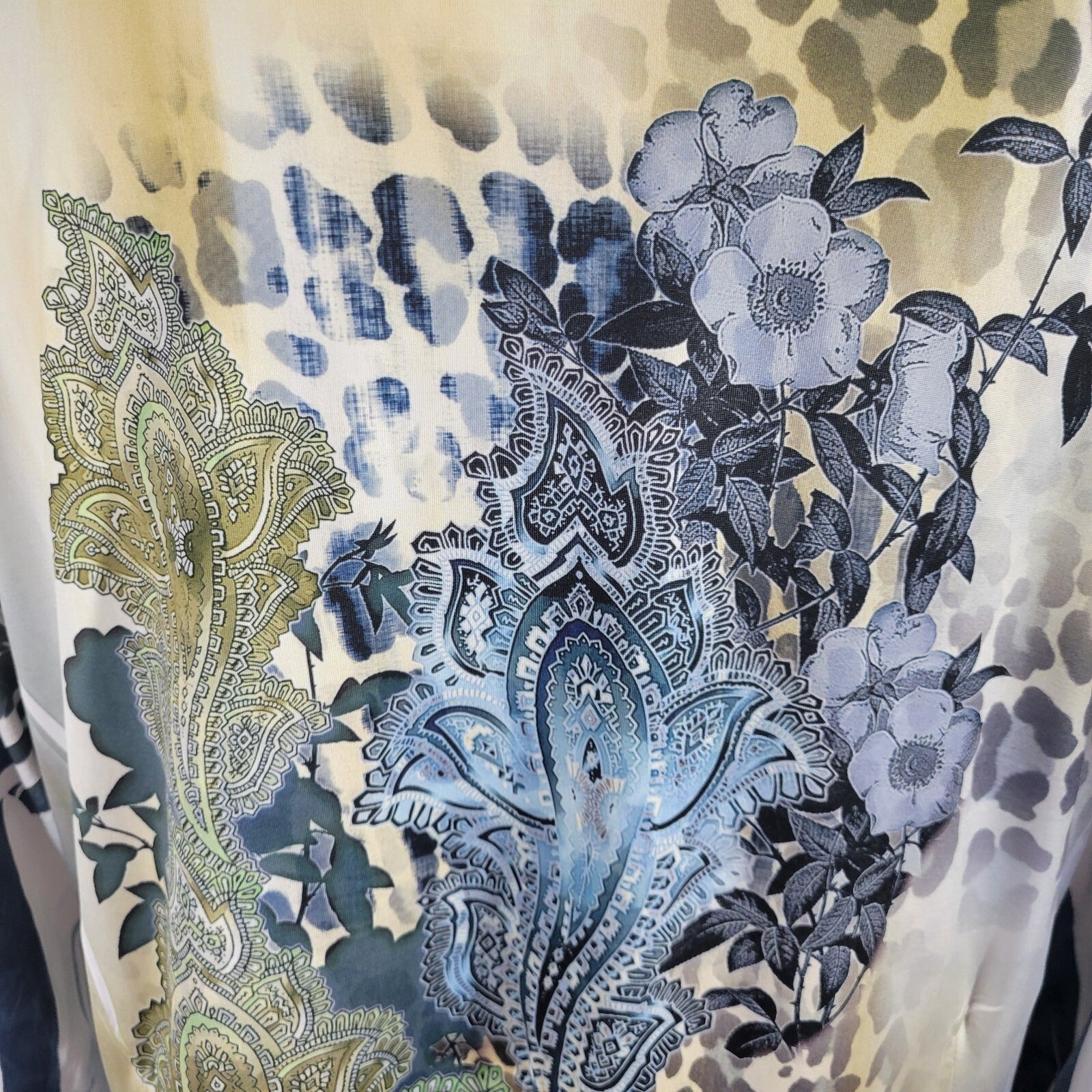 Patchington Womens Top XL 3/4 Sleeve Blue Paisley Laser Cut Hanky Hem Chiffon