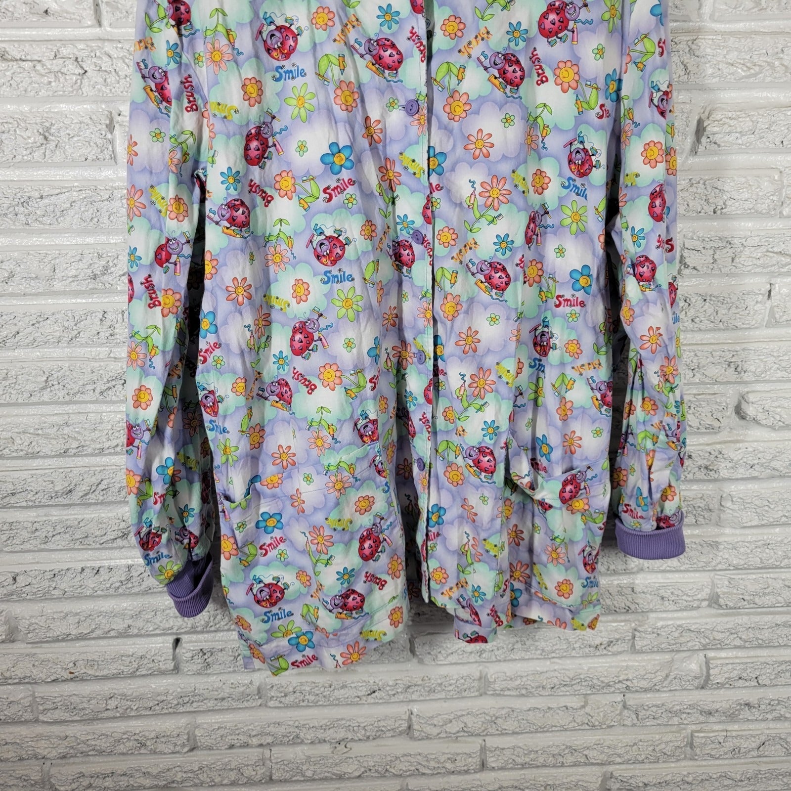 Peaches Unisex Scrub Top 2XL Plus Long Sleeve Button Up Dental Lavender Ladybugs