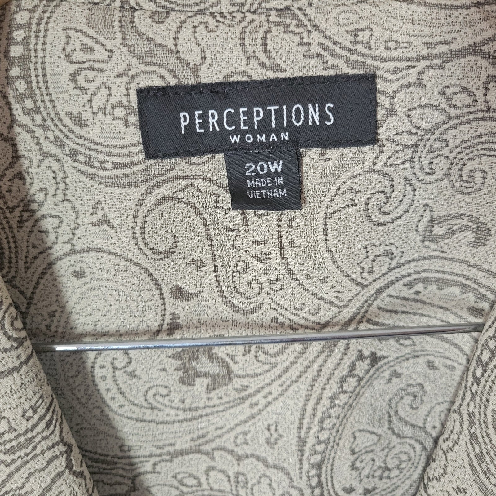 The Perceptions Women's Jacket in size 20W is a stylish beige paisley blazer designed for the office or casual settings. Made from polyester with a button closure and 3/4 sleeves, this blazer features shoulder pads for a classic look. It is machine washable and suitable for all seasons, making it a versatile addition to any woman's wardrobe. The regular fit and plus size make it comfortable and flattering for a range of body types. This blazer is perfect for travel, work, or everyday wear, adding a touch of sophistication to any outfit.