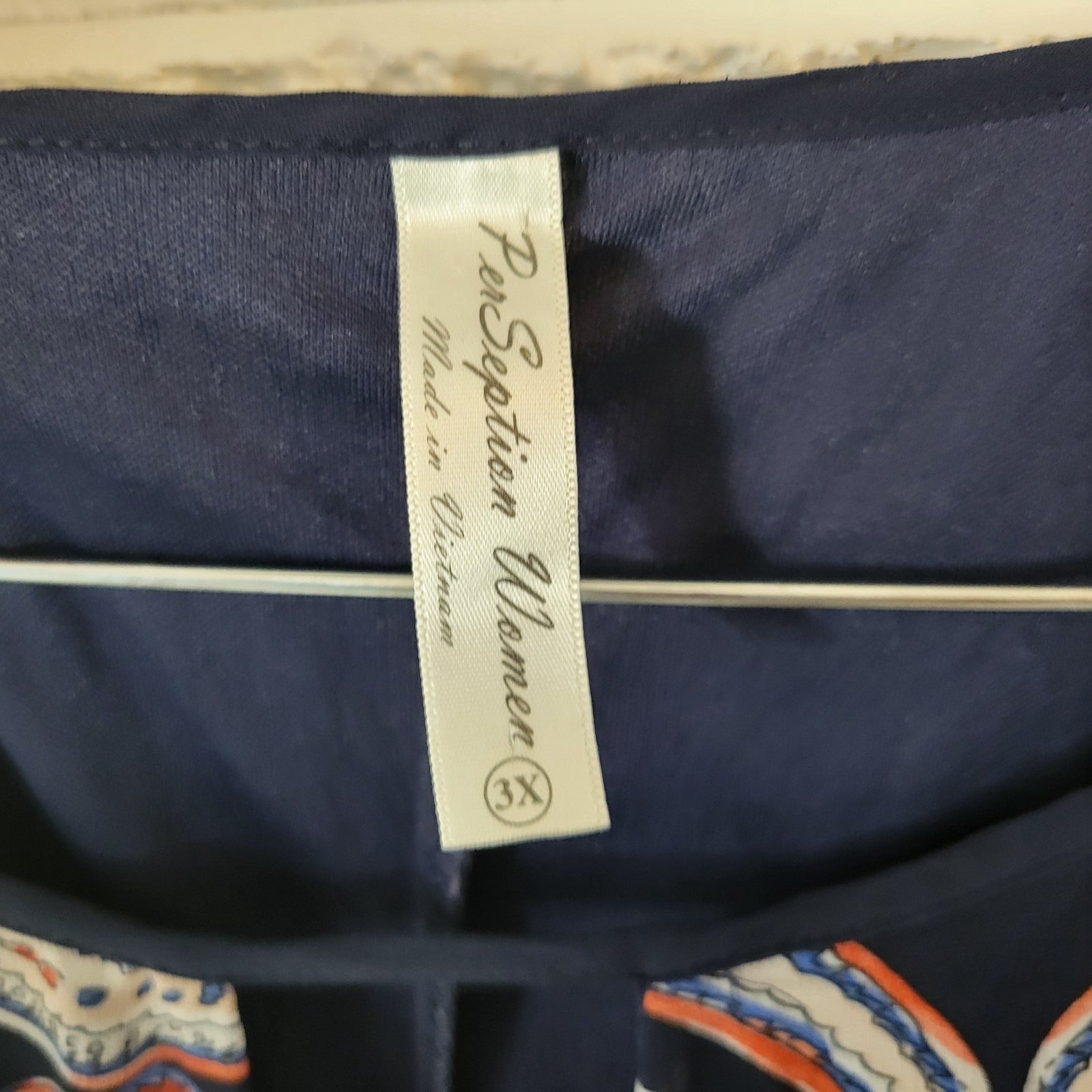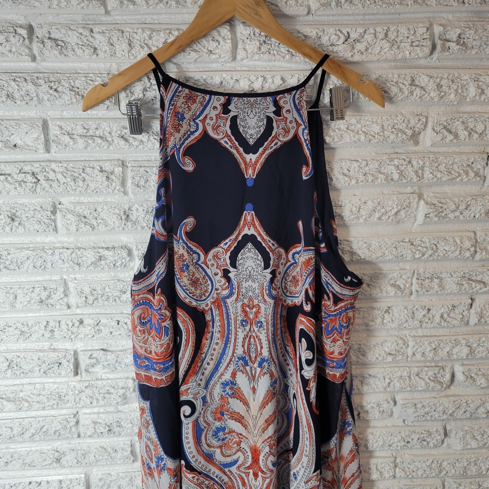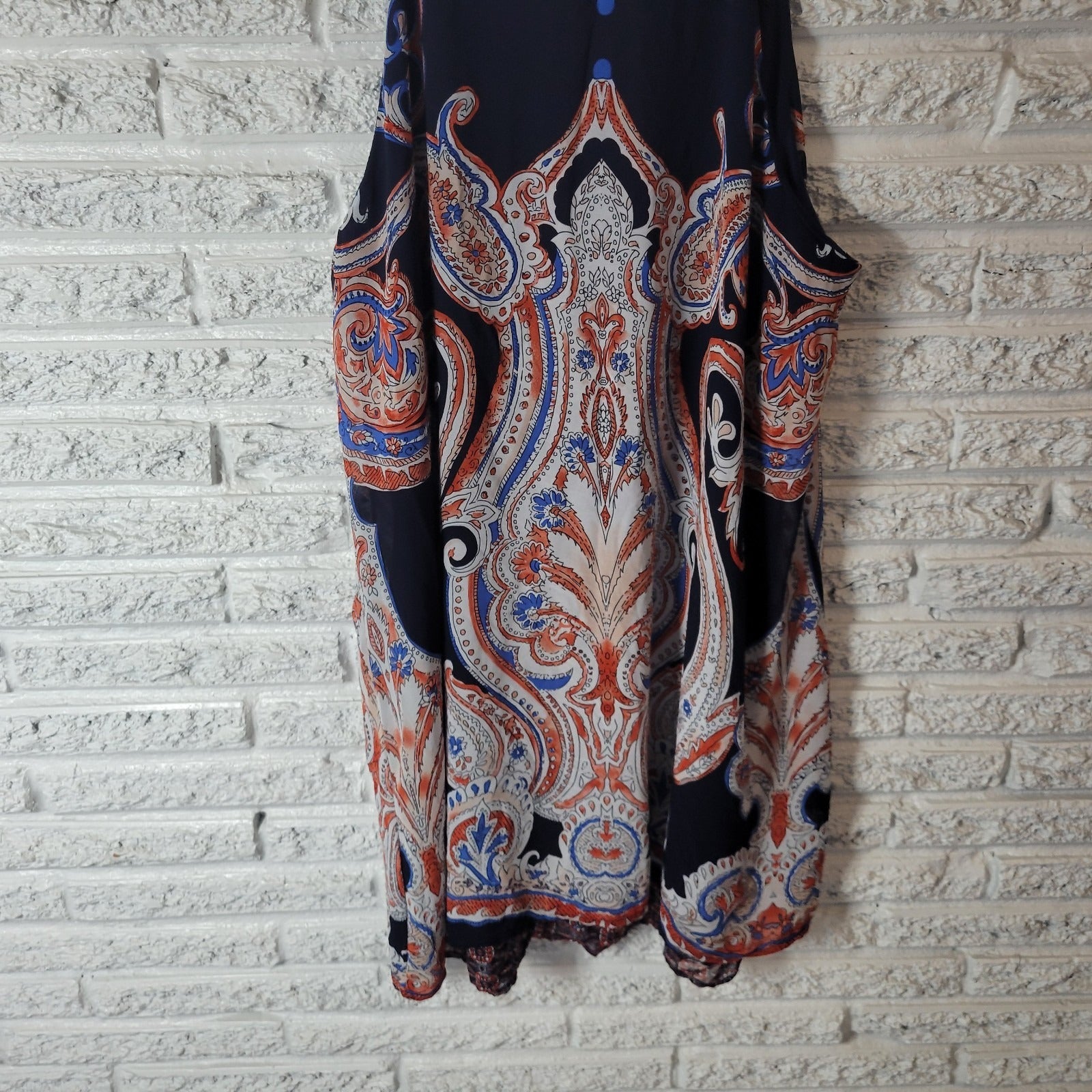 The Perseption Women's Dress in size 3X Plus is a mini slip dress in a blue and red paisley pattern, featuring a keyhole design. This lightweight dress is perfect for casual occasions and can be worn in all seasons. Made from polyester, this sleeveless dress has a pullover closure and a round neckline. Designed by the brand PERSEPTION, this machine washable dress is a stylish and comfortable option for women looking for a trendy and versatile outfit.