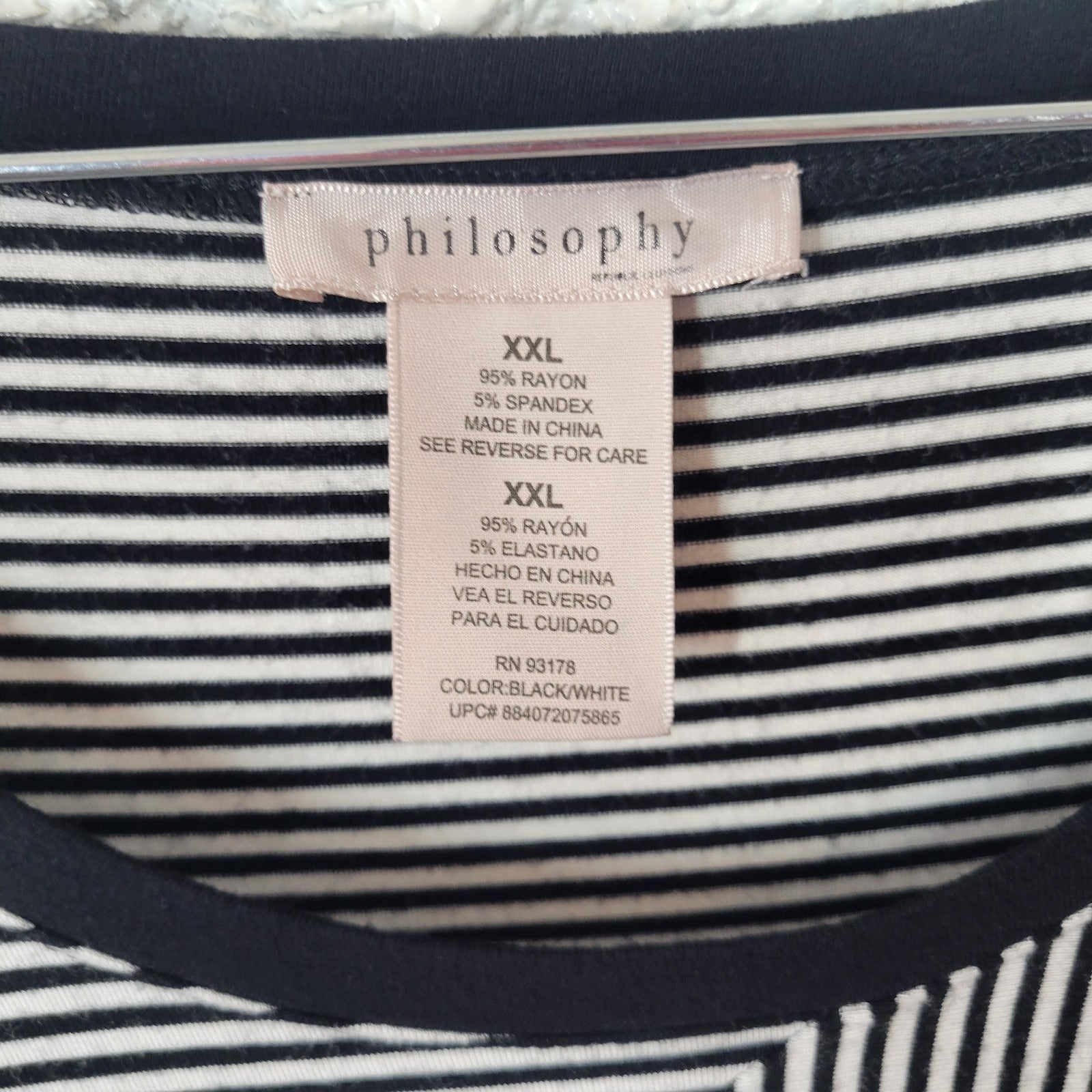 This Philosophy Women's Top in XXL Plus size is a stylish and comfortable tunic featuring a black and white striped pattern, long sleeves, and a round neck. Made from a blend of spandex and rayon, this pullover blouse is perfect for casual occasions and travel, with a regular fit and stretch for all-day comfort. Machine washable and suitable for all seasons, this versatile top from Philosophy is a must-have for any woman's wardrobe.
