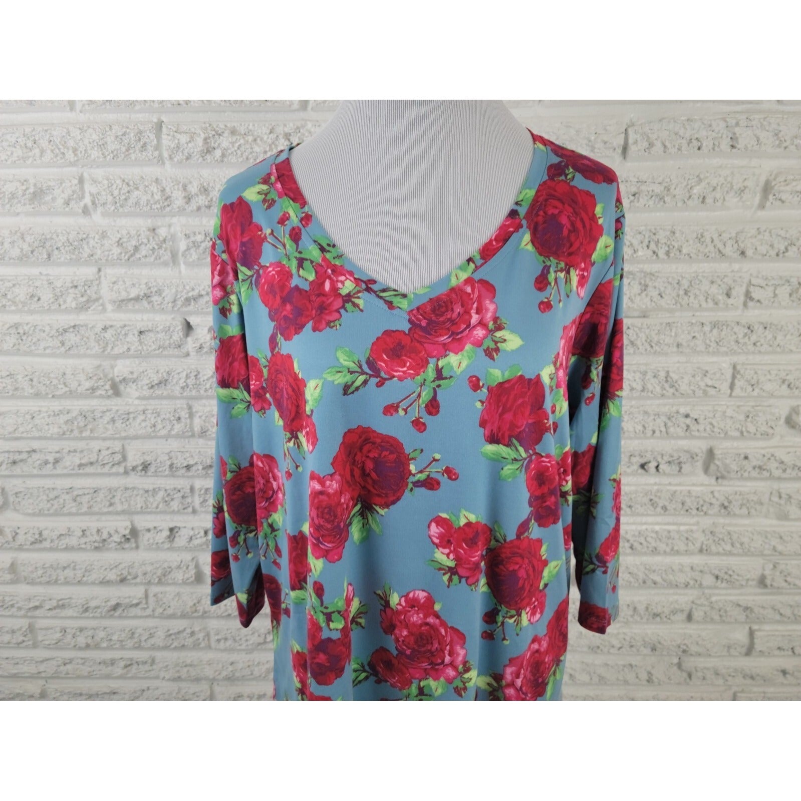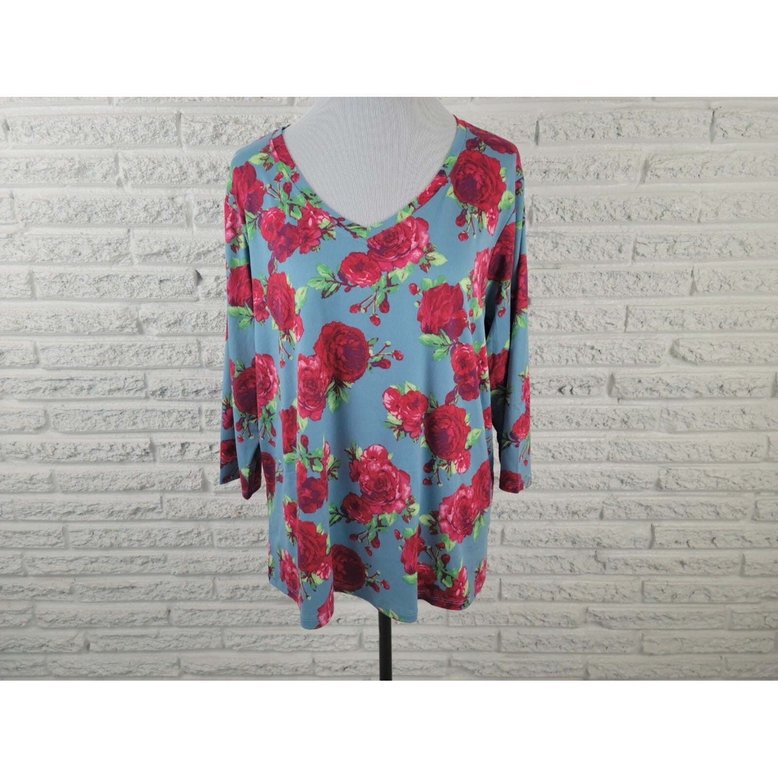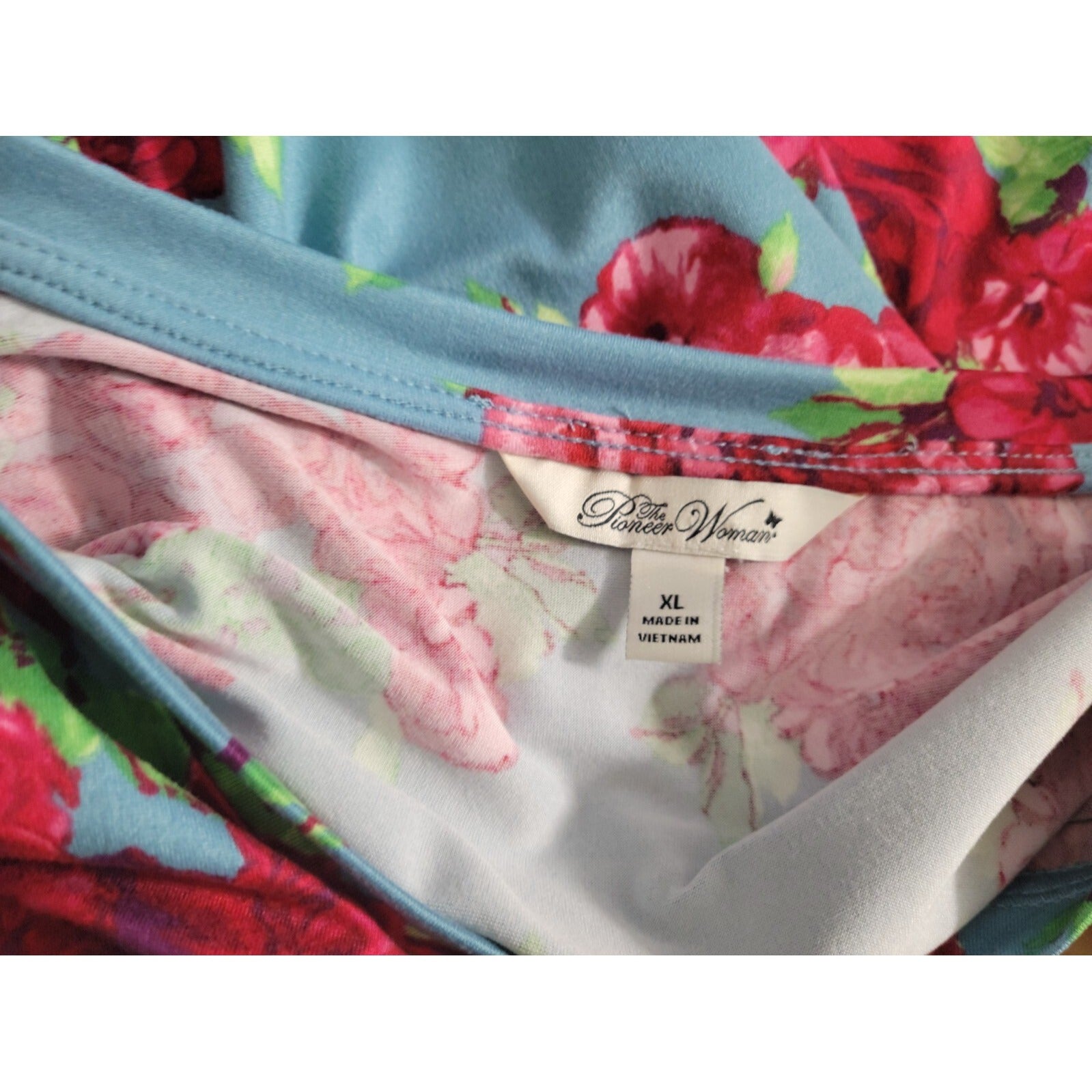 Pioneer Woman Womens Top Extra Large 3/4 Sleeve Blue Red Roses VNeck Casual