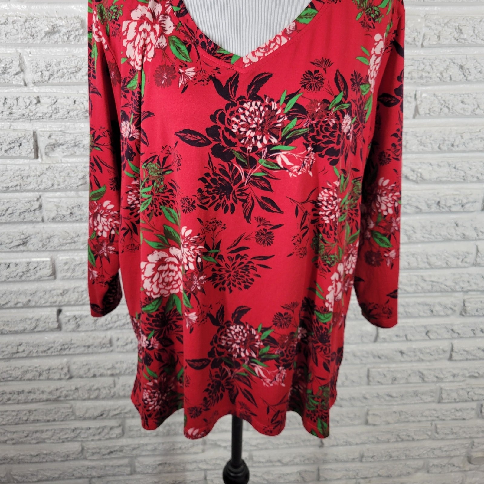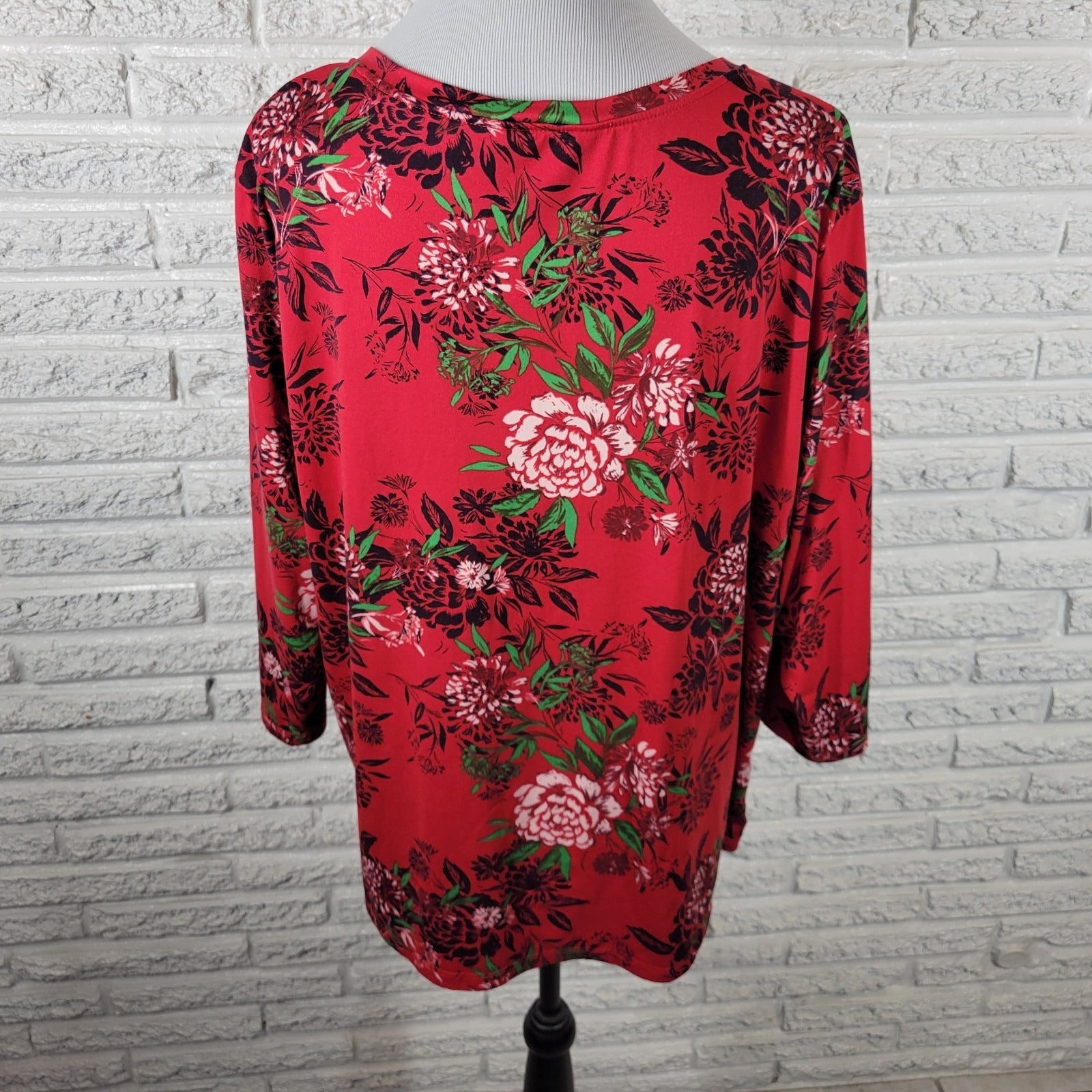 Pioneer Woman Womens Top XXL Plus 3/4 Sleeve Red Black Floral Comfy Poly Blend
