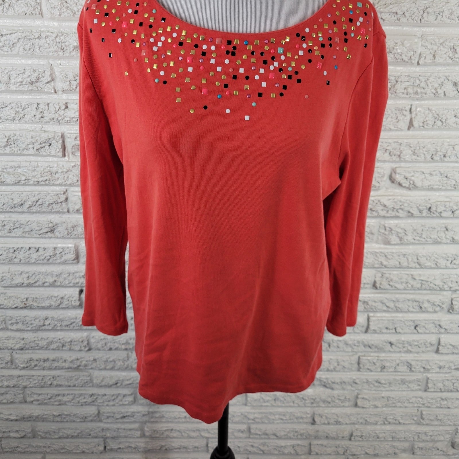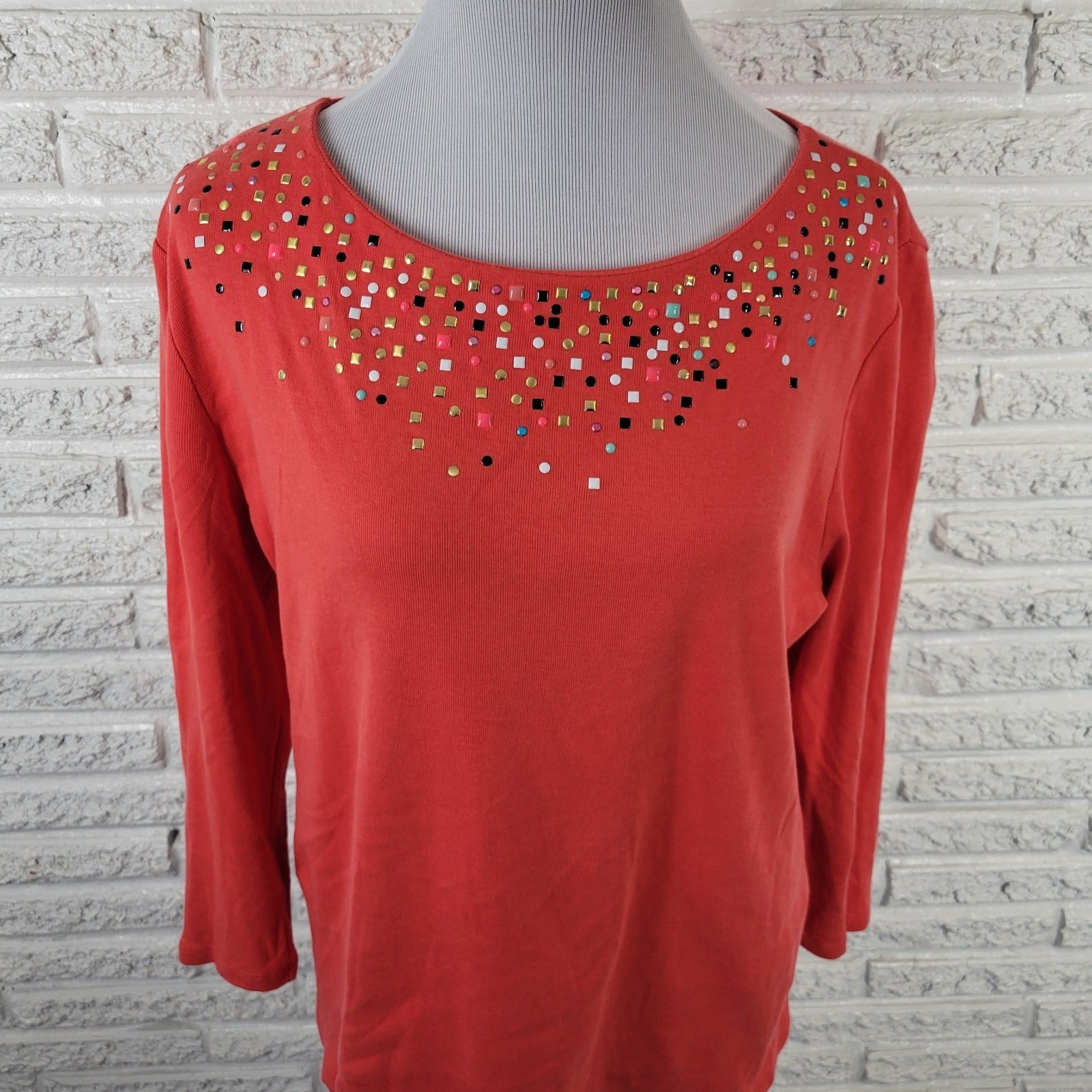 Rafaella Womens Top XL 3/4 Sleeve Red Orange Knit Cotton Studded Casual Comfy