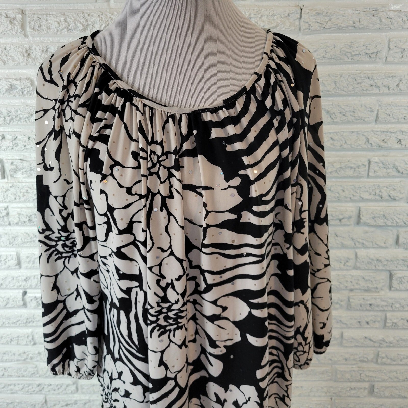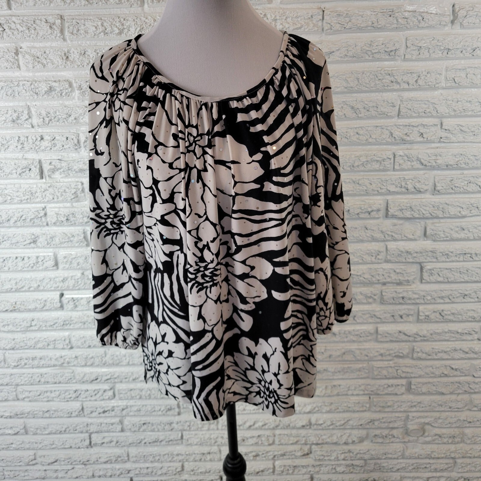 Rebecca Malone Womens Top 1X 3/4 Sleeve Black White Floral Sequins Poly Blend