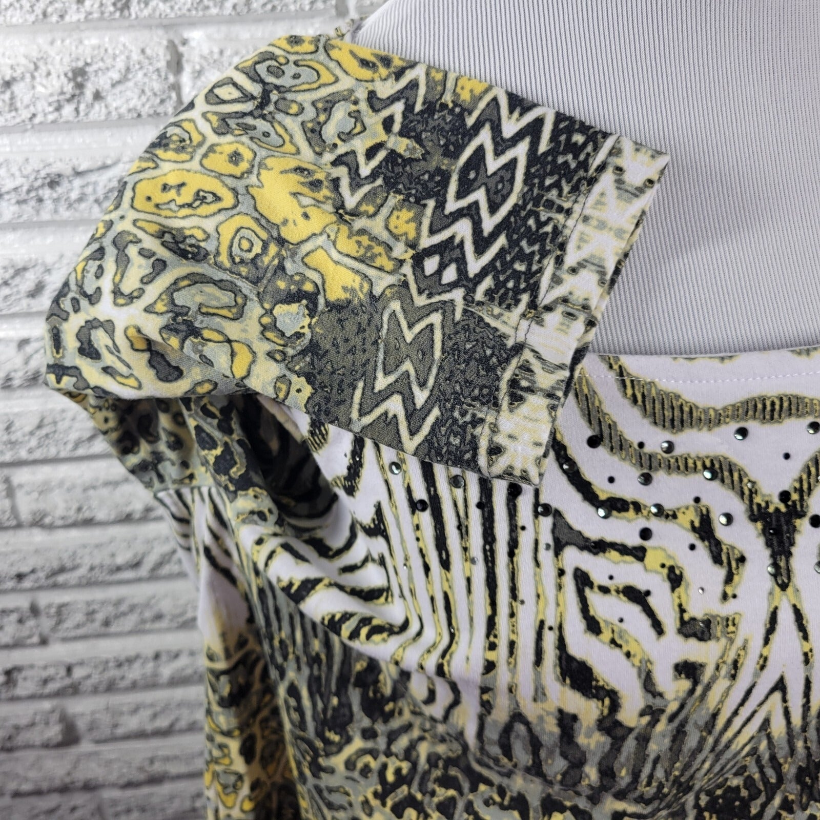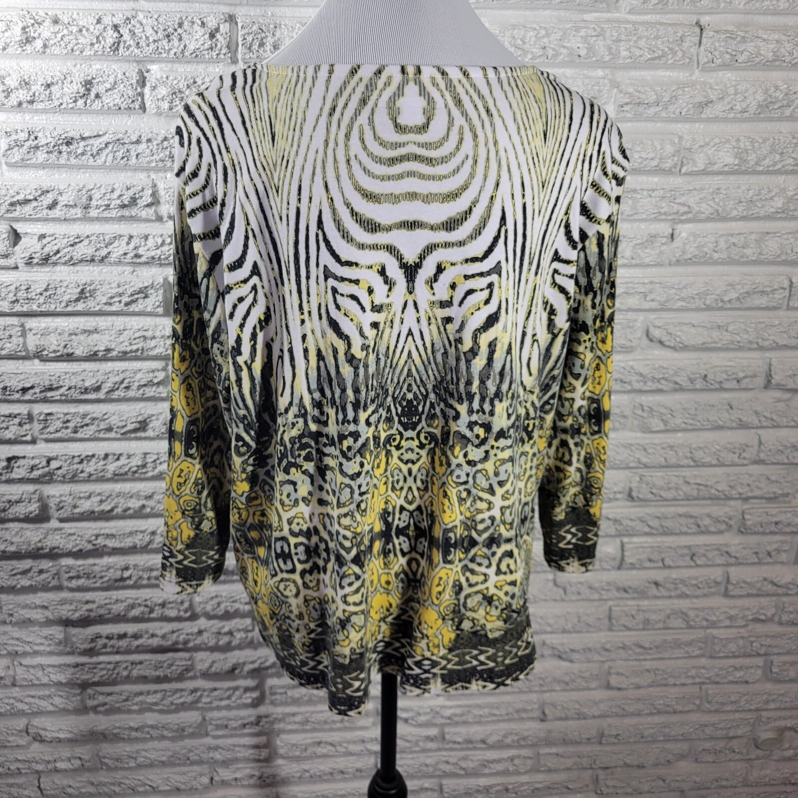 Rebecca Malone Womens Top XL 3/4 Sleeve Rhinestones Yellow Animal Print