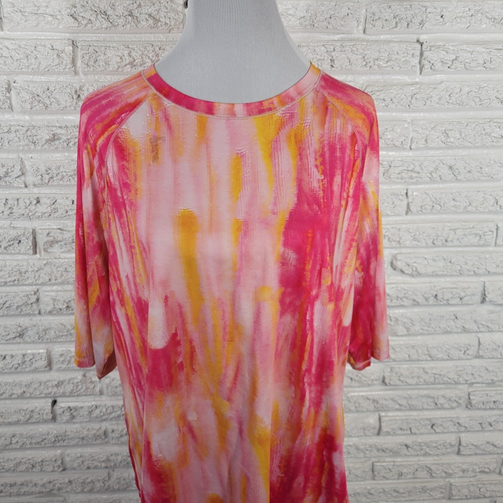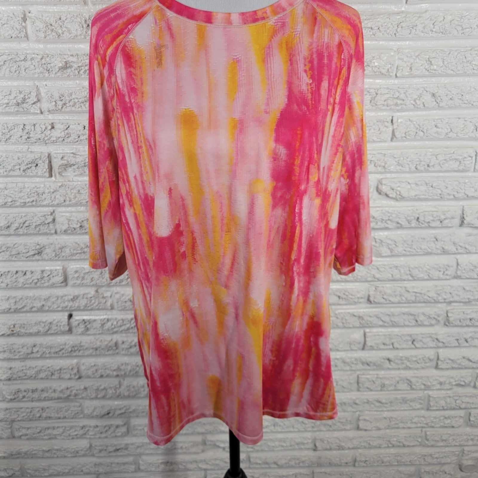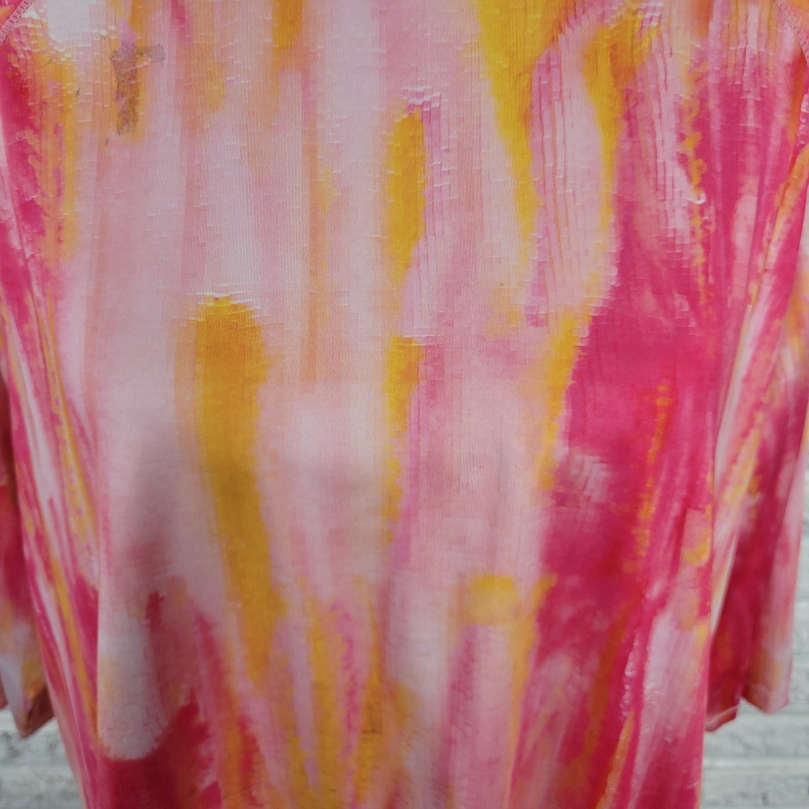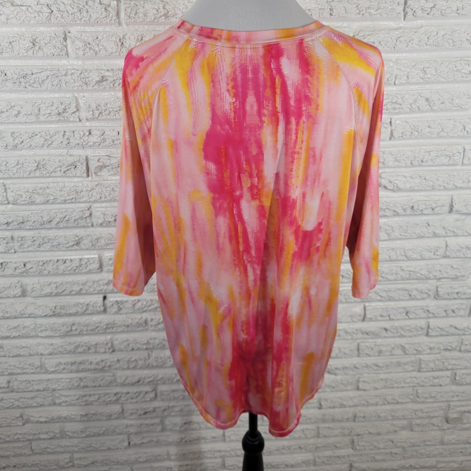 Reel Legends Womens Top 1X Plus Tee 3/4 Sleeve Pink Yellow Watercolor Comfy